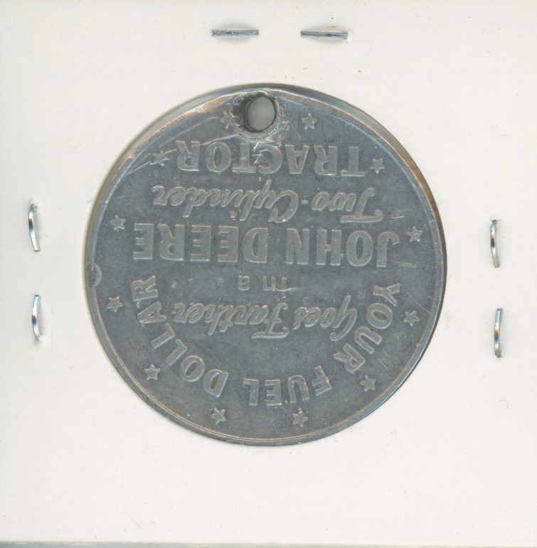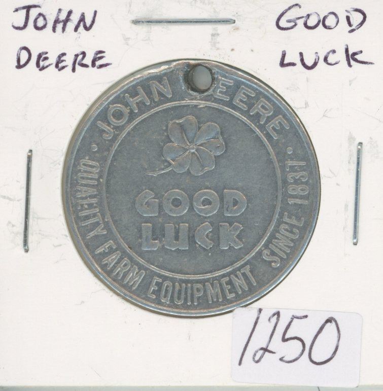 John Deere Good Luck Medal. Your Fuel Dollar Goes Farther in a John Deere Two-Cylinder Tractor. Holed for Suspension.
