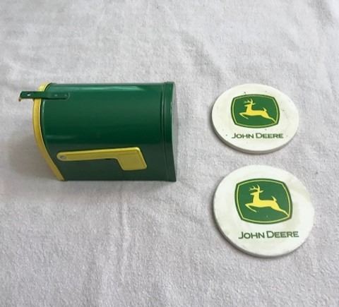 John Deere mailbox piggybank, 3.25” (8.5 cm) x 5.25” (13.5 cm), works well + 2 John Deere coasters.