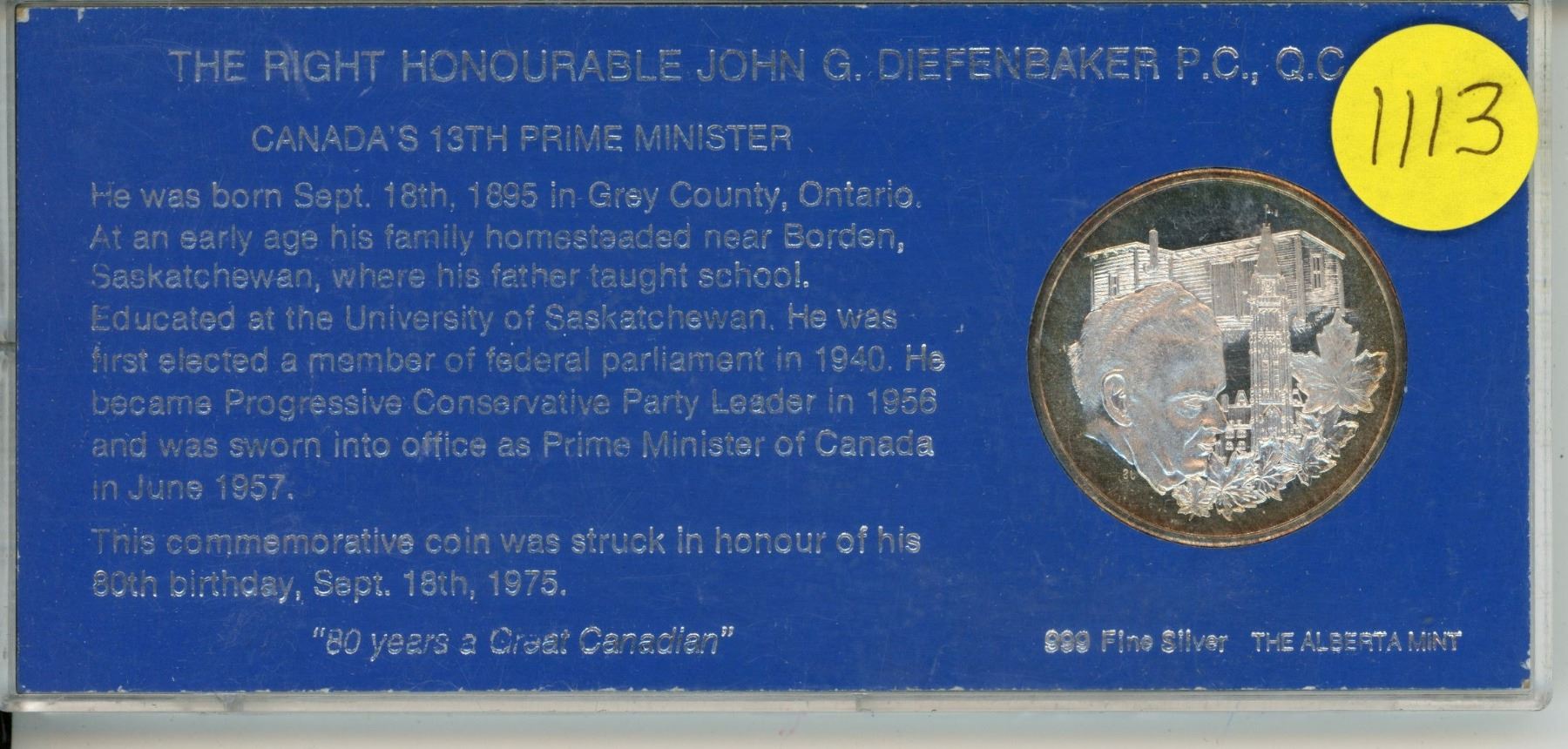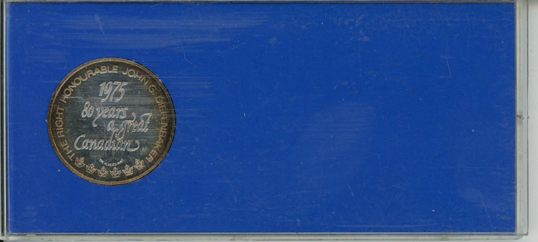 John G. Diefenbaker 99.9 Silver Medal. Canada’s 13th Prime Minister who represented Prince Albert, Saskatchewan. Struck on his 80th Birthday in 1975. Housed in a hard plastic holder. BU.