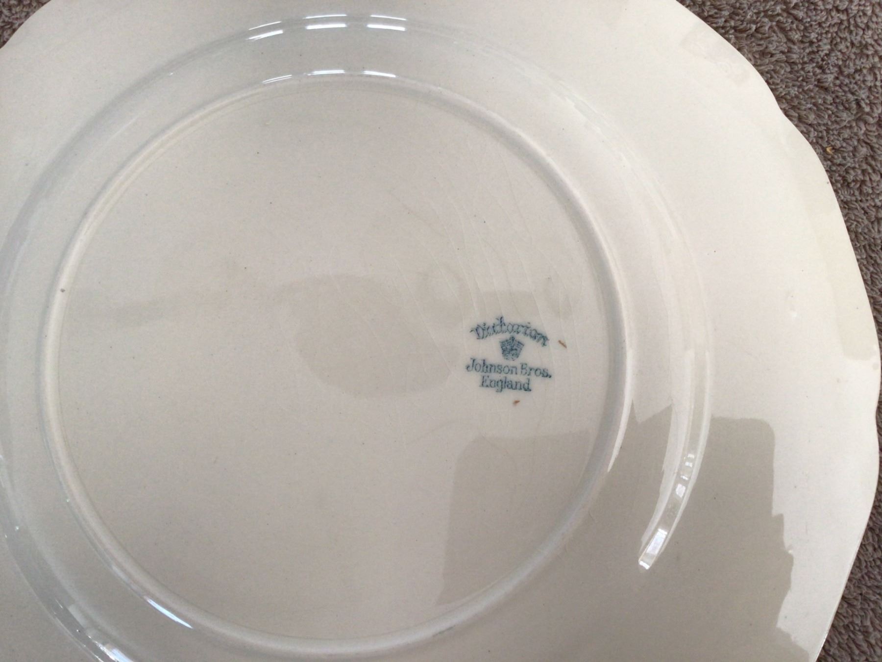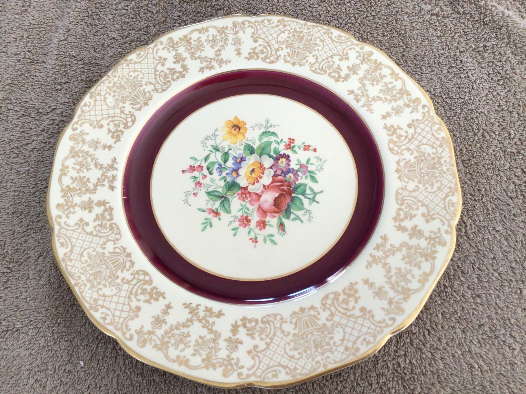 Johnson Brothers Pareek dinner plate, 10.5". Floral, dark red ring, gold rimmed.