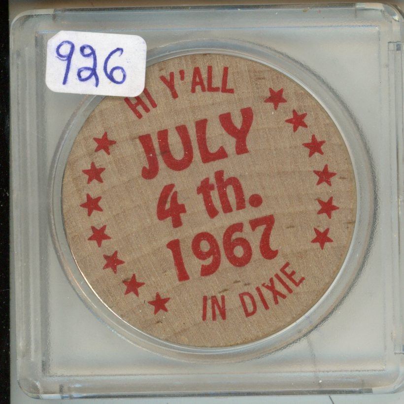 July 4, 1967 U.S. Wooden Nickel. Hi Y-All in Dixie.