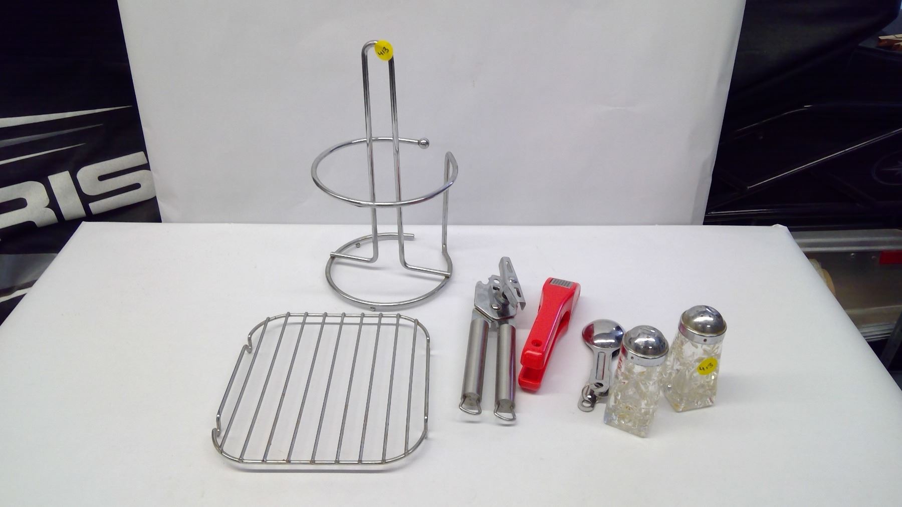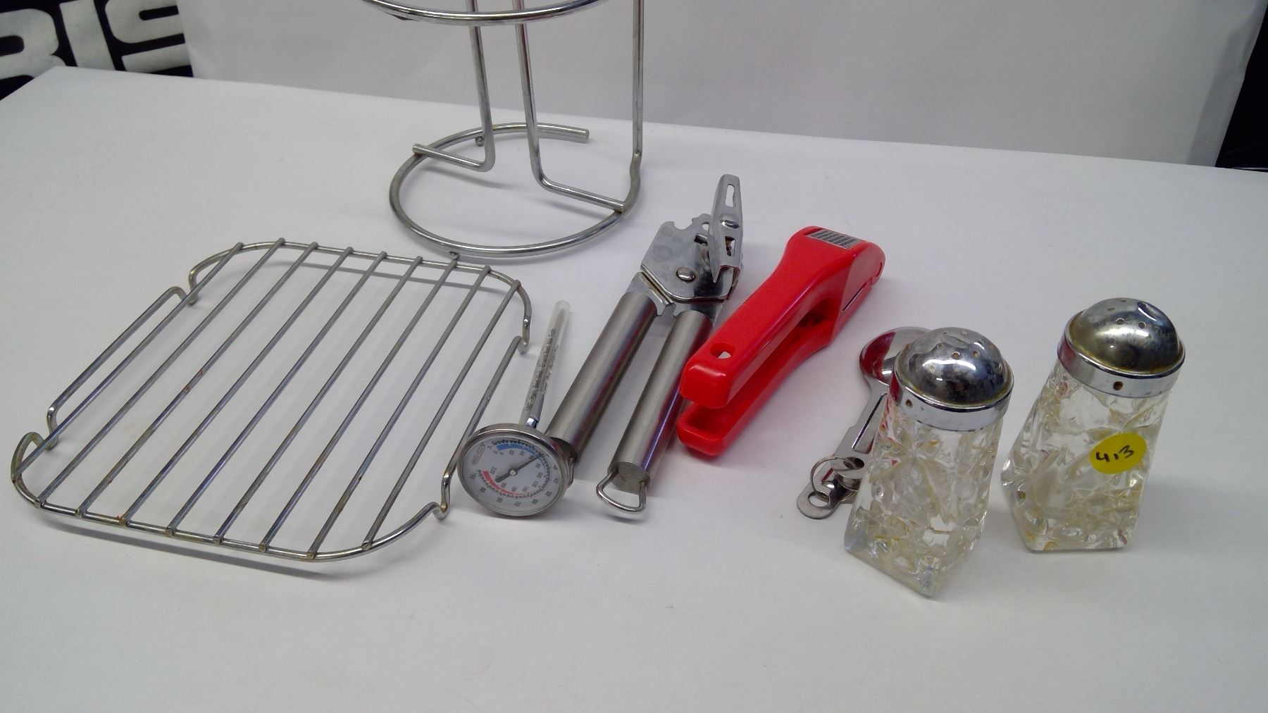 cooling rack, salt and pepper shakers, roasting thermometer, can opener, measuring spoons and garlic press