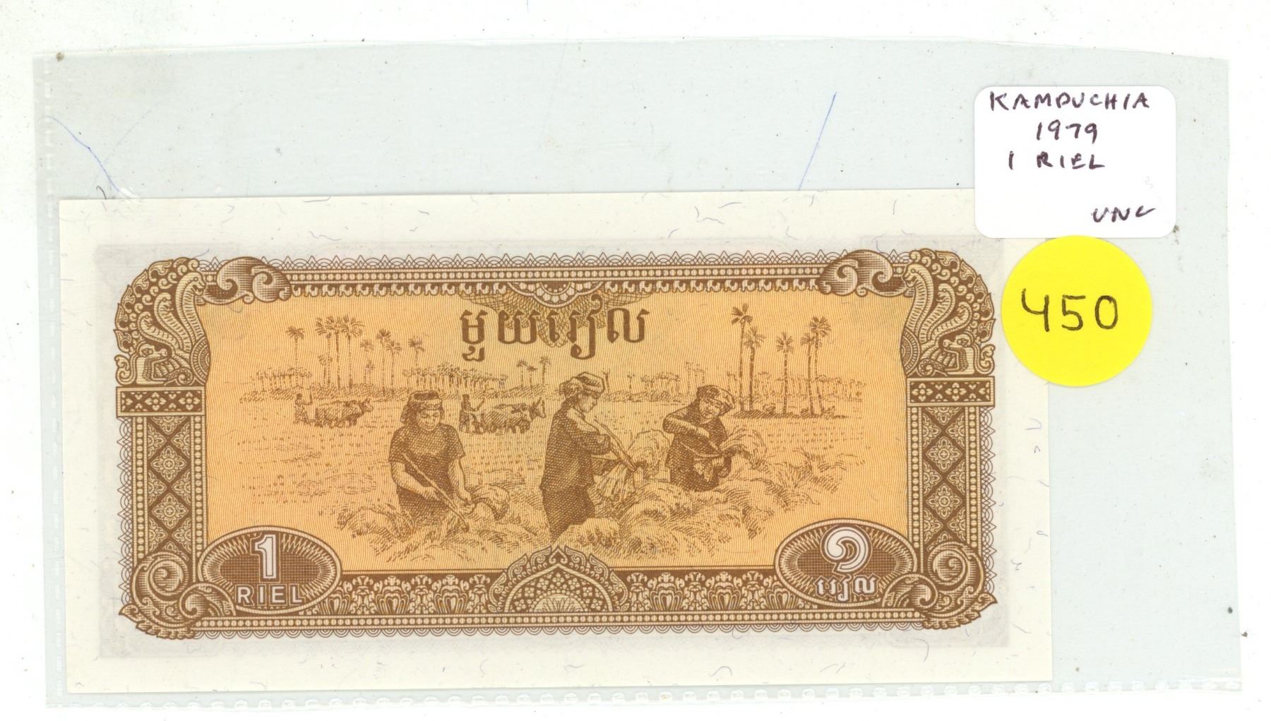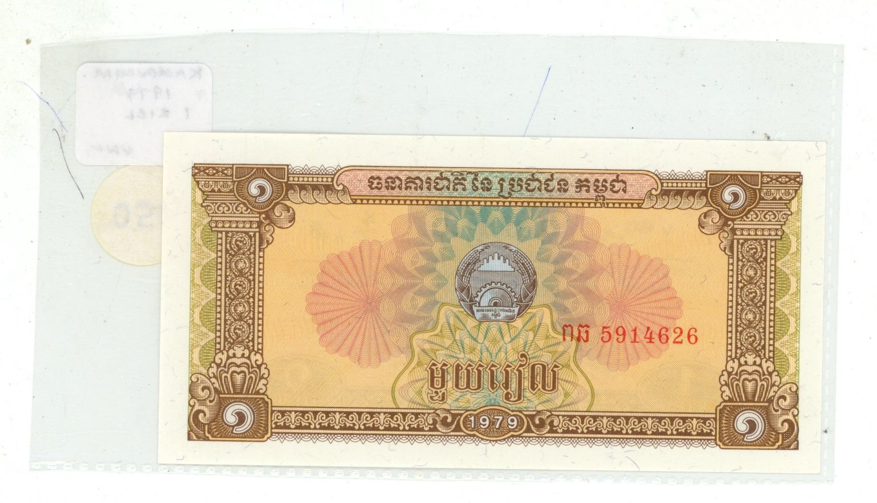 Kampuchea. 1979 1 Riel. Issued by the Vietnamese after they overthrew Pol Pot. Uncirculated.