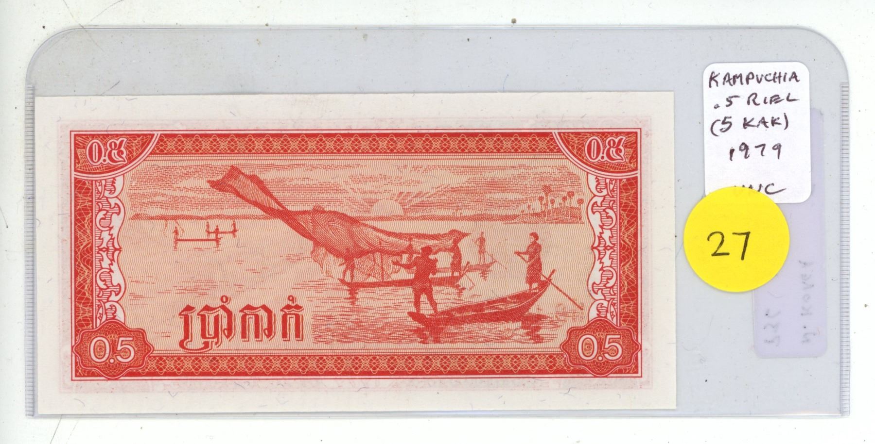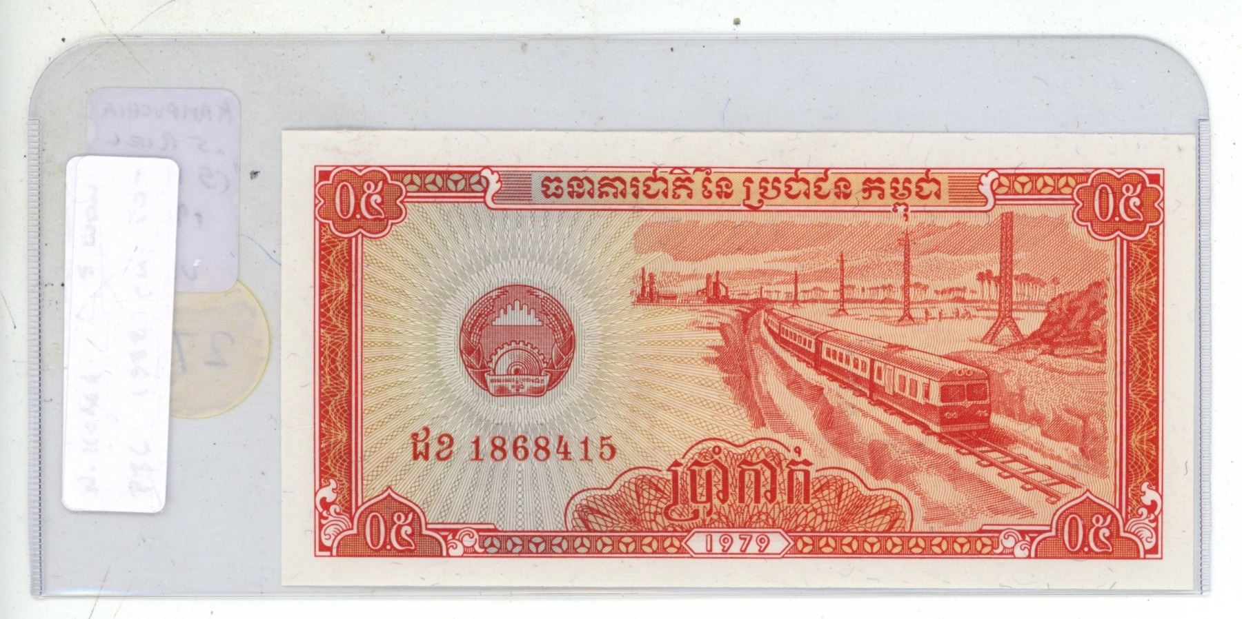 Kampuchea. 1979 .5 Riel (5 Kak). Issued by the Vietnamese-backed regime that replaced Pol Pot. Uncirculated.
