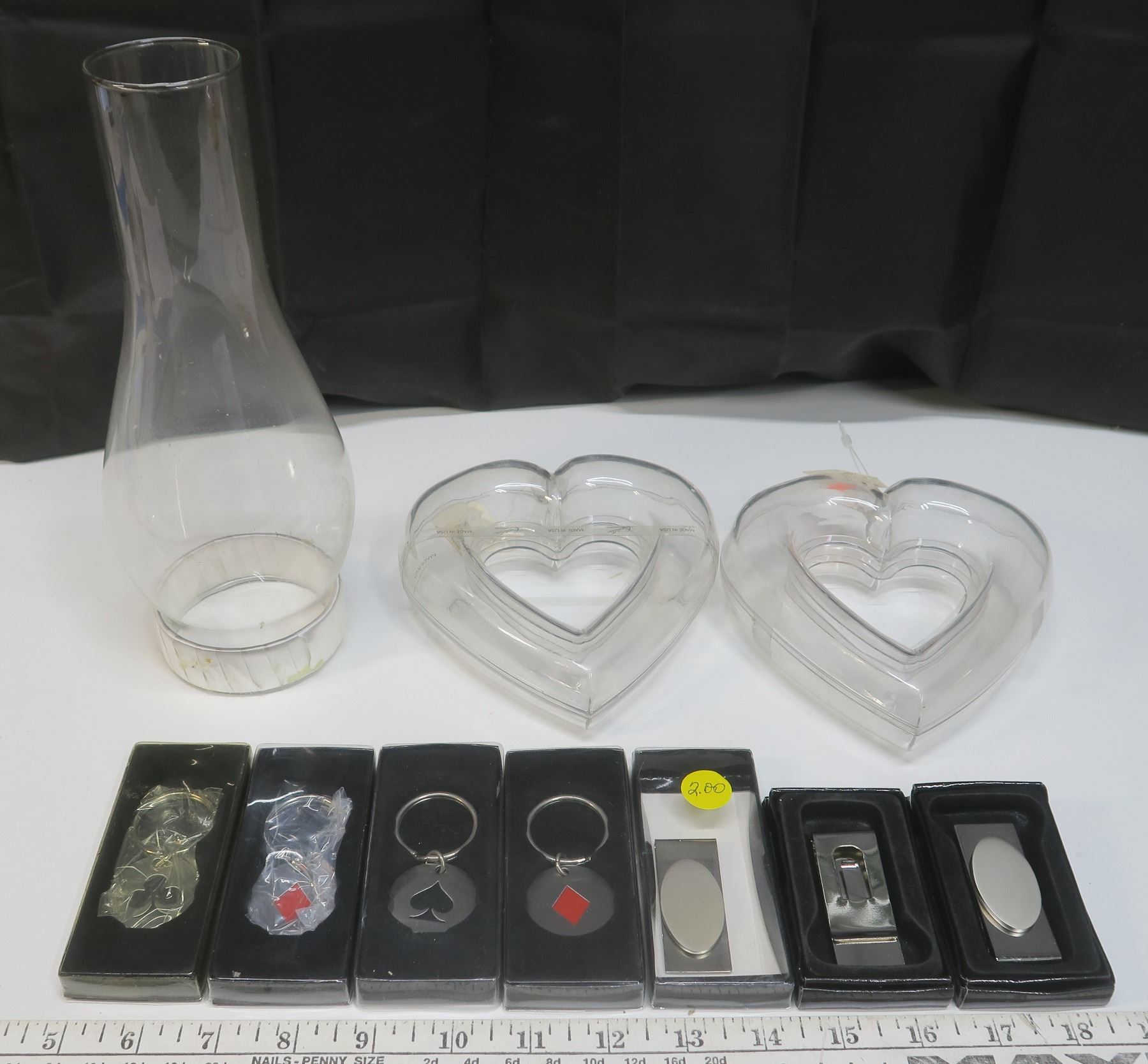 Kerosene lamp glass chimney + Key chains + 2 clear hollow plastic hearts
