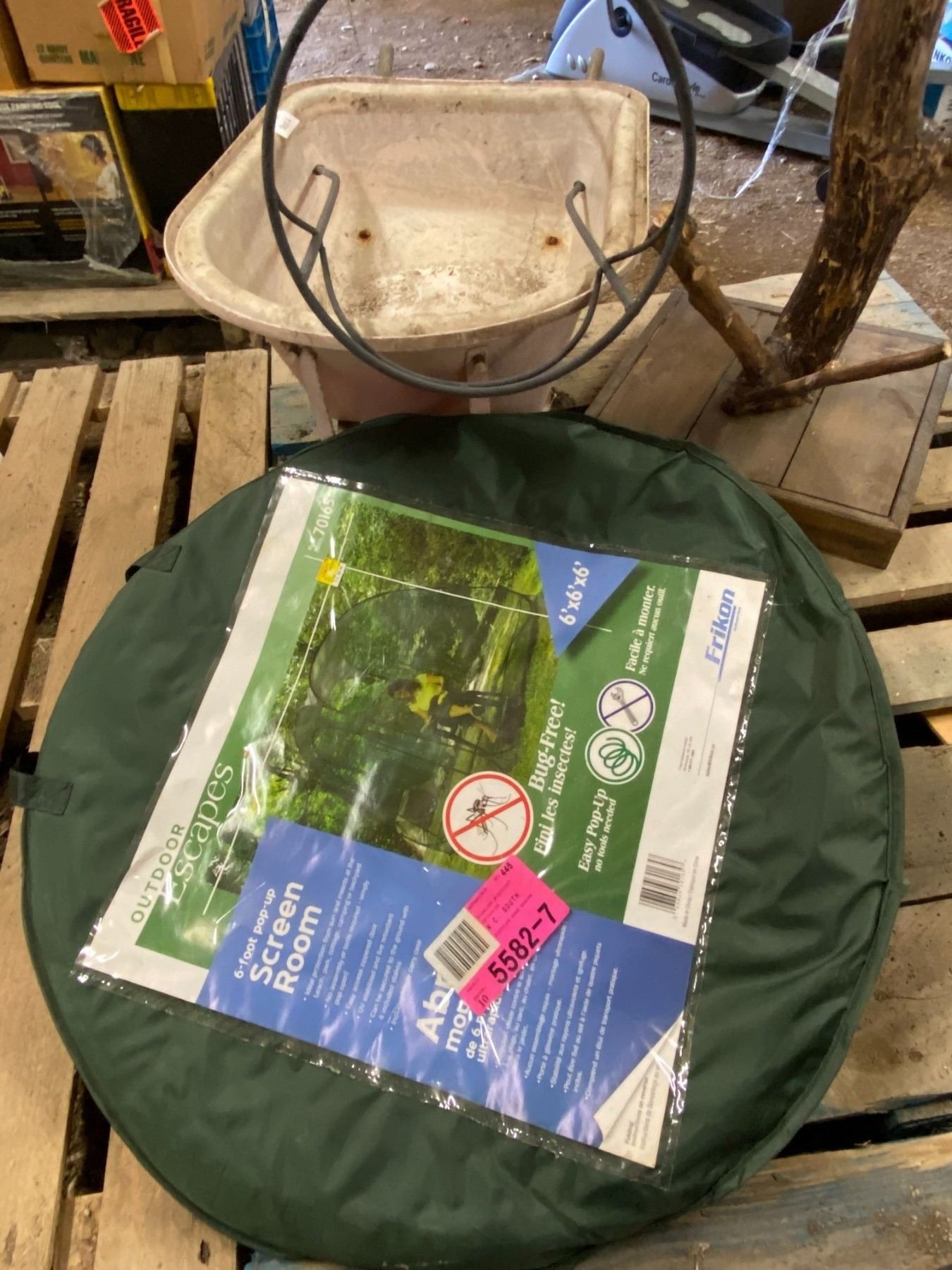 Kid's Wheel Barrel 15" tall, 20" Metal Flower Pot Stand, Pop Up Screen House