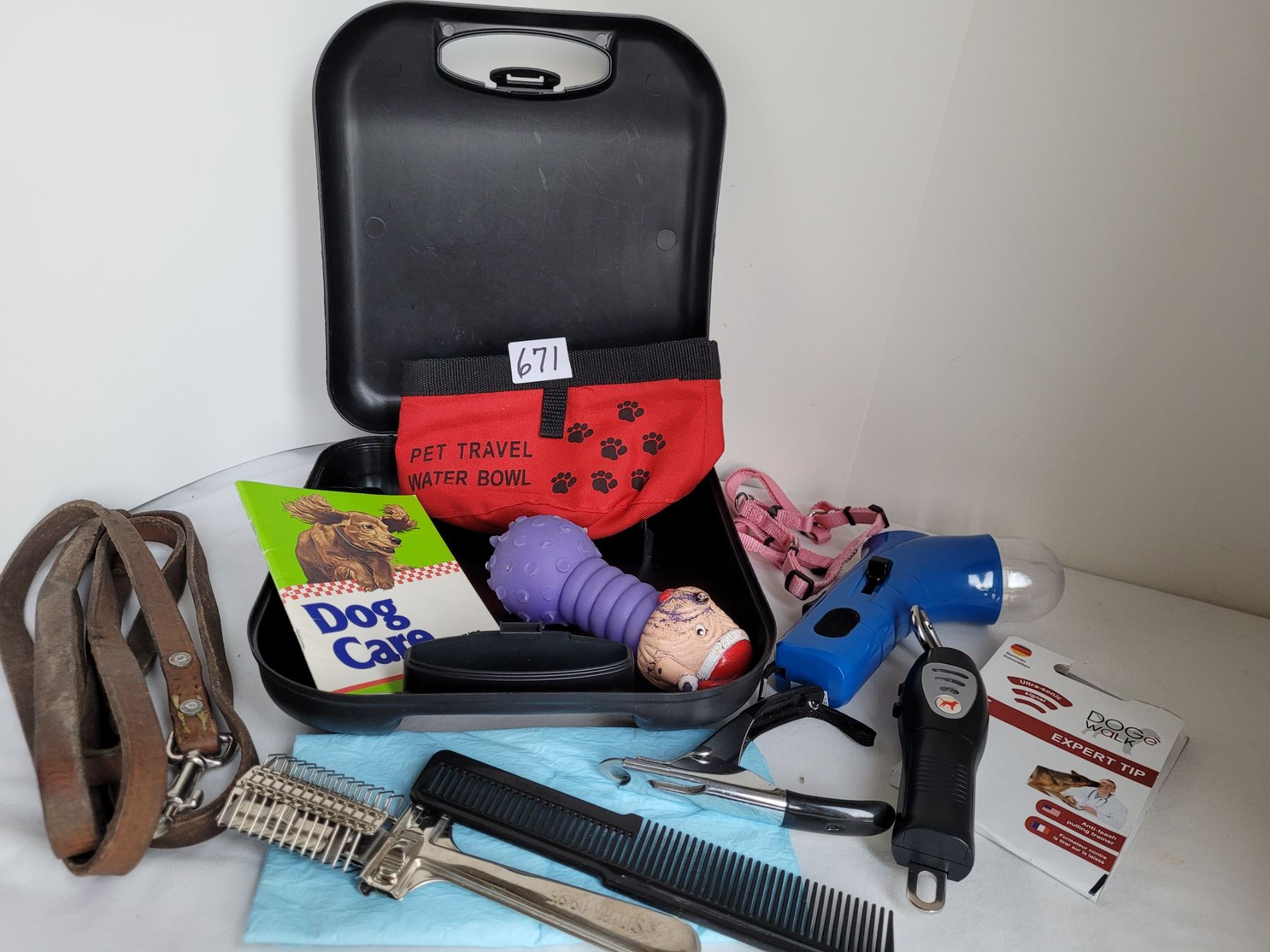 Kit with travel water dish, treat shooter, nail clippers, no pulling training devise & other products.
