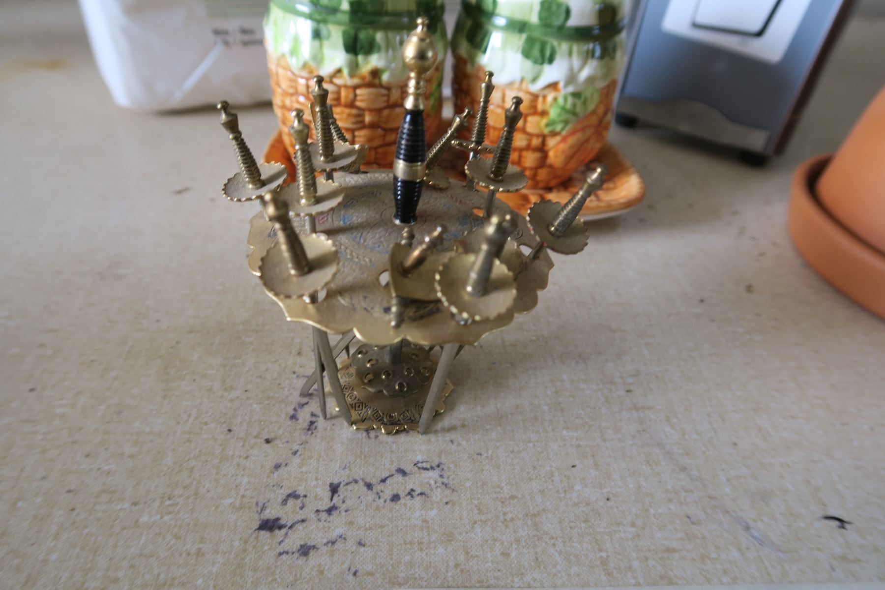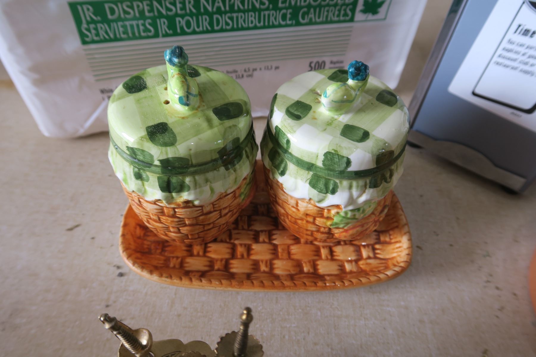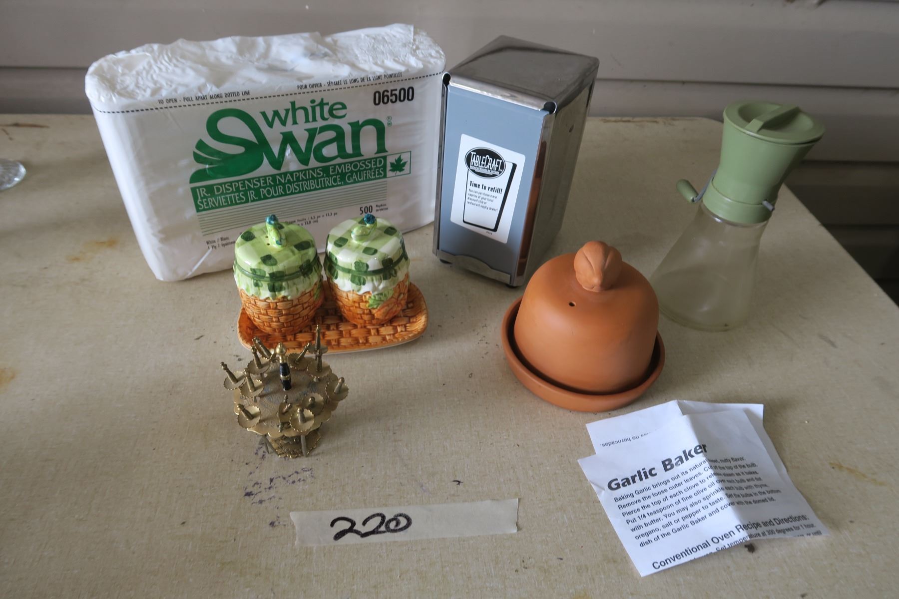 Kitchen Items - Salt/Pepper Shaker, Napkin Dispenser, Garlic Baker, Metal Cocktail Swords, Dressing Bottle