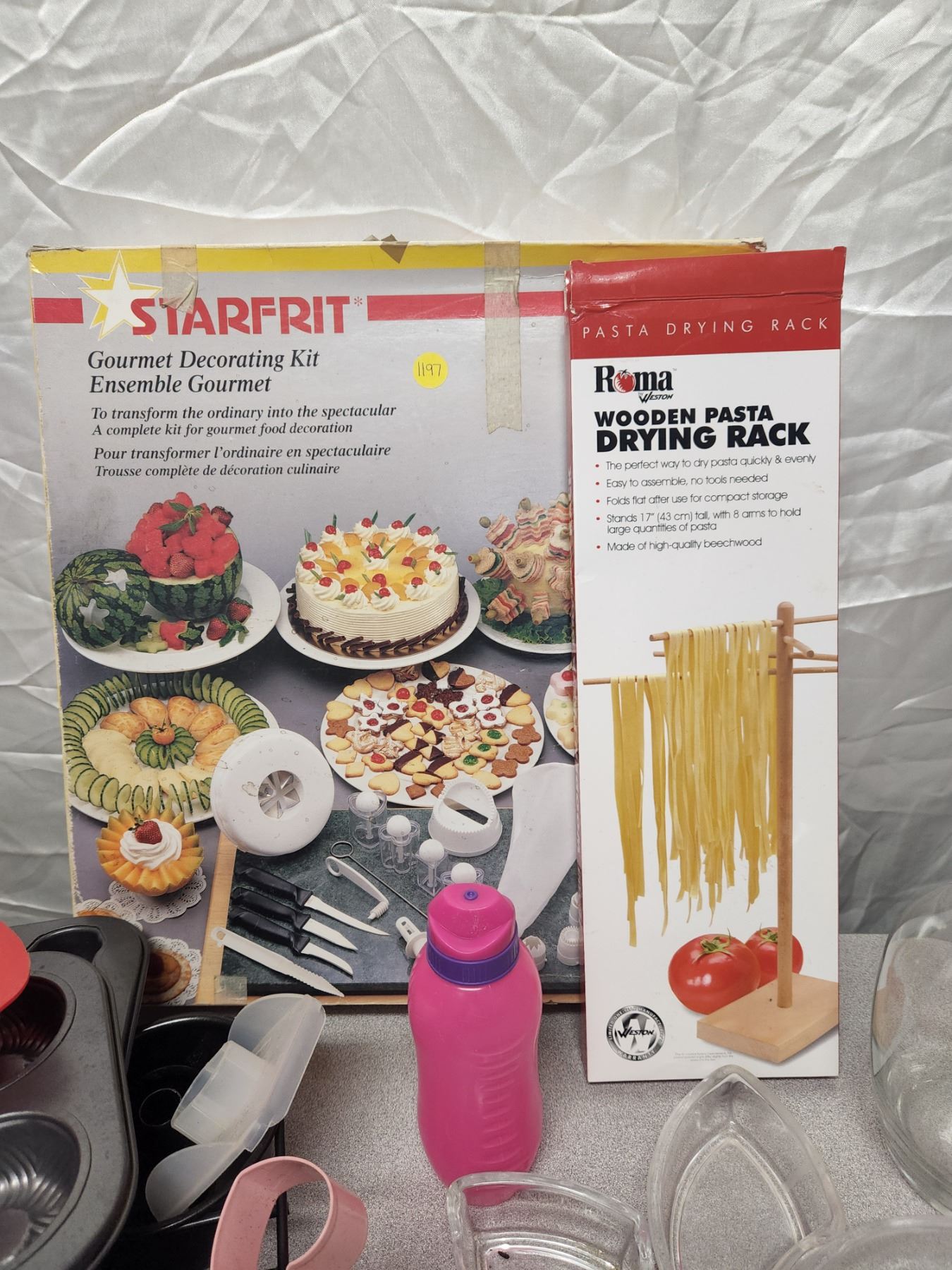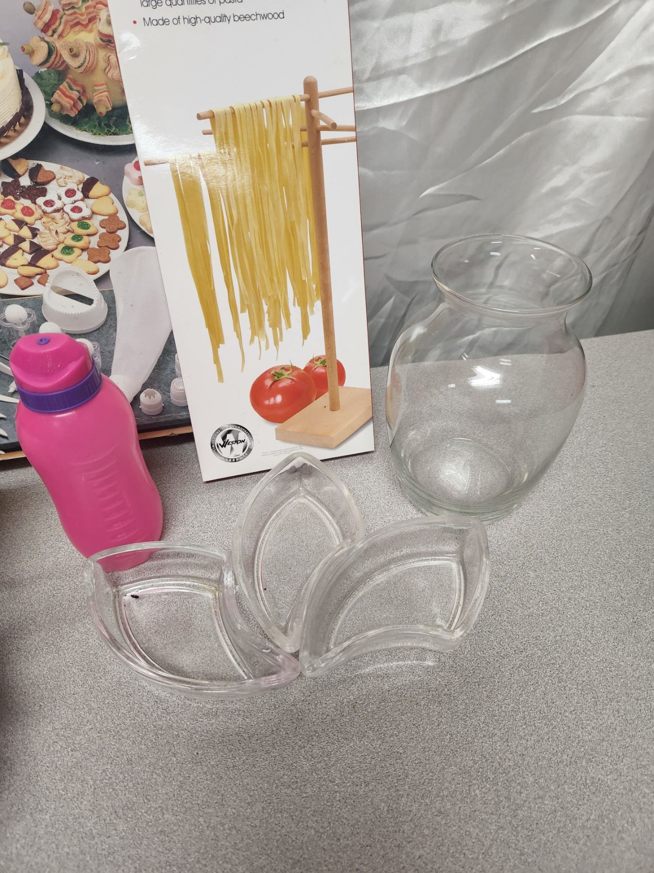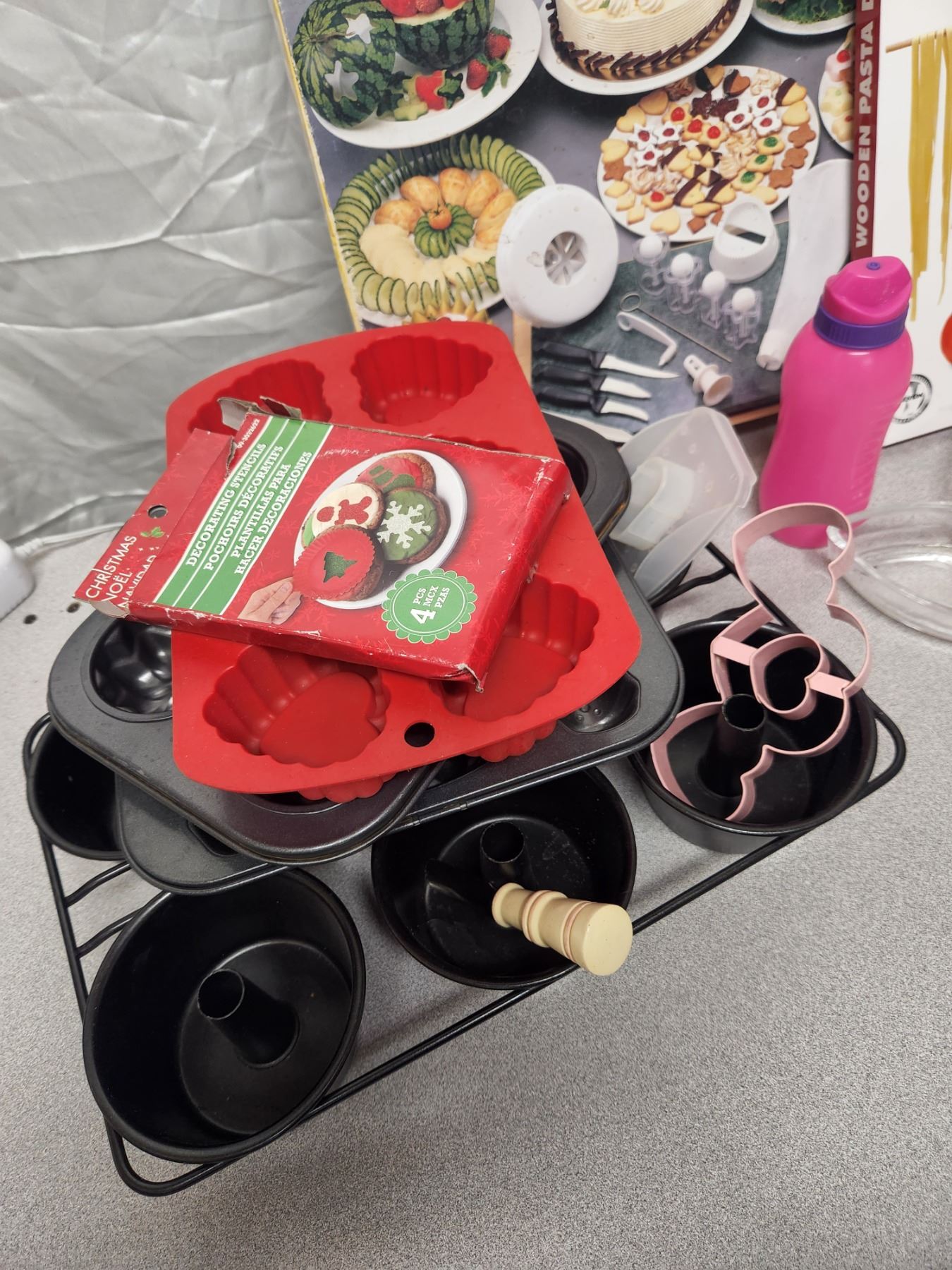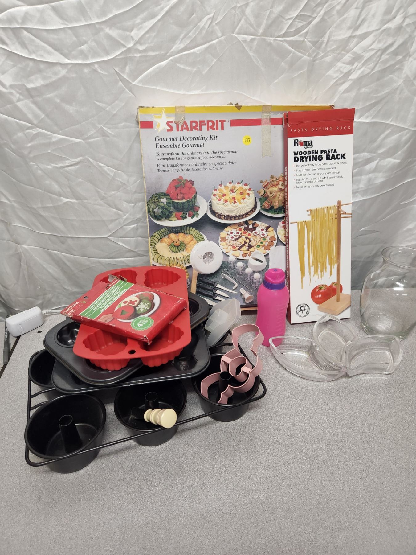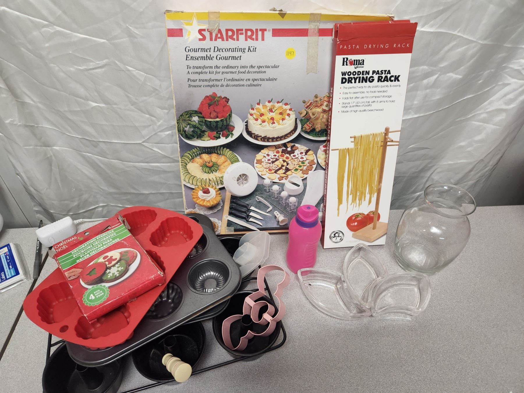 Kitchen Lot (Baking Molds, Decorating Stencils/Kit, Pasta Drying Rack, Vase, Small Water Bottle)