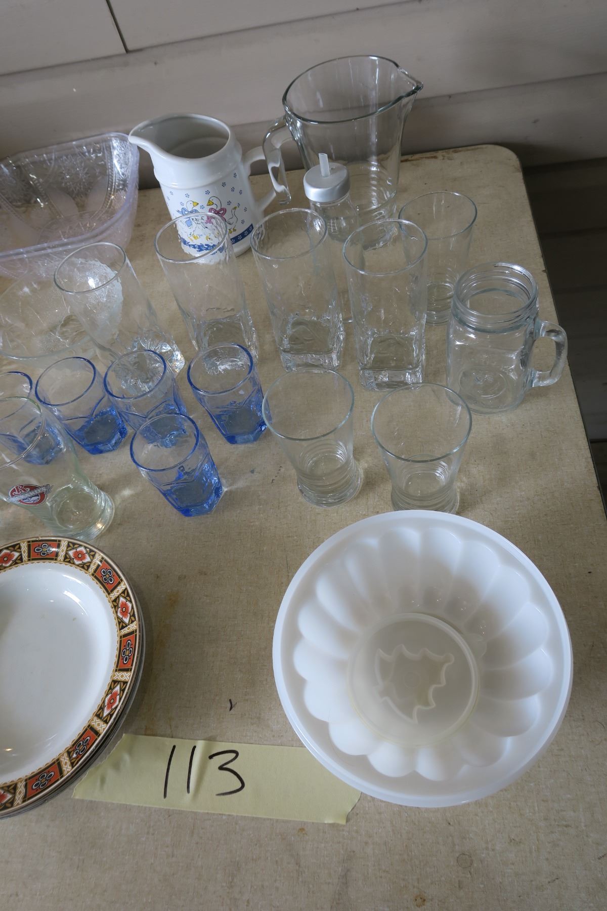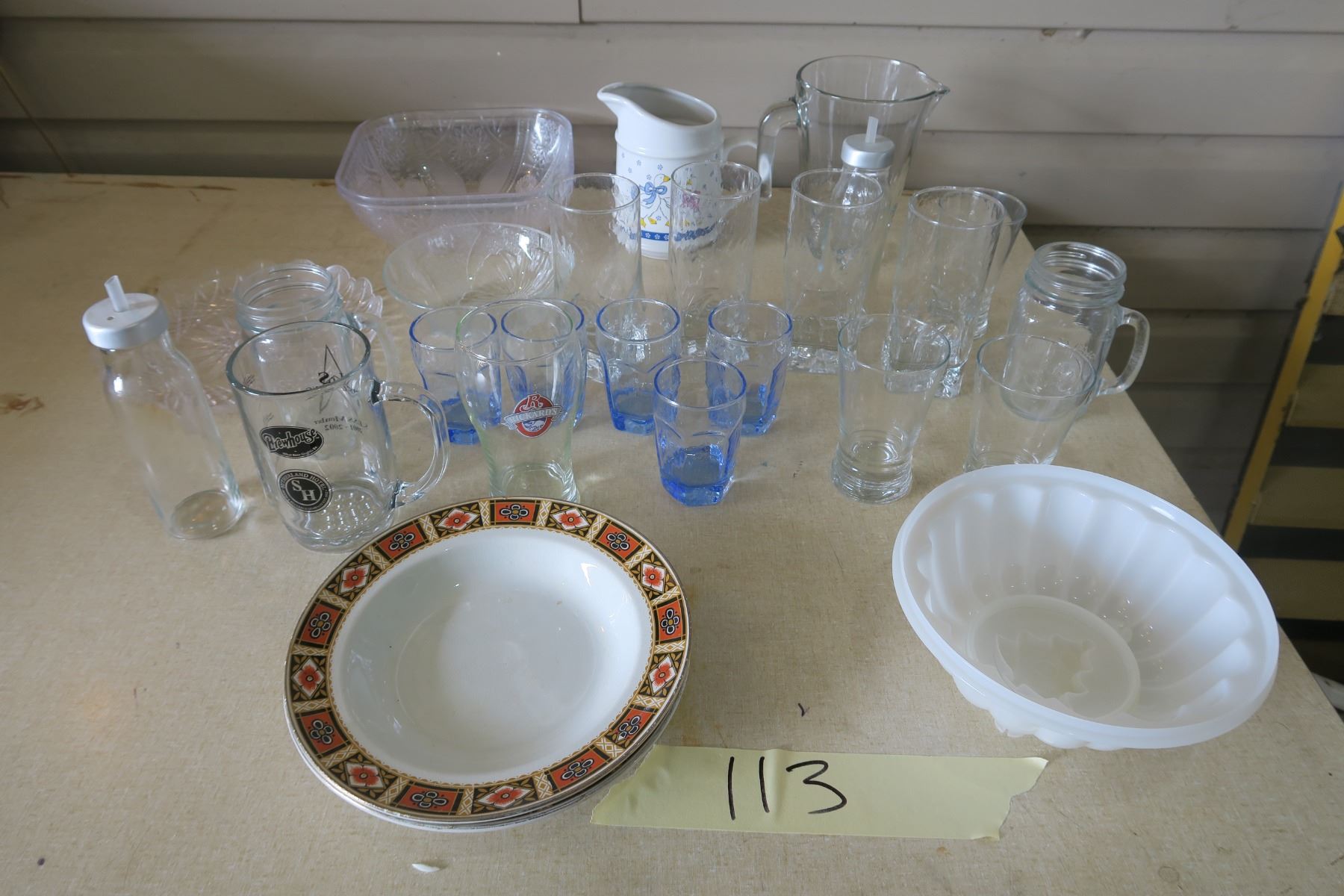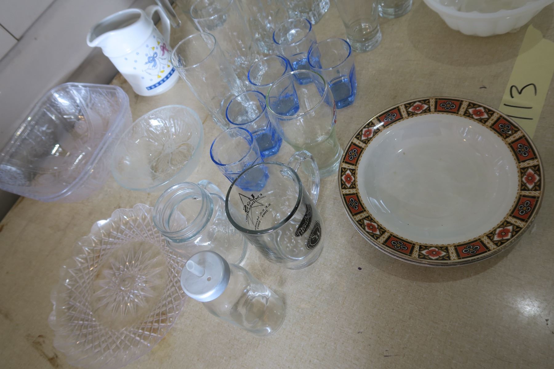 Kitchen Stuff -3 Bowls, 16 Cups, 4 Plastic Trays, 2 Pitchers and 2 Glass Bottles