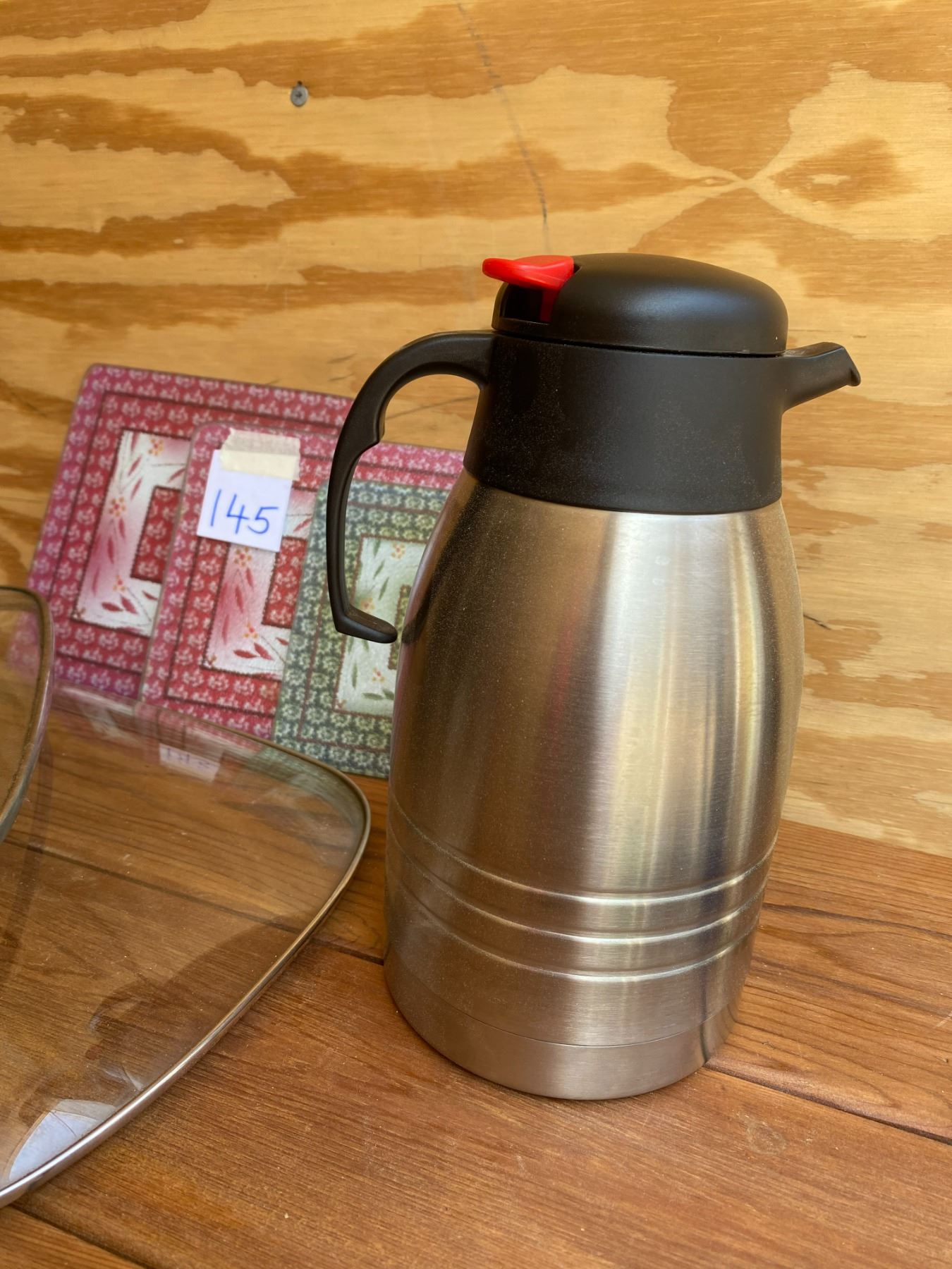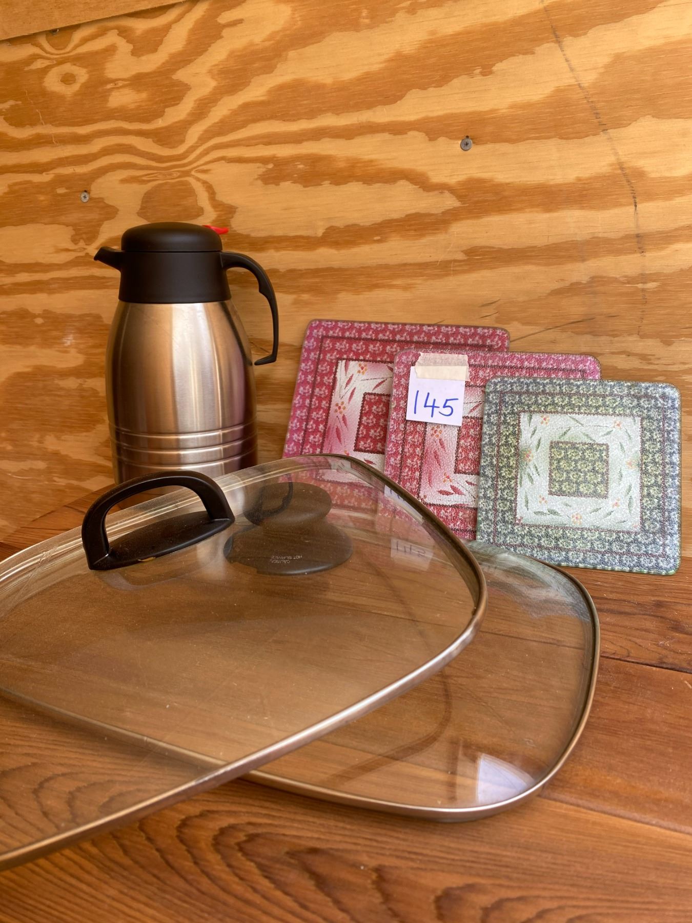 Kitchen lot 3 trivets s-m-l/ 2 glass frying pan lids/large coffee carafe