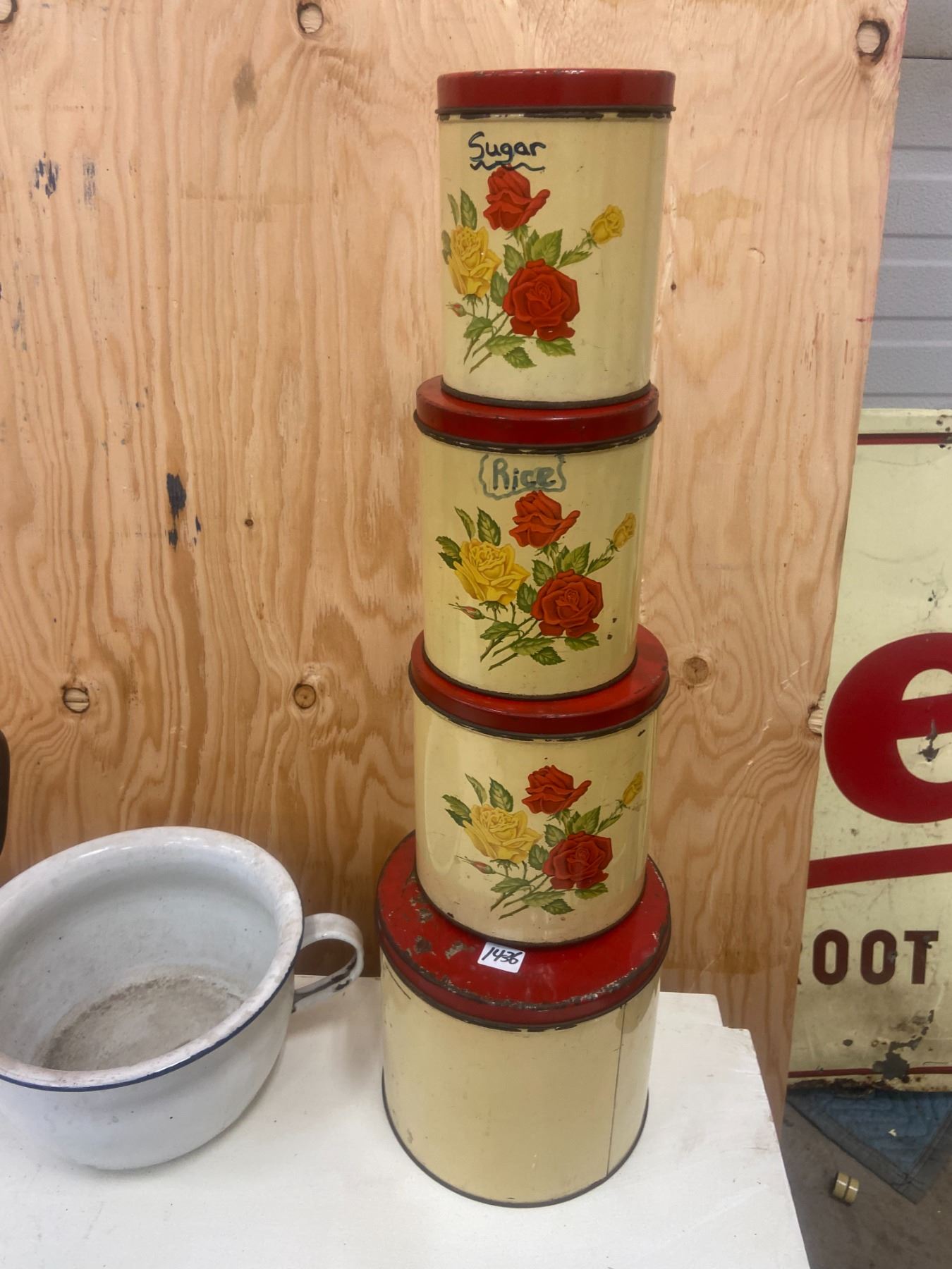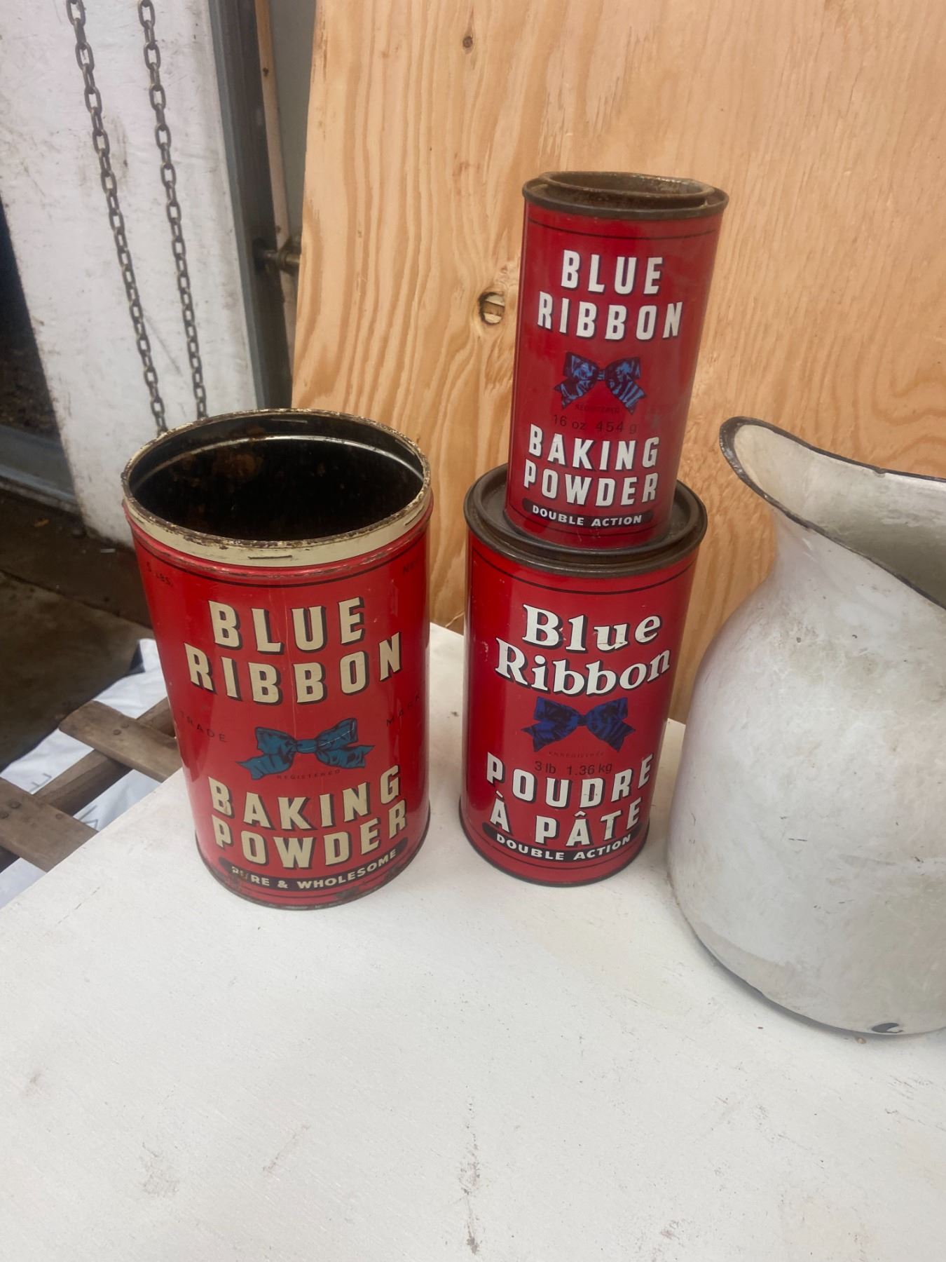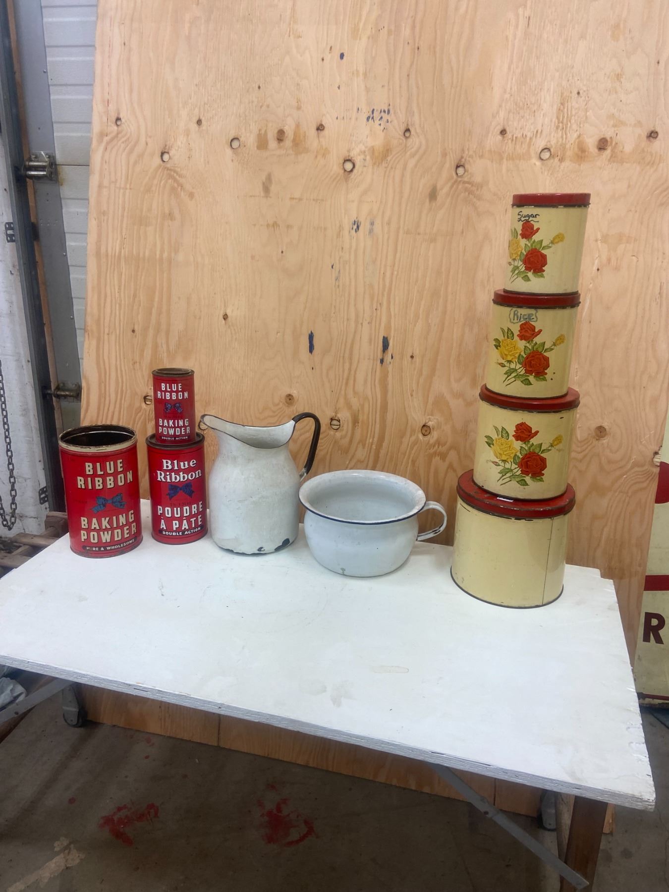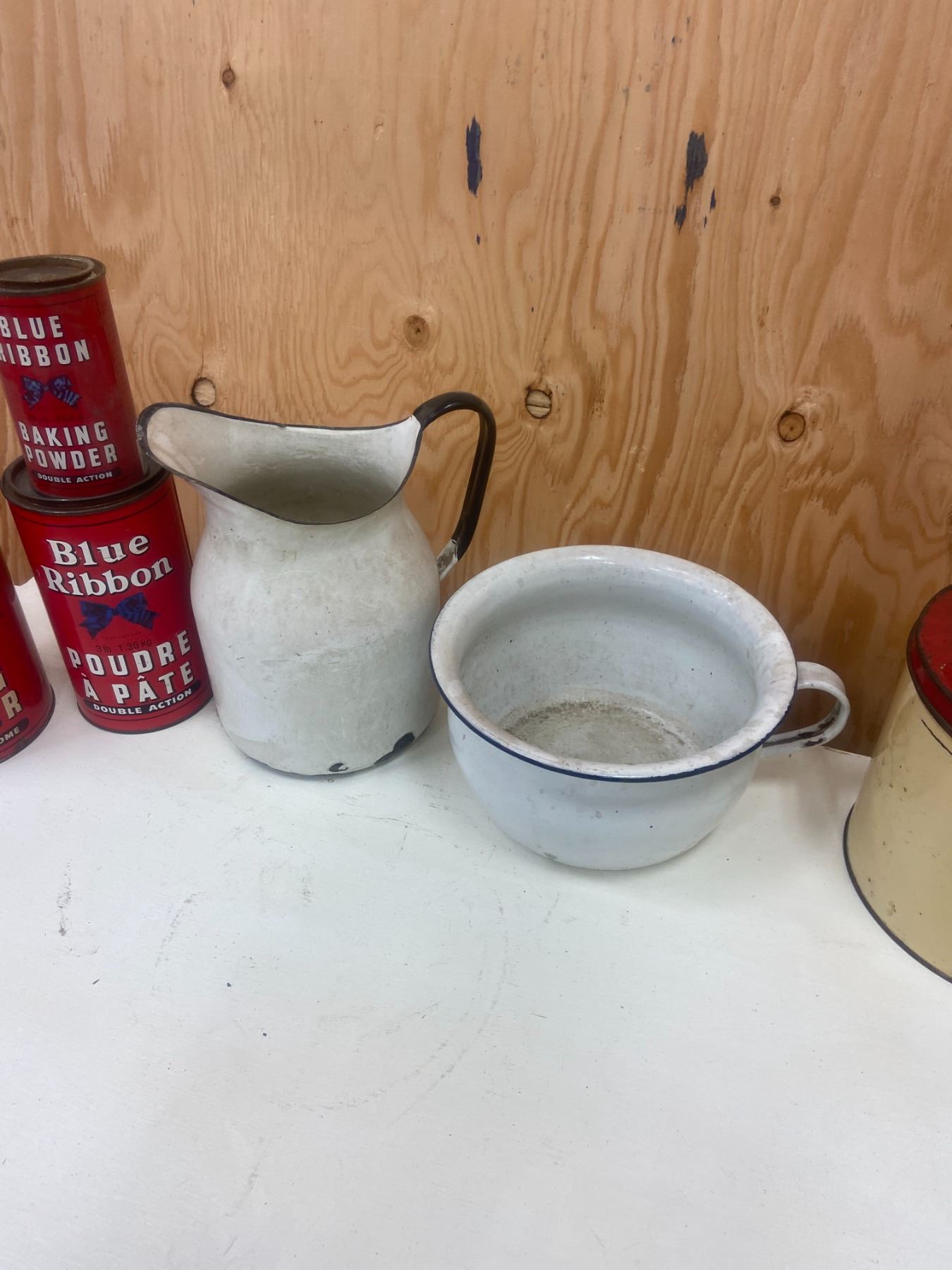 Kitchen ware lot - enamel pitcher, pot, cannister set, and 3 blue ribbon tins