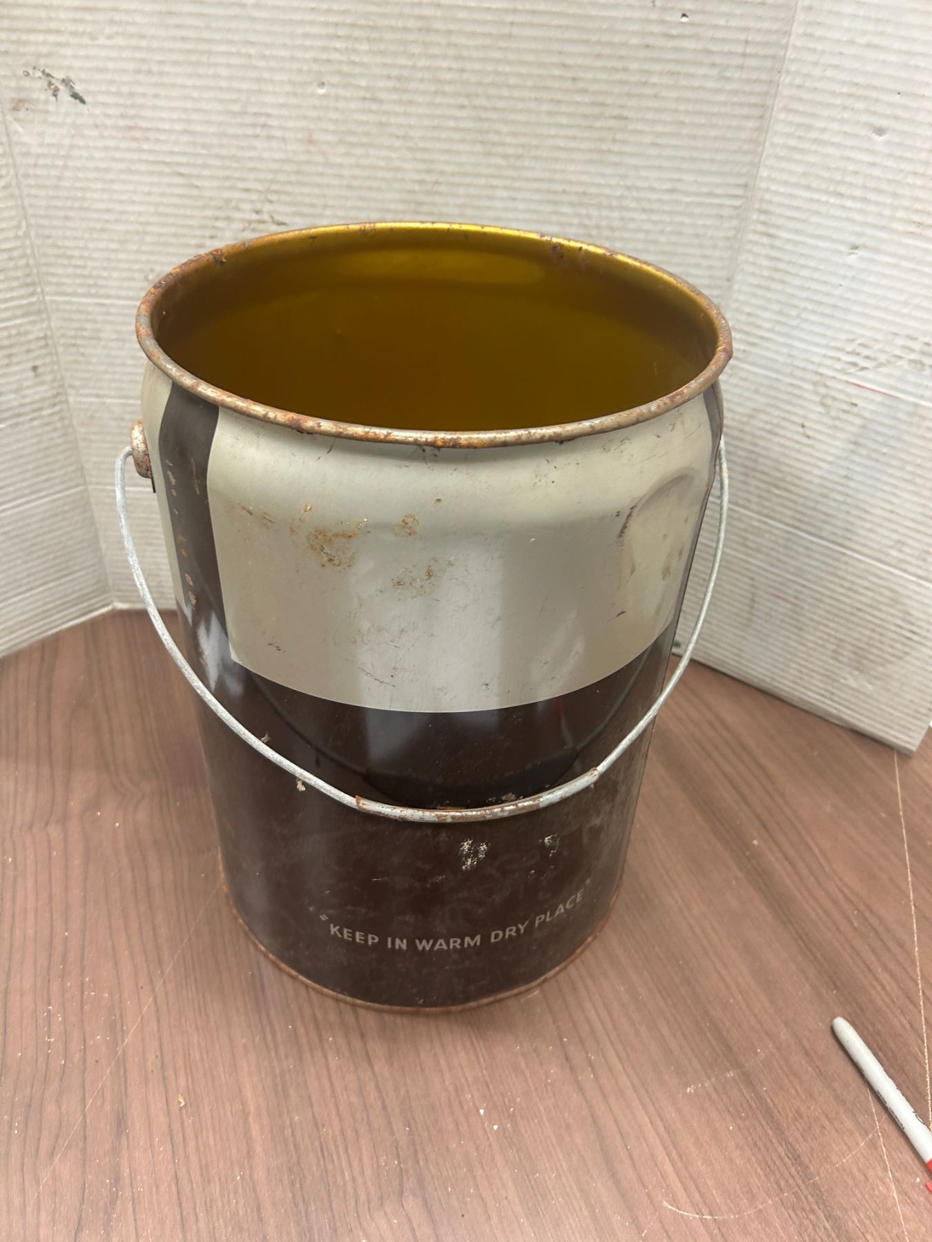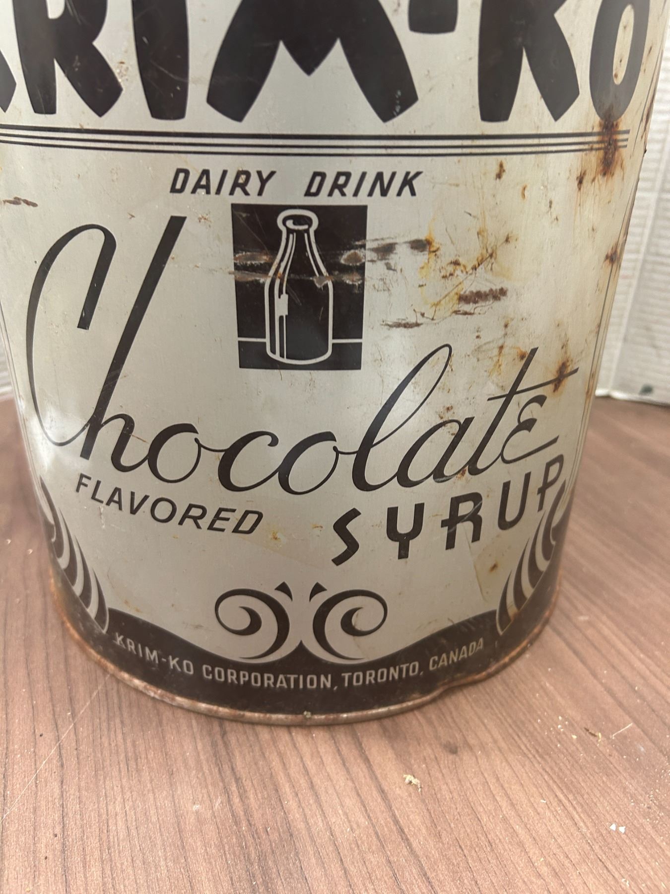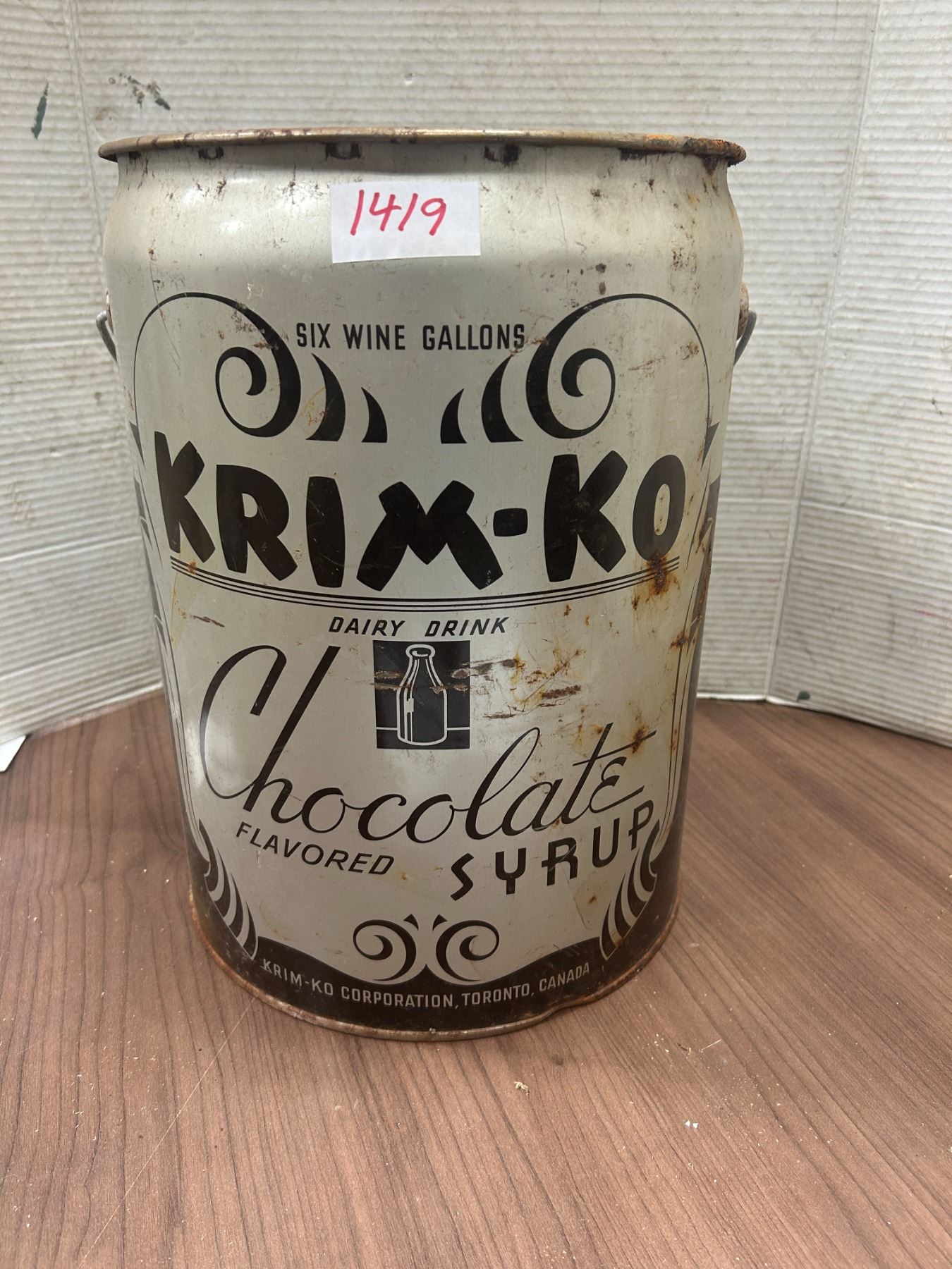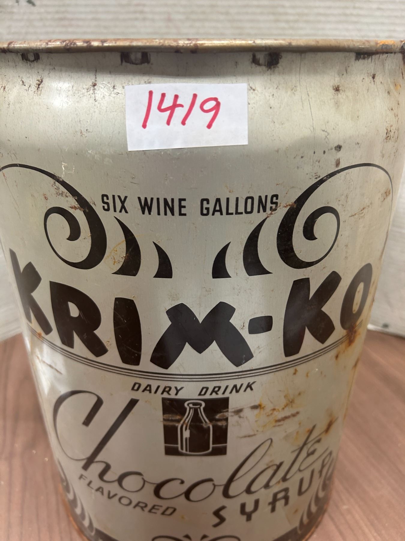 Krim Ko, chocolate syrup pail, six wine gallons