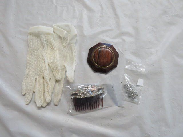 LADIES' DRESS GLOVES, COMPACT, EARRINGS, 2 HAIR COMBS