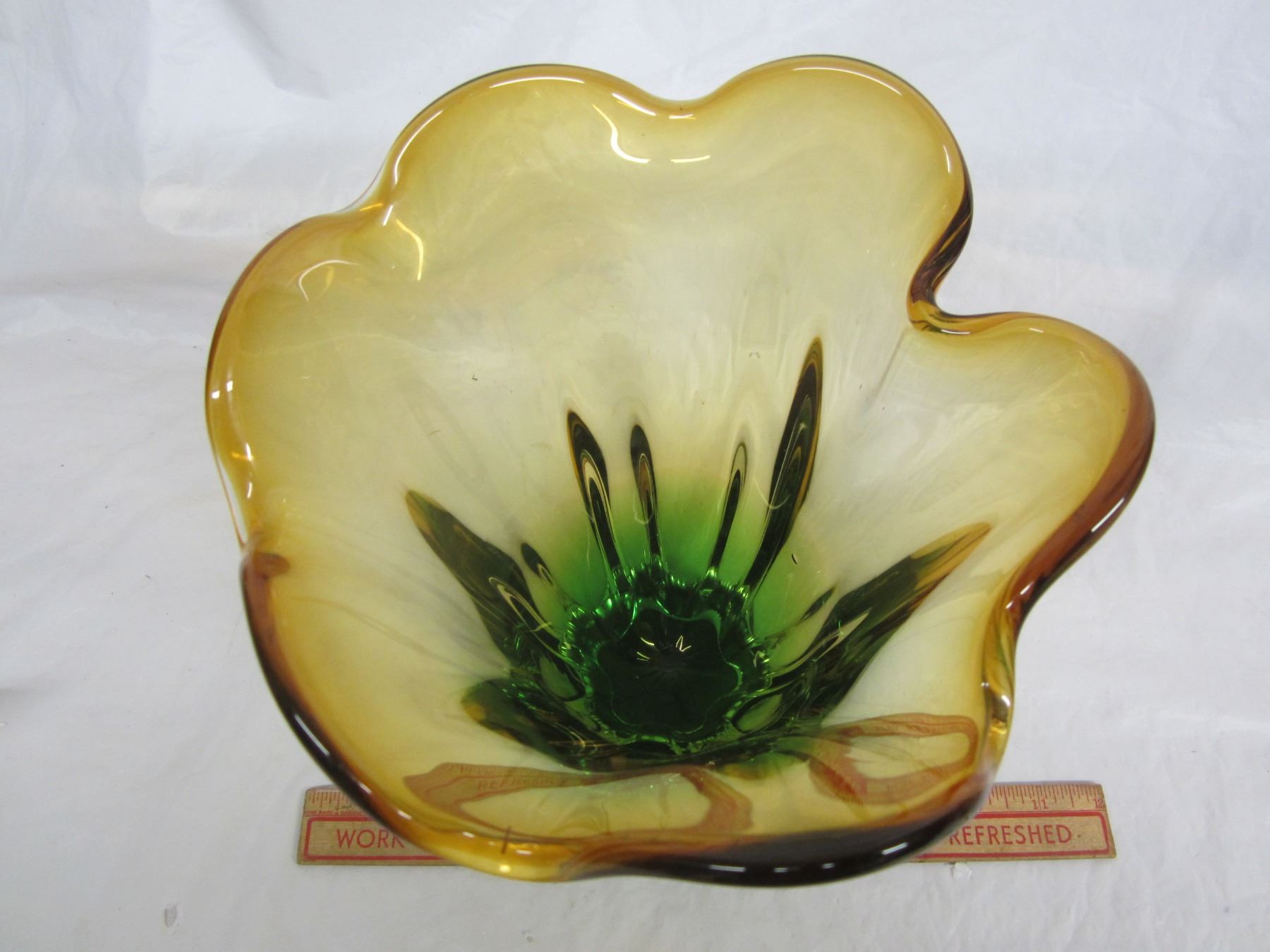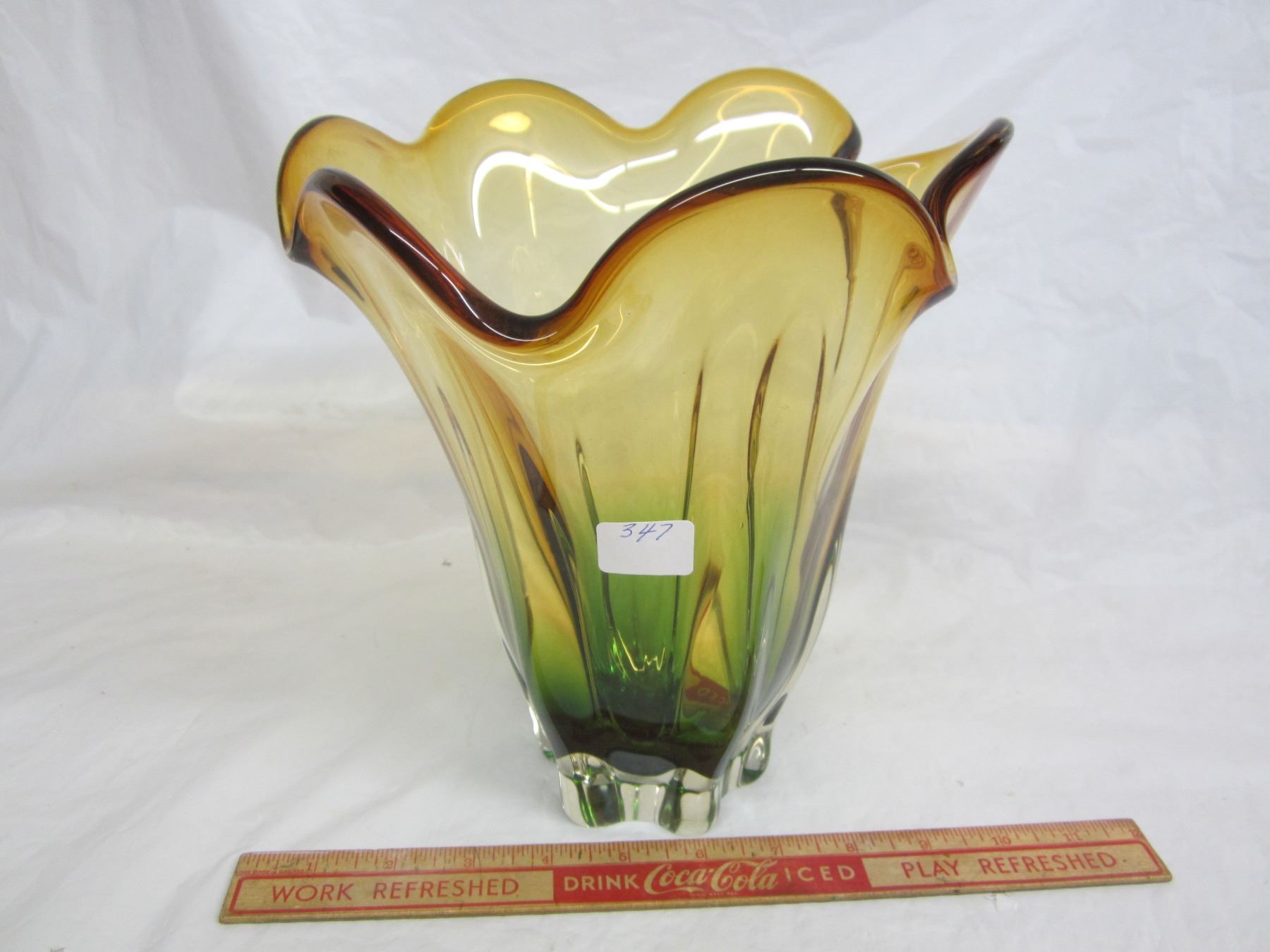 LARGE 1950'S GREEN TO AMBER ART GLASS VASE NO DAMAGE
