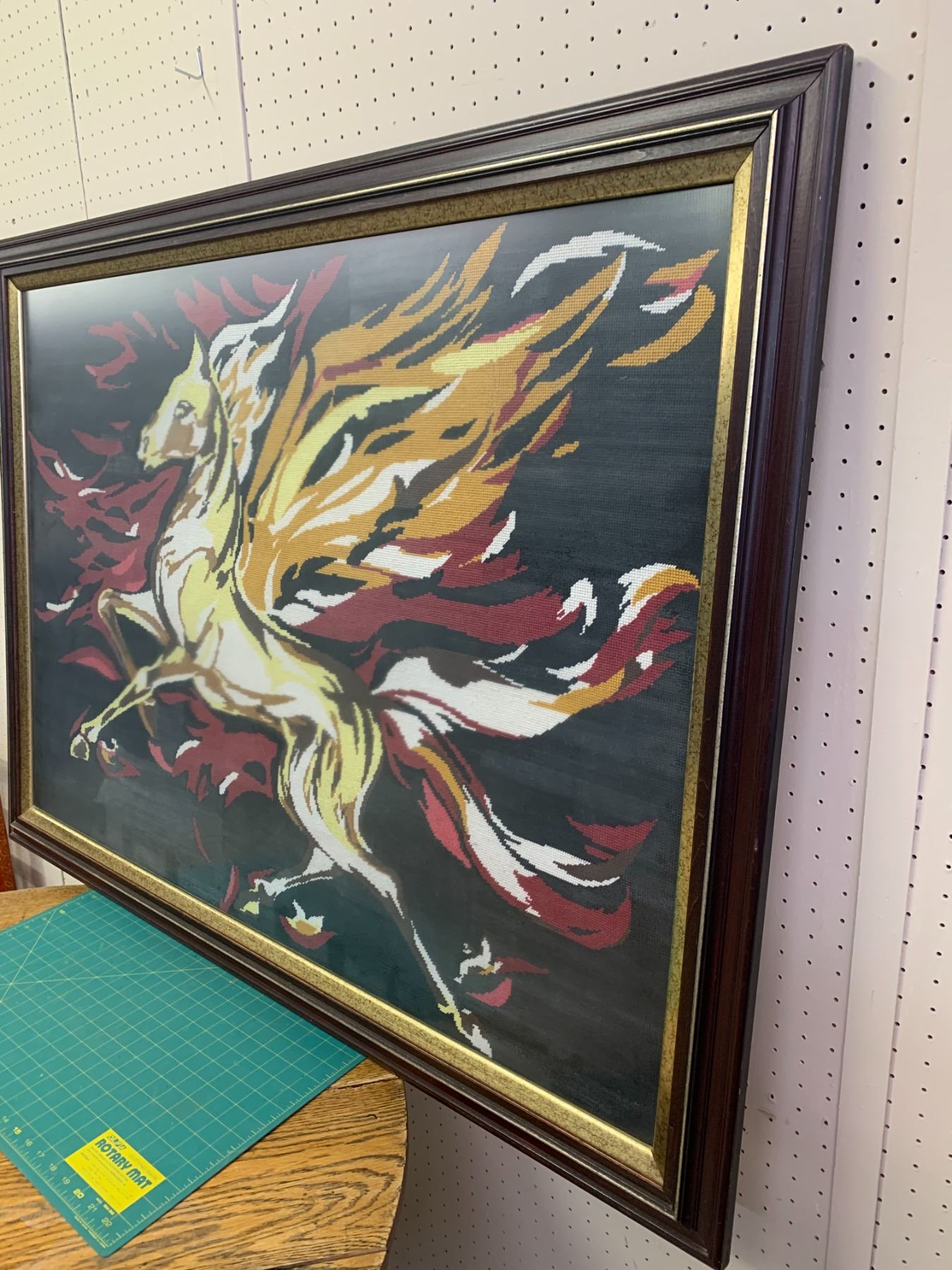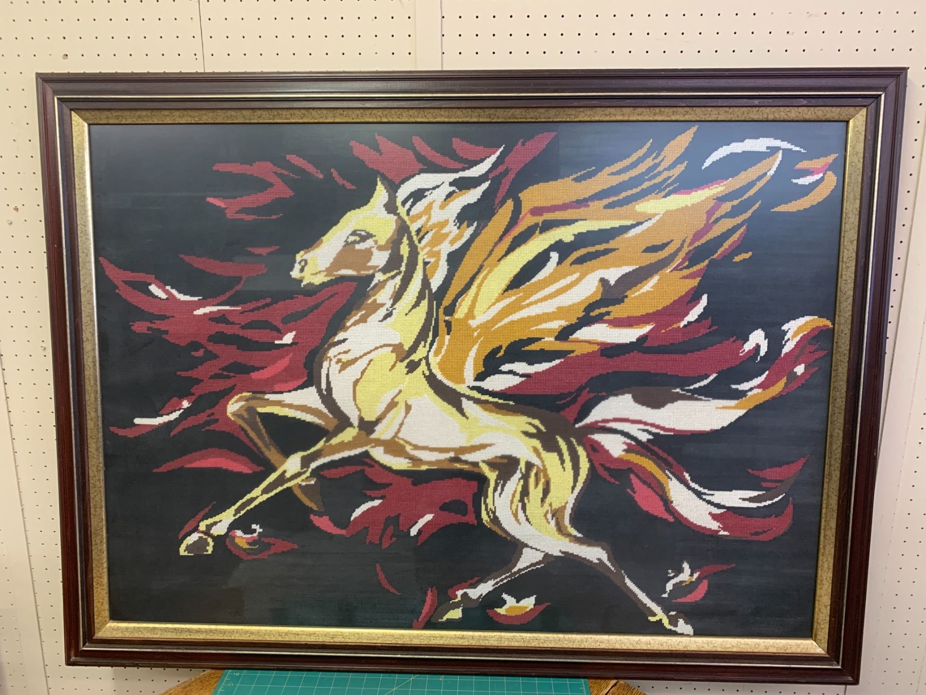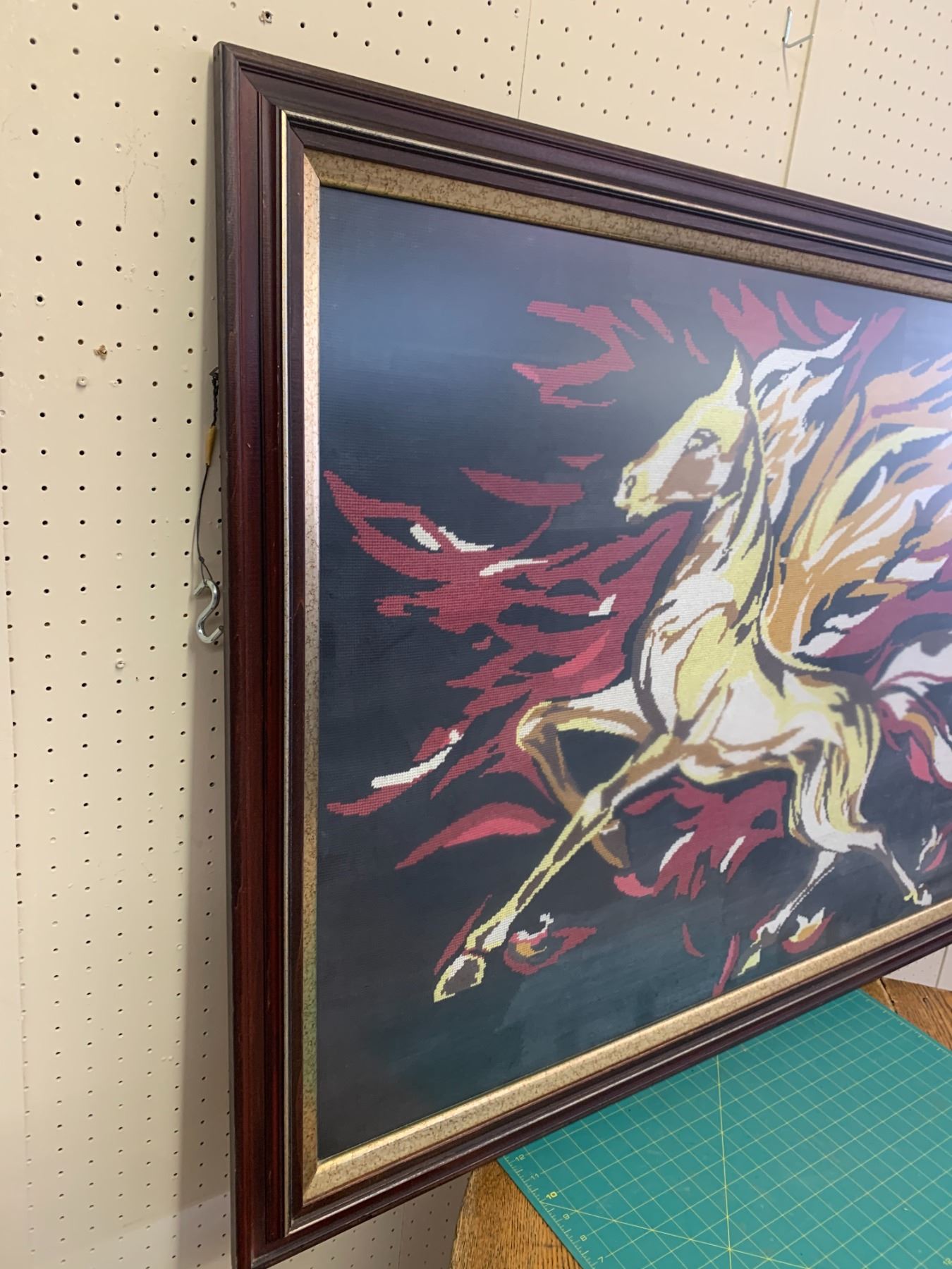 LARGE FRAMED FLAMING HORSE CROSS STITCH PICTURE 51" x 37"