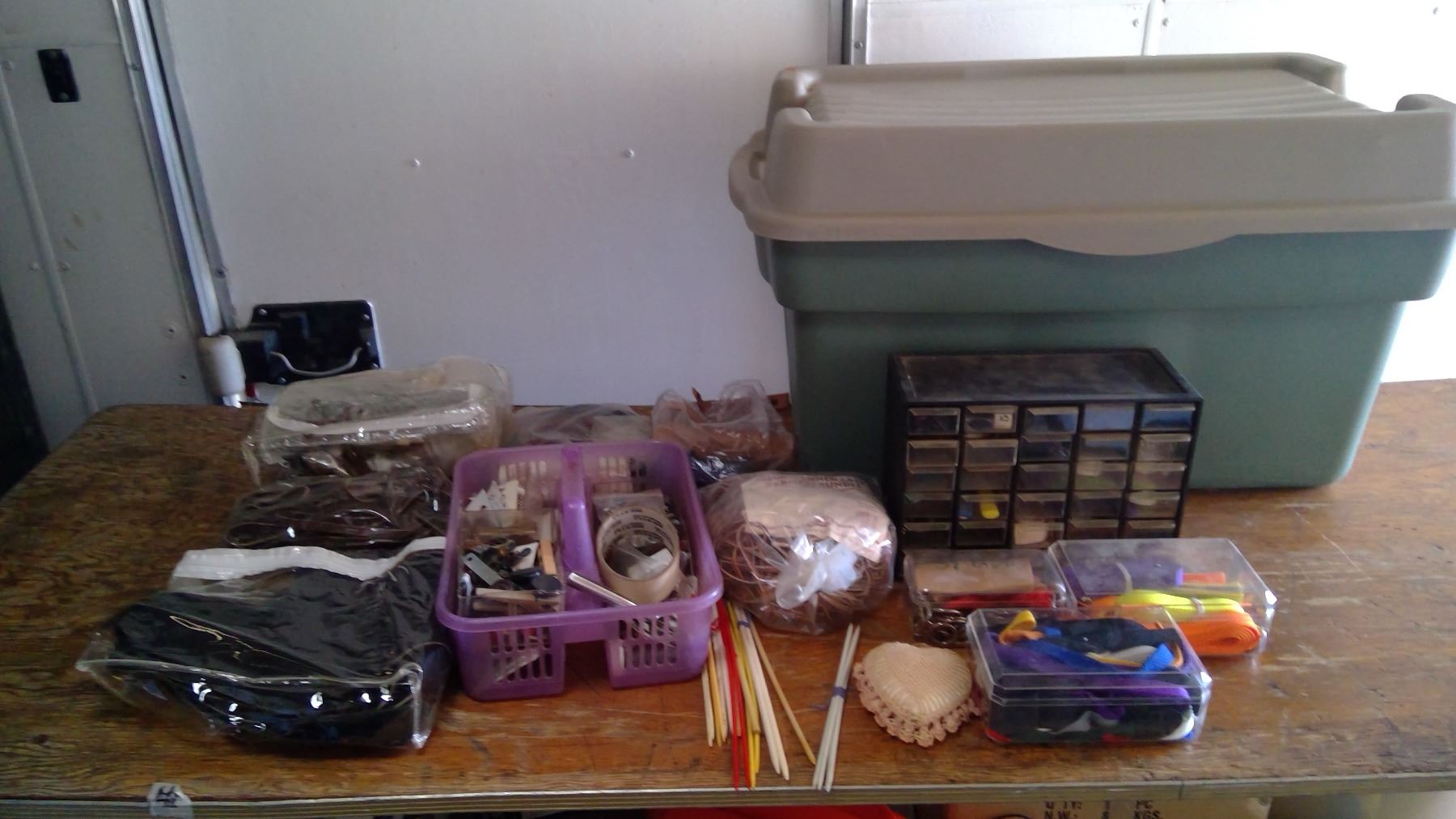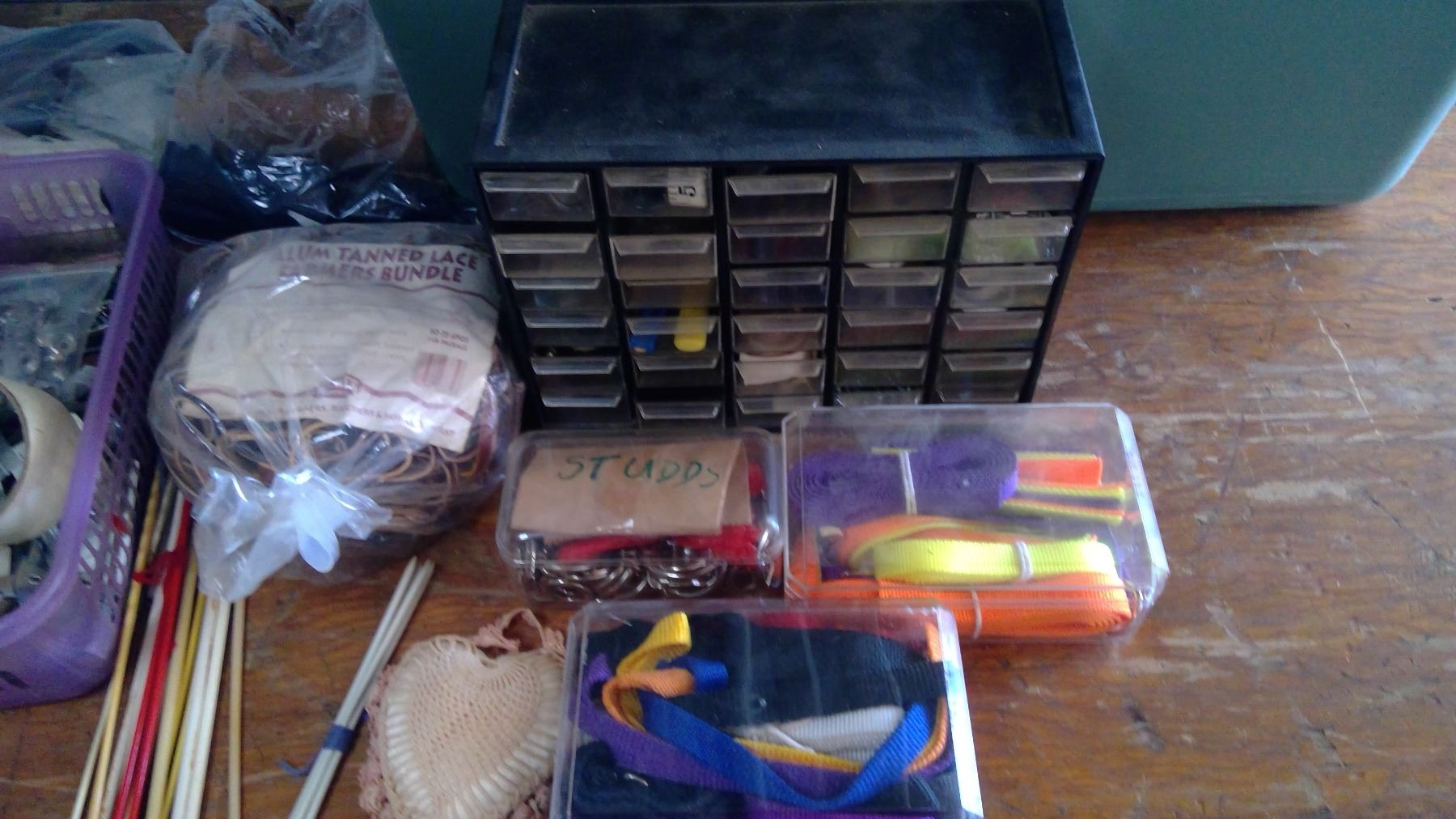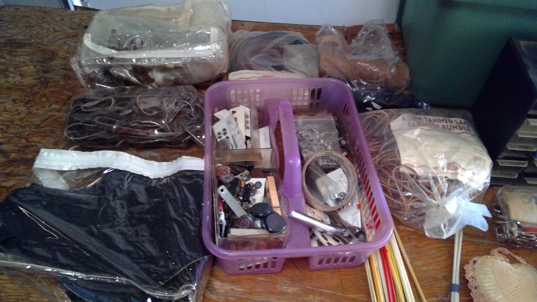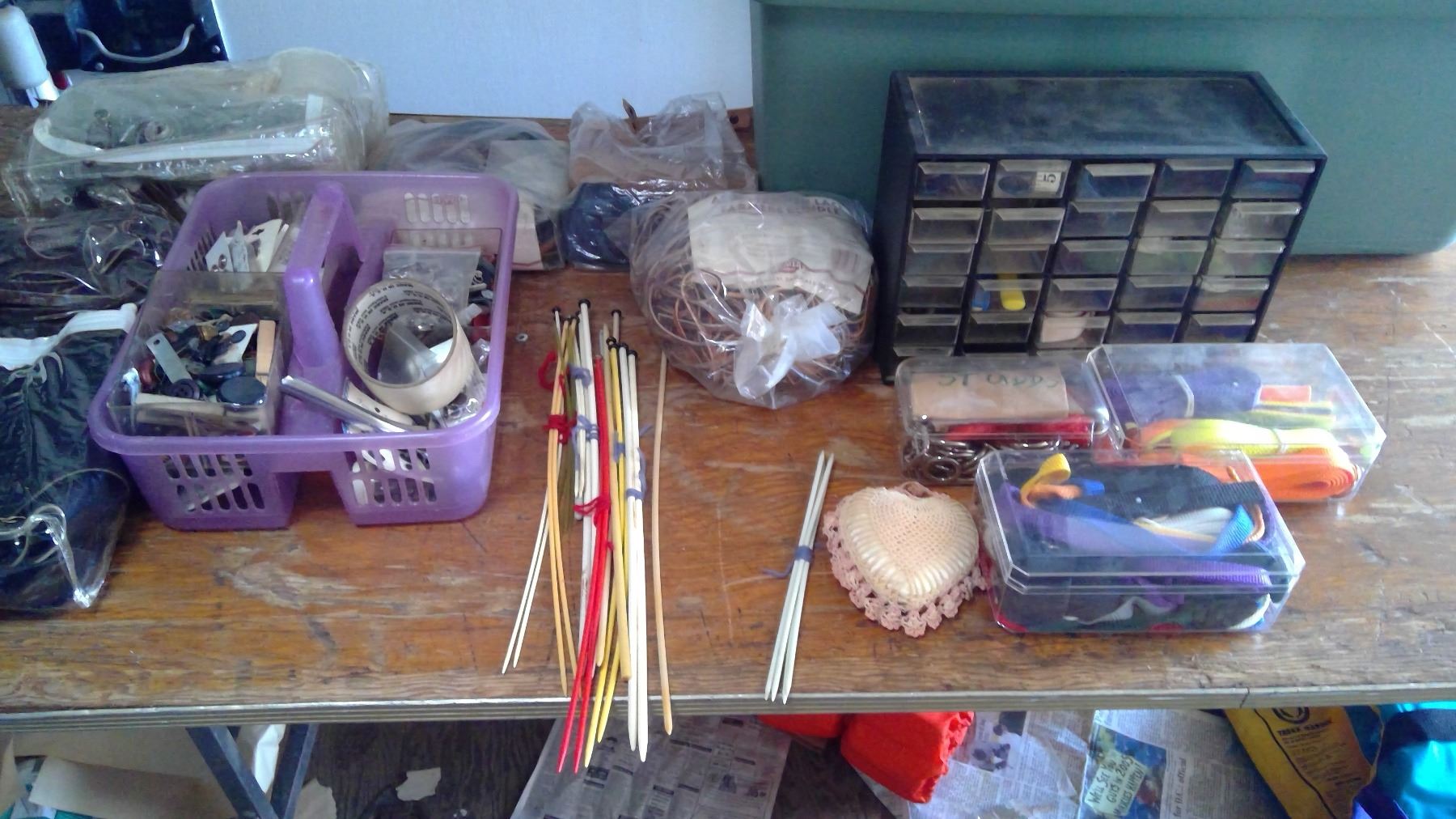 LARGE RUBBER MADE W/ KNITTING NEEDLES + LEATHER STRAPS + BUTTONS