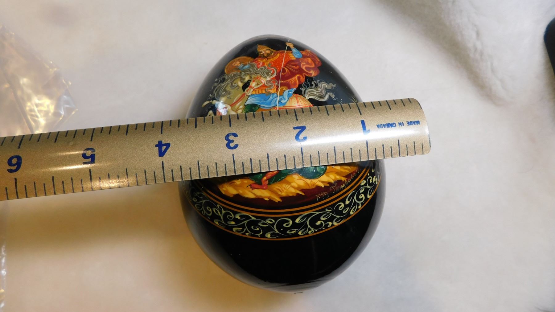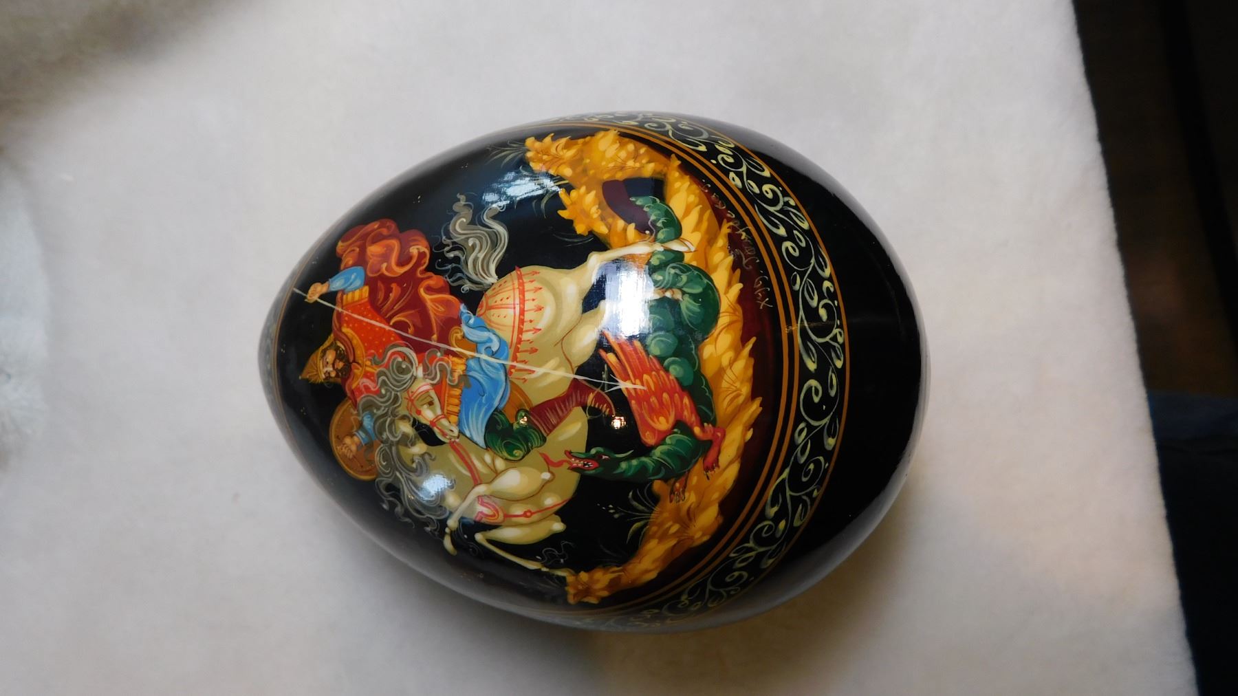 LARGE RUSSIAN PAINTED WOODEN EGG, ST. GEORGE VS THE DRAGON