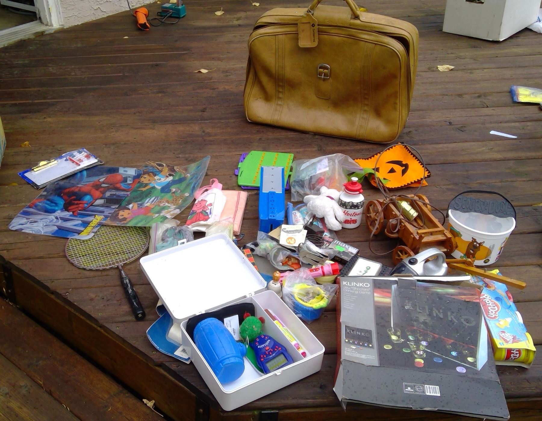 LEATHER SUITCASE AND LOT OF KIDS TOYS, GAMES, CARDS, ECT. PLUS ADULT DRINKING GAME