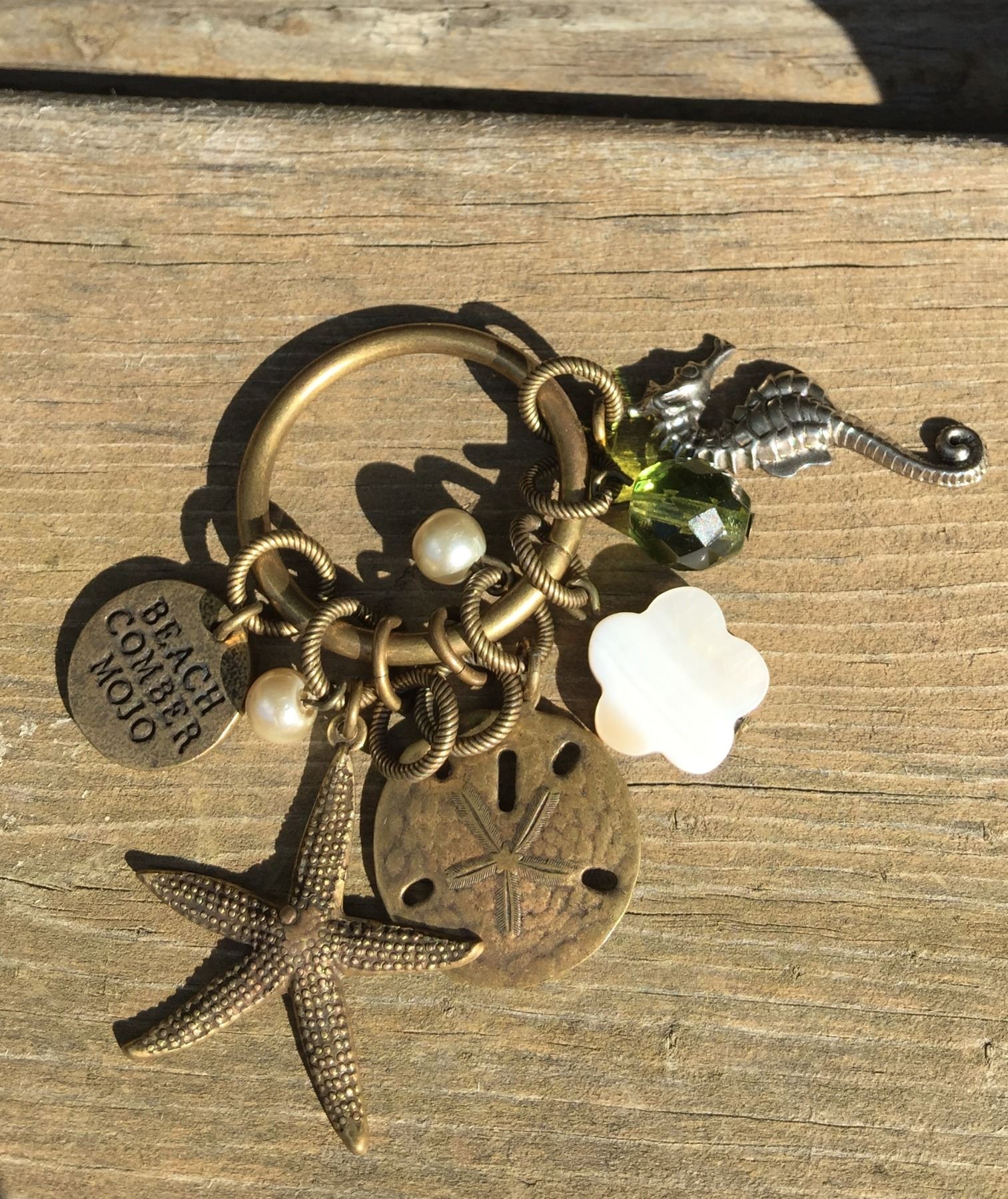 LENNY AND EVA BRASS MOJO CHARM / FITS ON CUFFS, OR CHAIN BRACELET OR NECKLACEBEACH COMBER THEME; STARFISH,SAND DOLLAR,SEA HORSE, SHELL FLOWER,,BEADS/RING MEASURES 1 1/4 INCHES