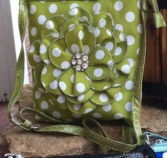 LIME GREEN/WHITE POLKA DOT MESSENGER PURSE-ZIPPER CLOSURE,ADJUSJTABLE STRAP