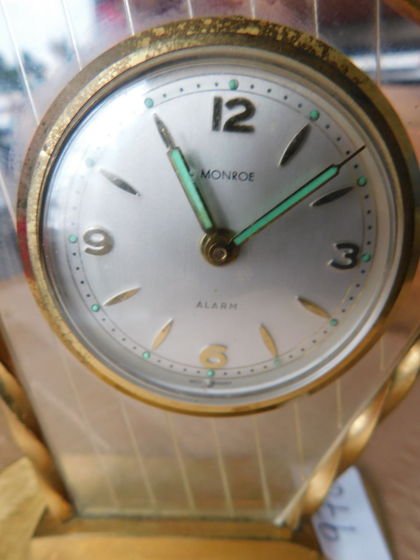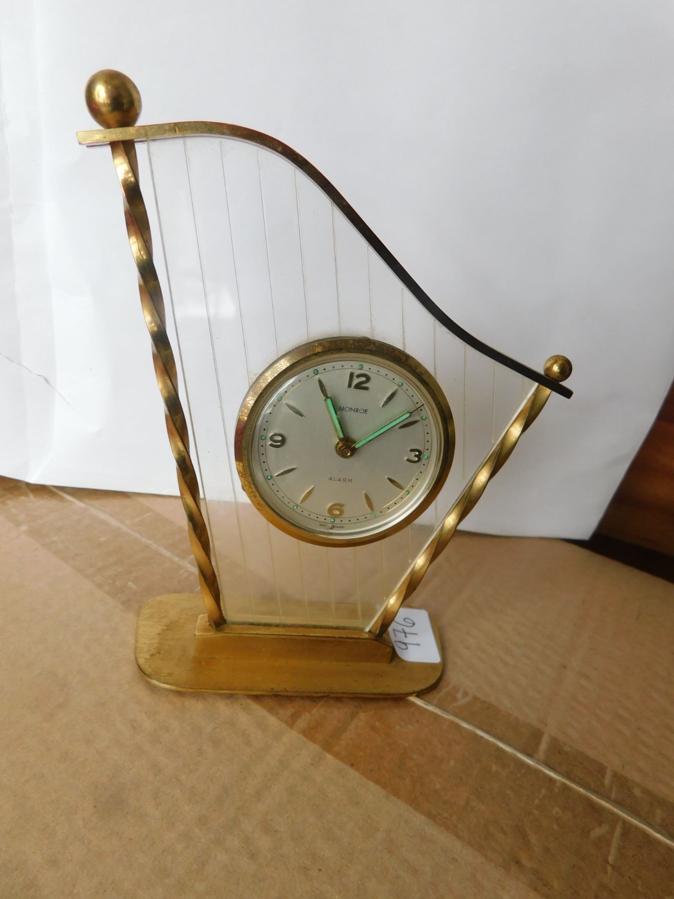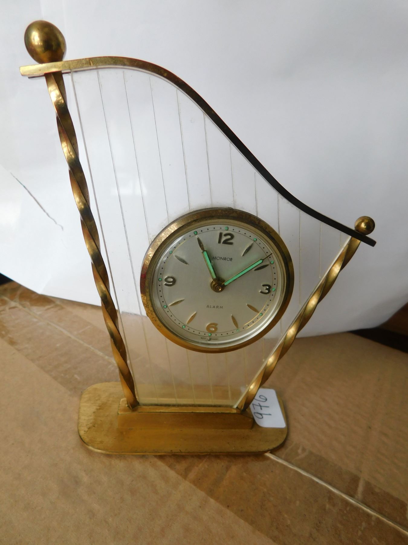 LINDEN HARP SHAPED LUCITE AND BRASS ALARM CLOCK SCARCE