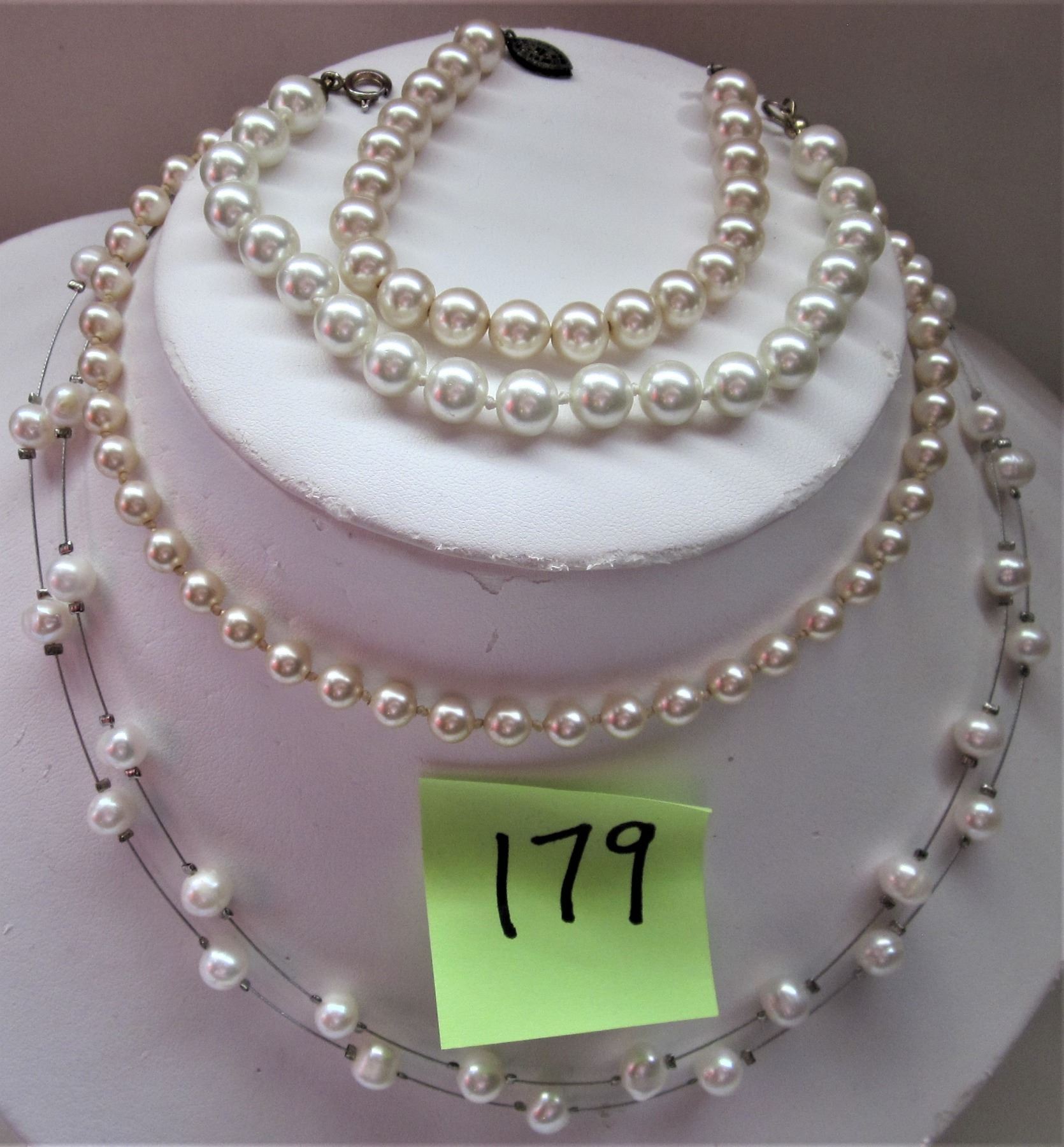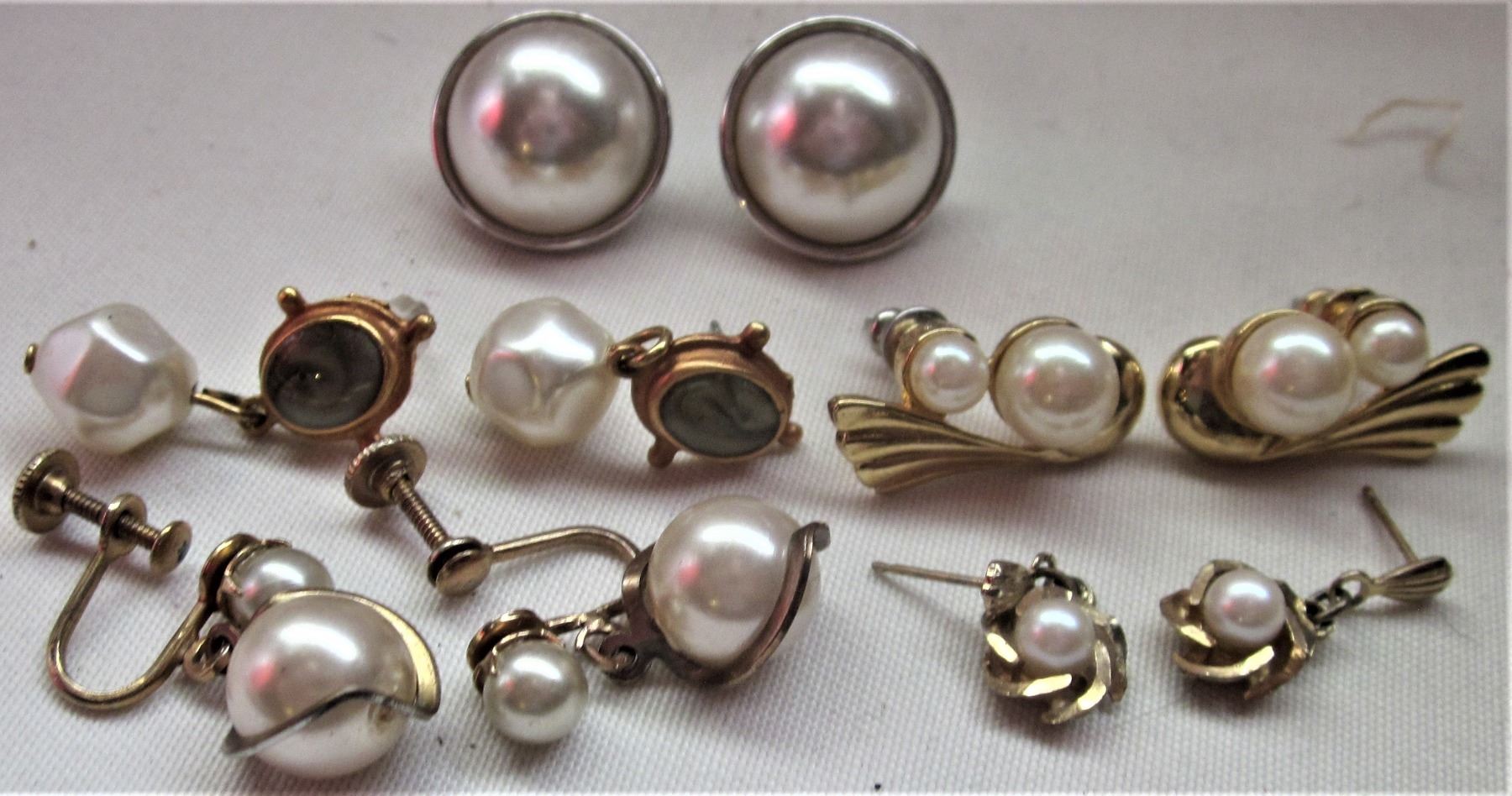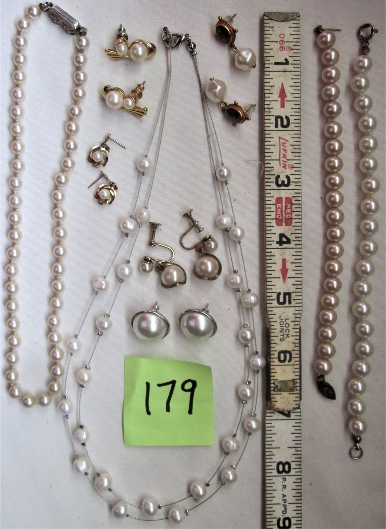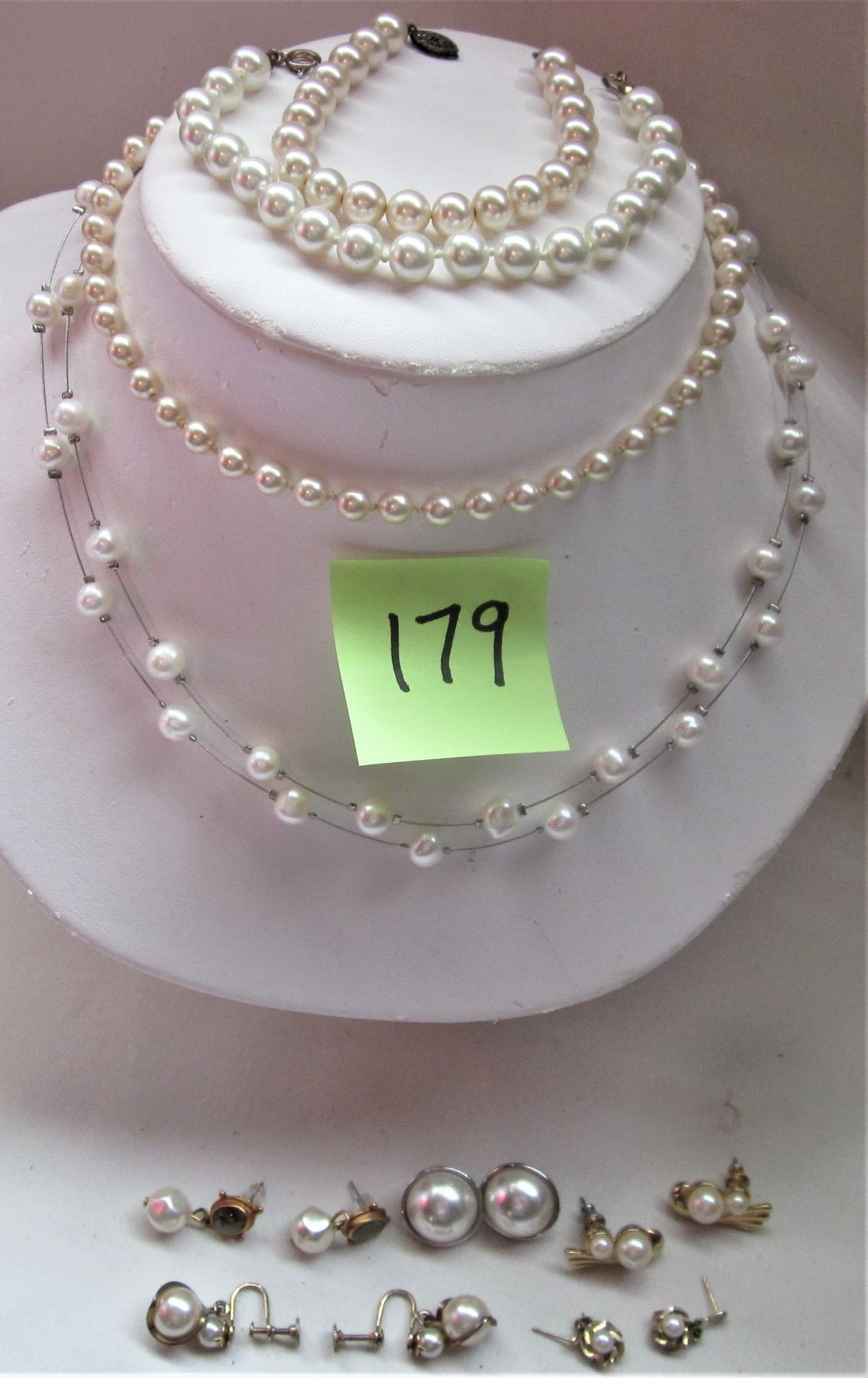 LOT 2 PEARL NECKLACES, 2 PEARL BRACELETS, 5 PAIR PEARL EARRINGS
