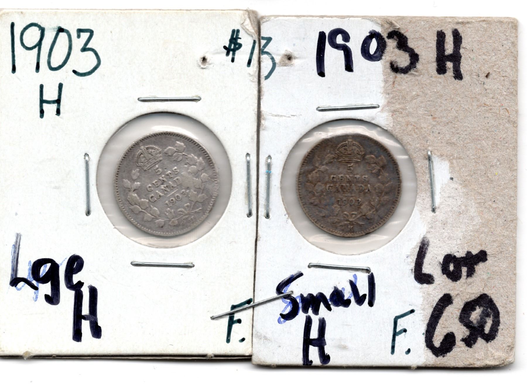 LOT 650 1903H 5 CENTS LARGE AND SMALL H VARIETIES