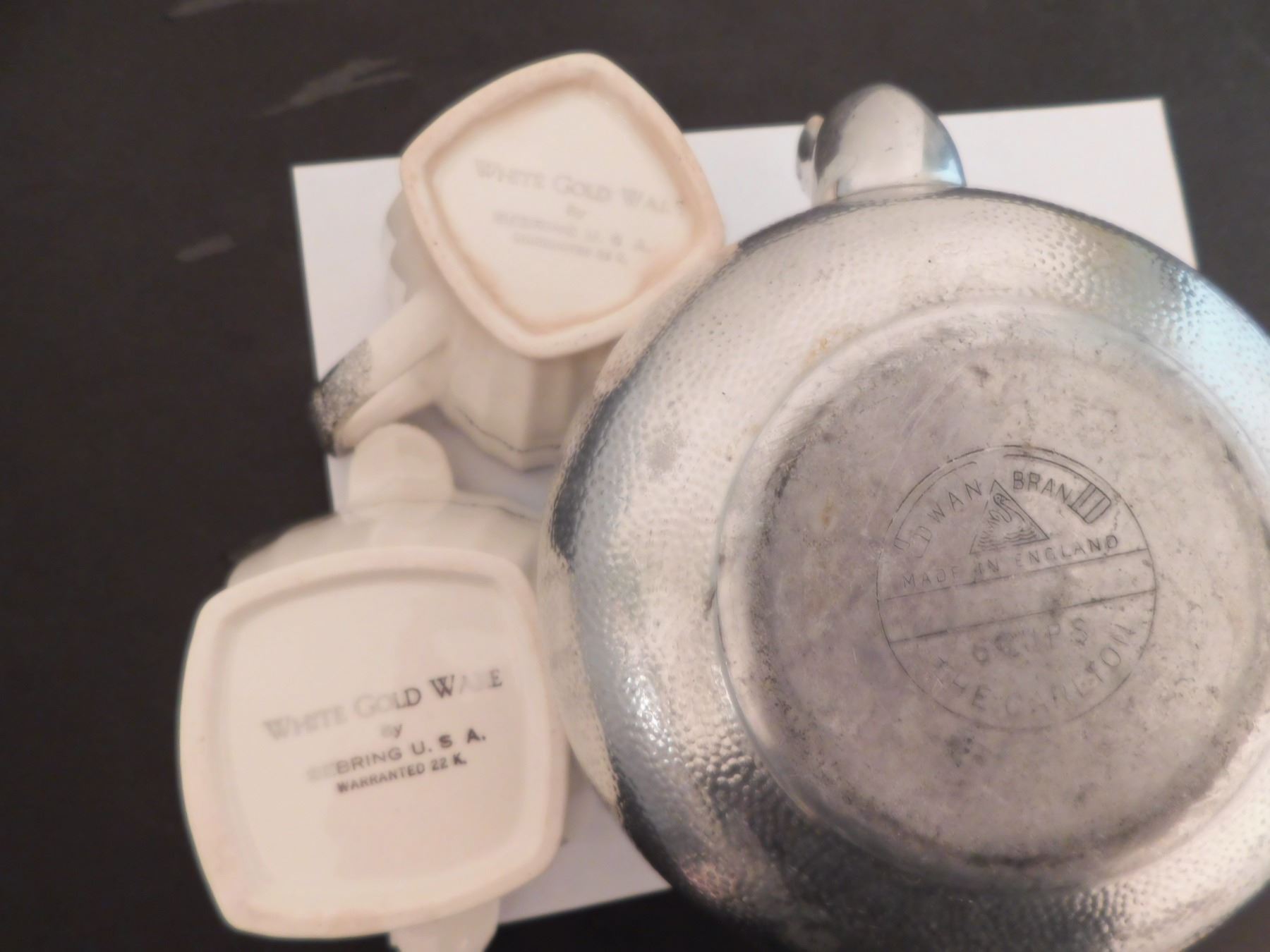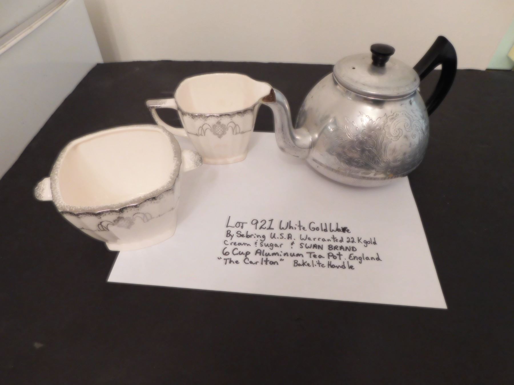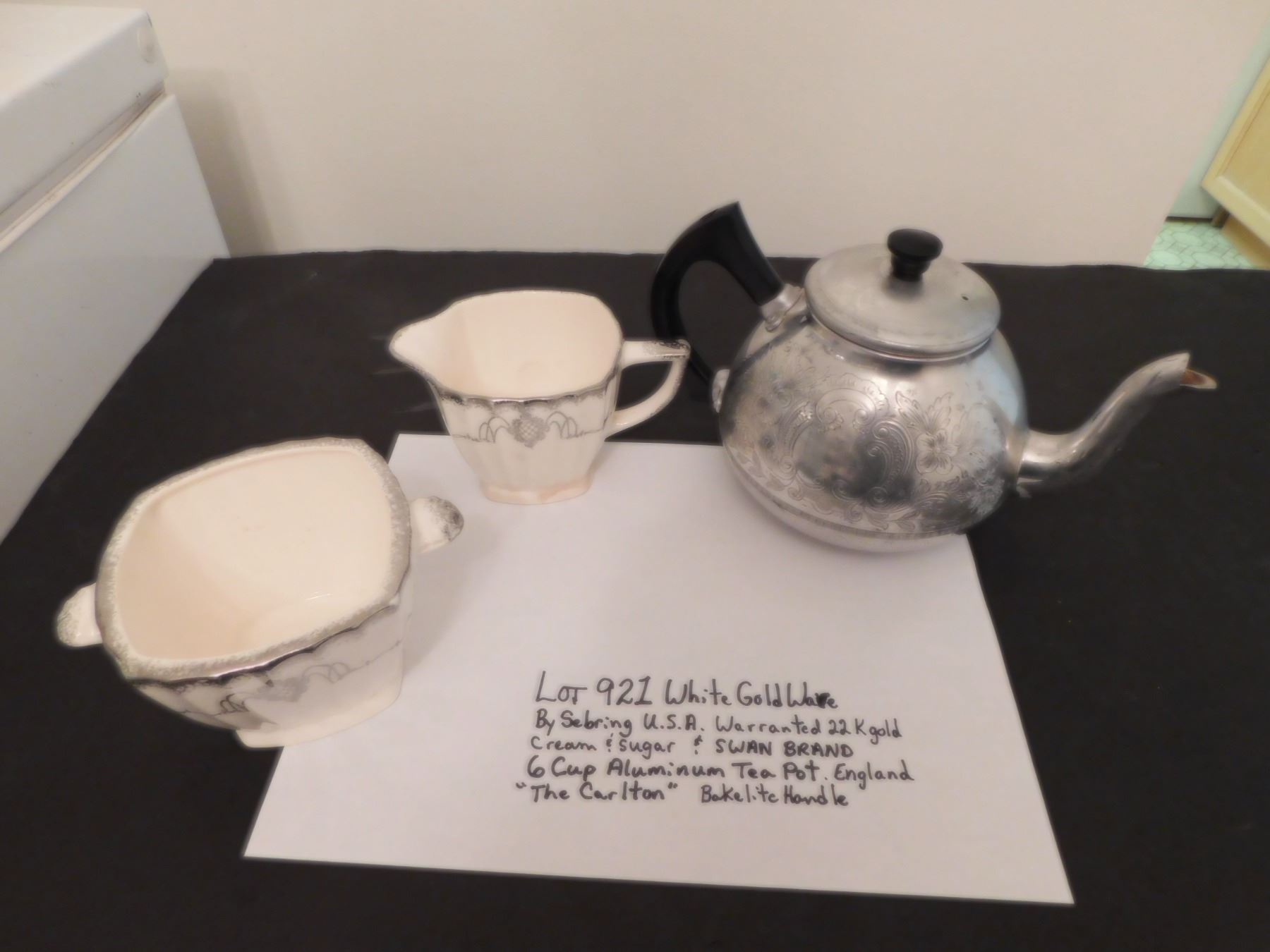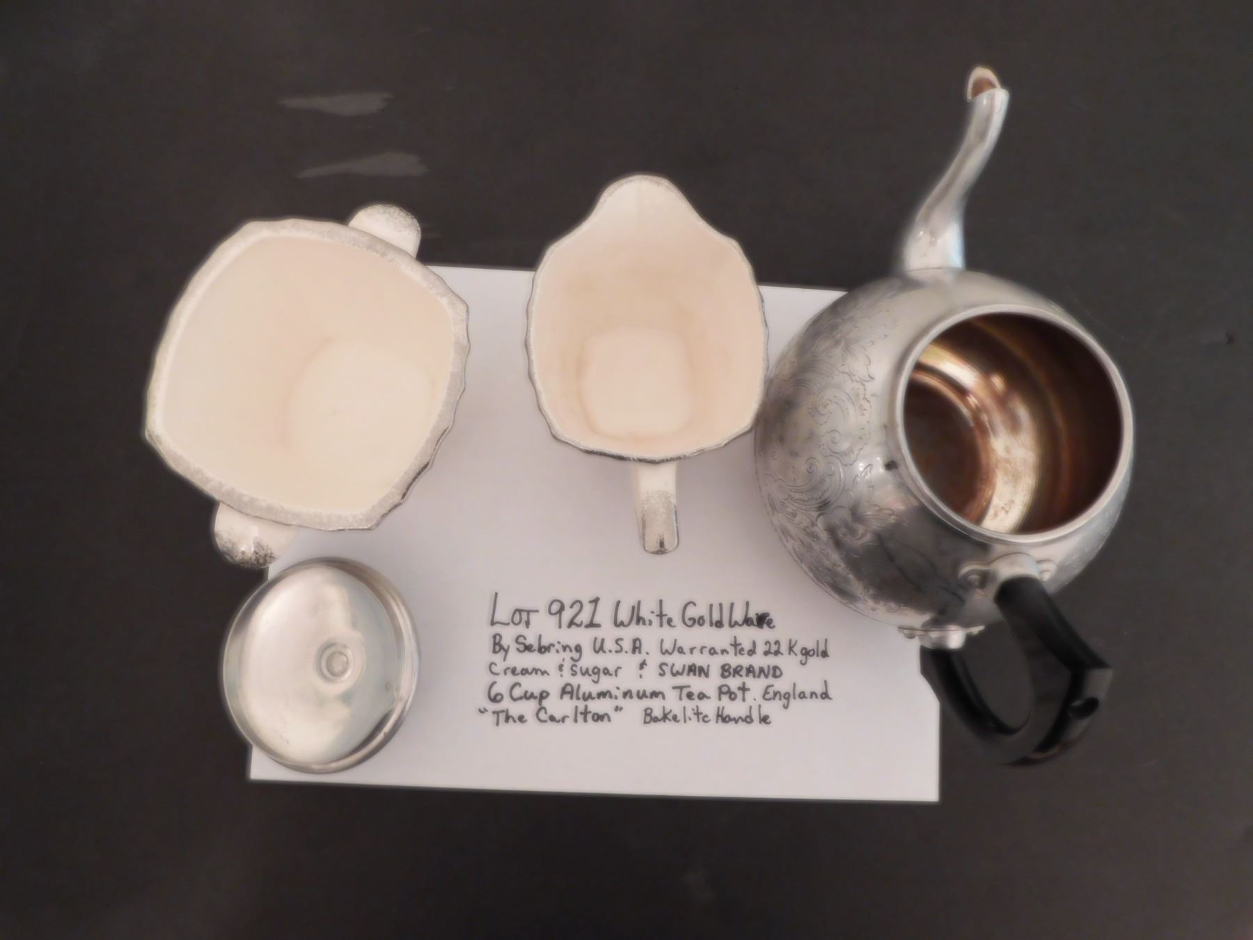 LOT 921 WHIYE GOLD WARE CREAM/SUGAR & 6 CUP SWAN BRAND ALUMINUM THE CARLTON TEA POT