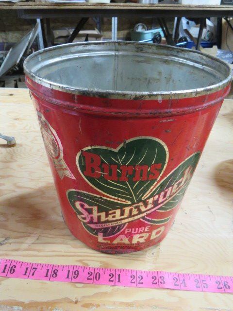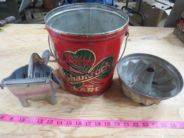 LOT INCLUDING A BURNS LARD BUCKET, CAKE PAN, JUICER