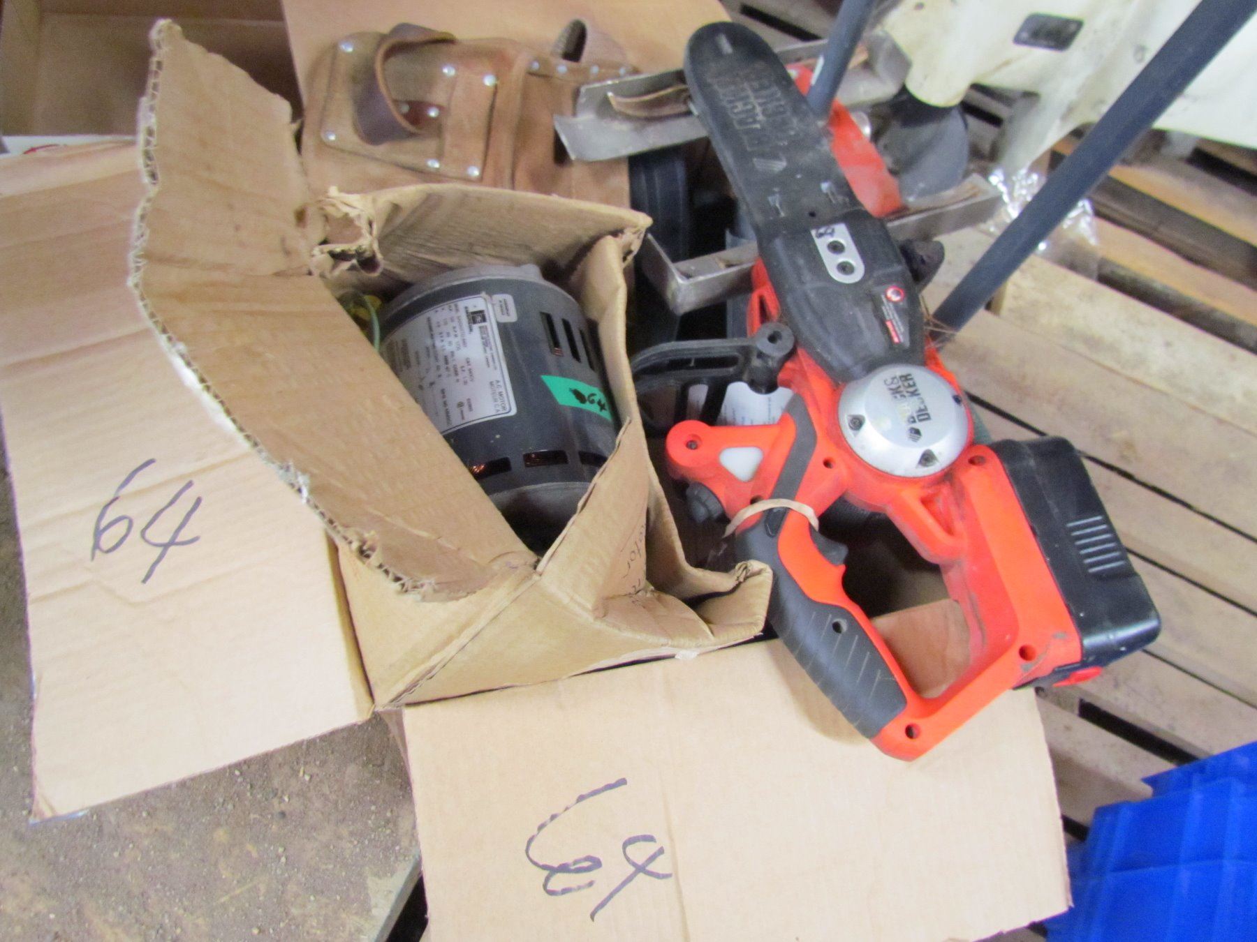 LOT INCLUDING AN A/C MOTOR, CORDLESS BLACK AND DECKER CHAIN SAW, TOOL BELT, HAND SAW AND 2 SPRINKLER