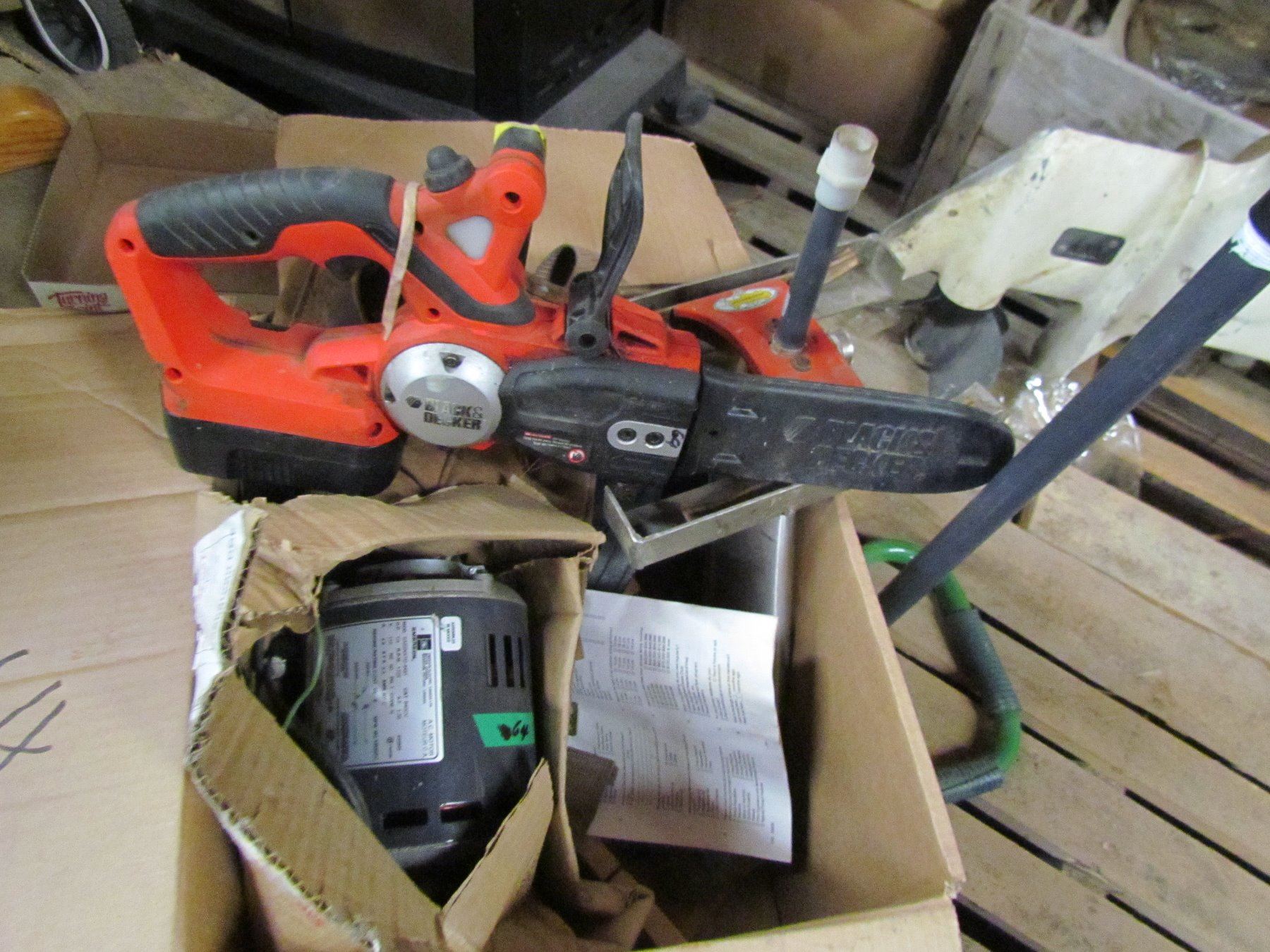 LOT INCLUDING AN A/C MOTOR, CORDLESS BLACK AND DECKER CHAIN SAW, TOOL BELT, HAND SAW AND 2 SPRINKLERS