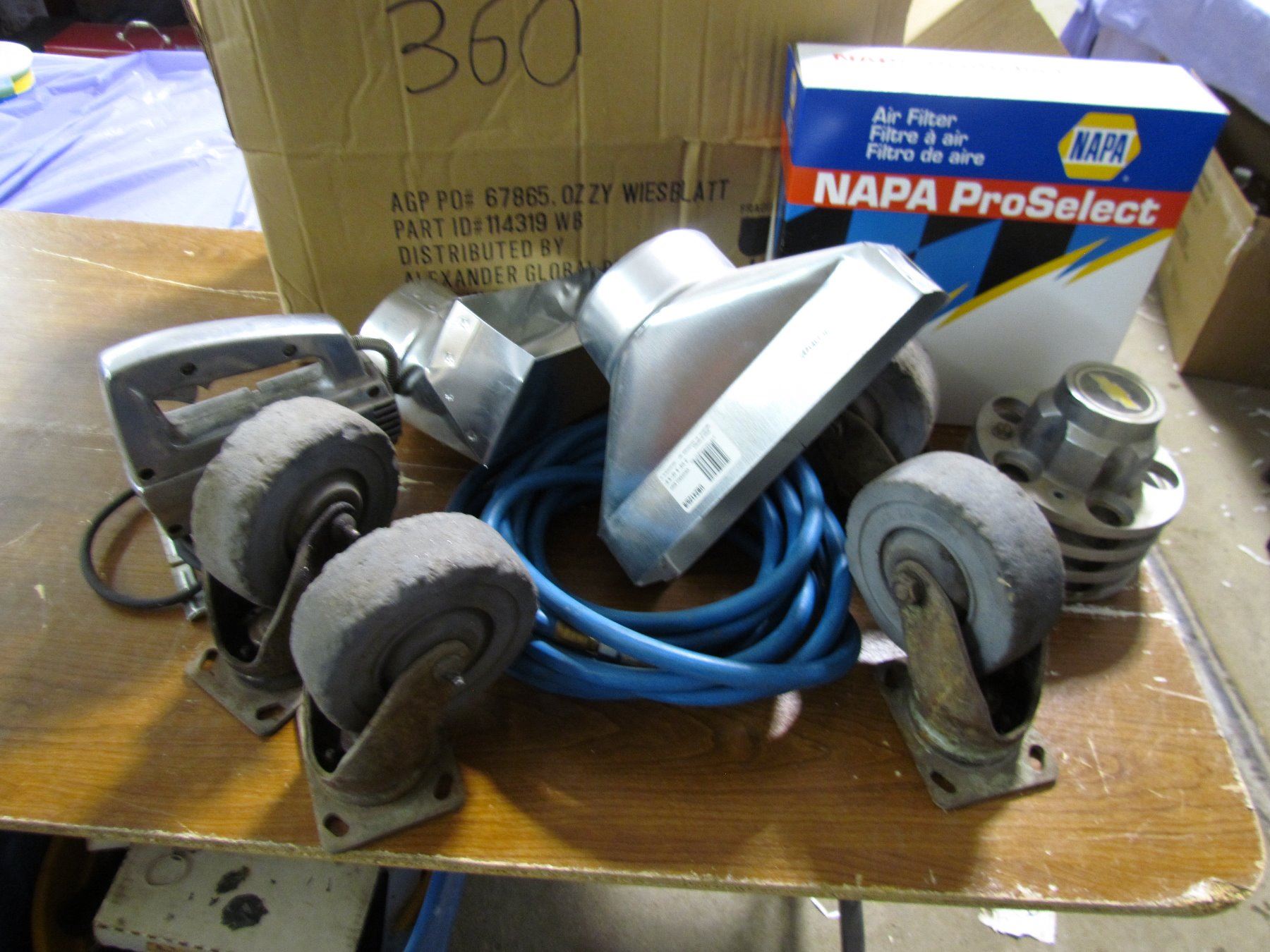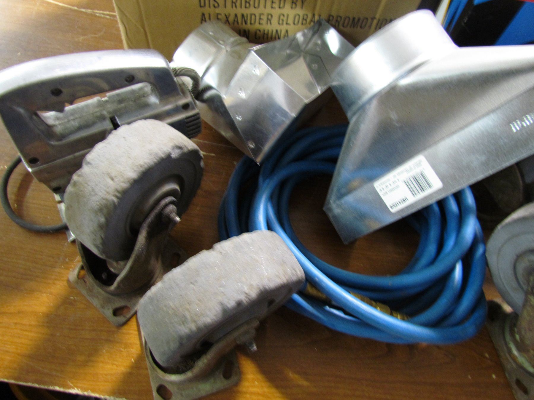 LOT INCLUDING, LARGE CASTERS, AIR HOSE, JIG SAW, DUCTING