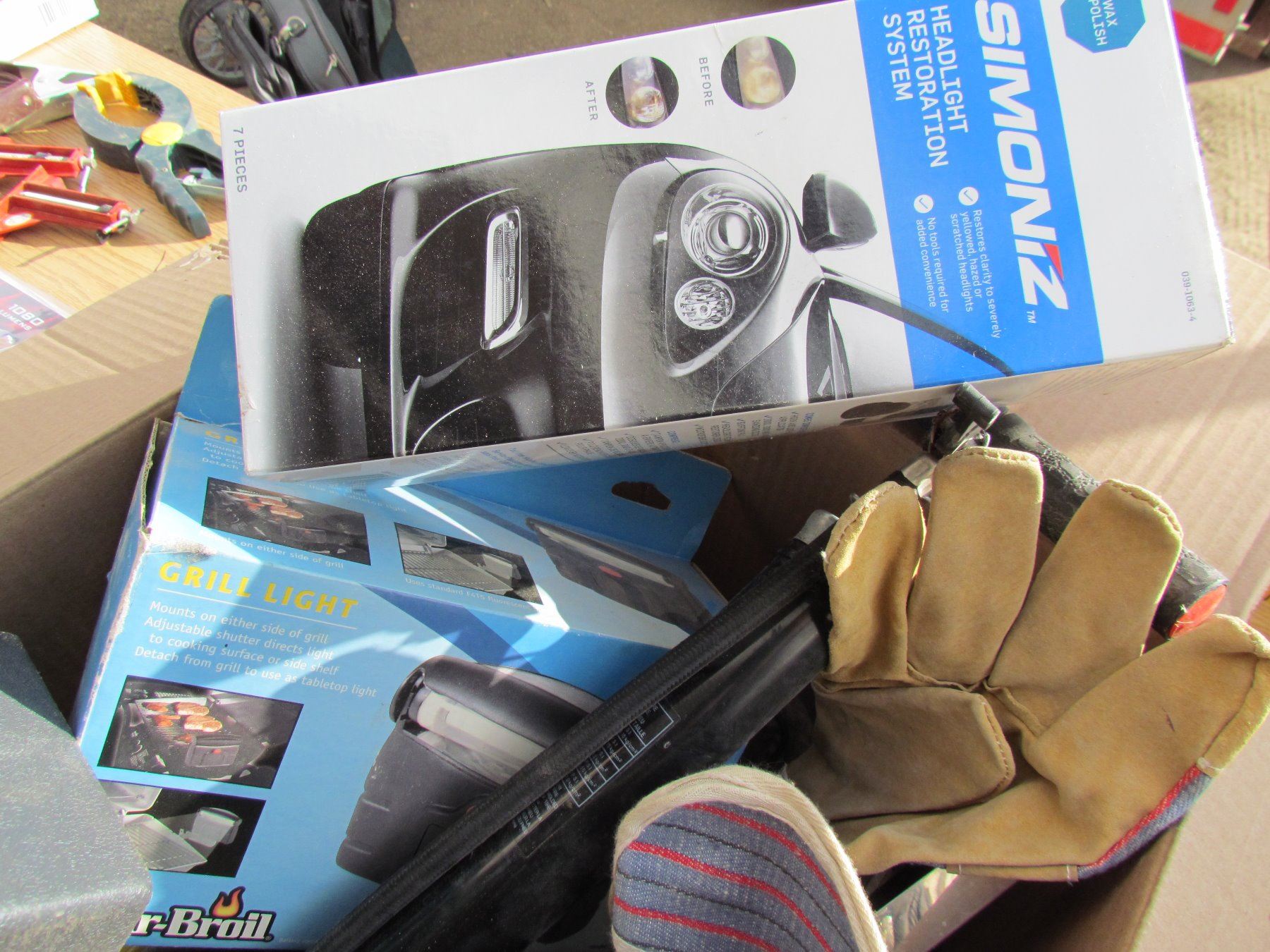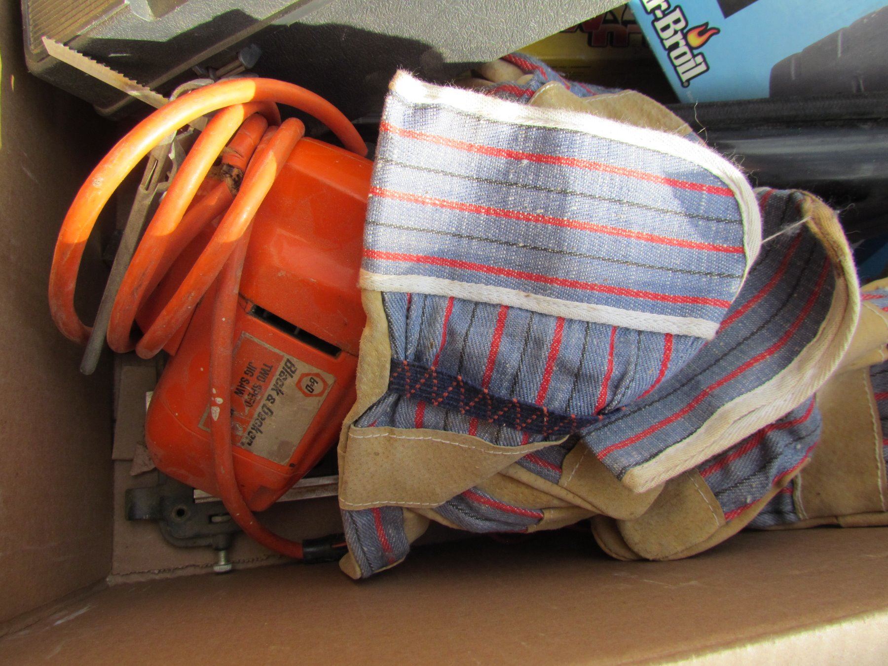 LOT INCLUDING TIRE PUMP, GRILL LIGHT, JIG SAW, AND GLOVES