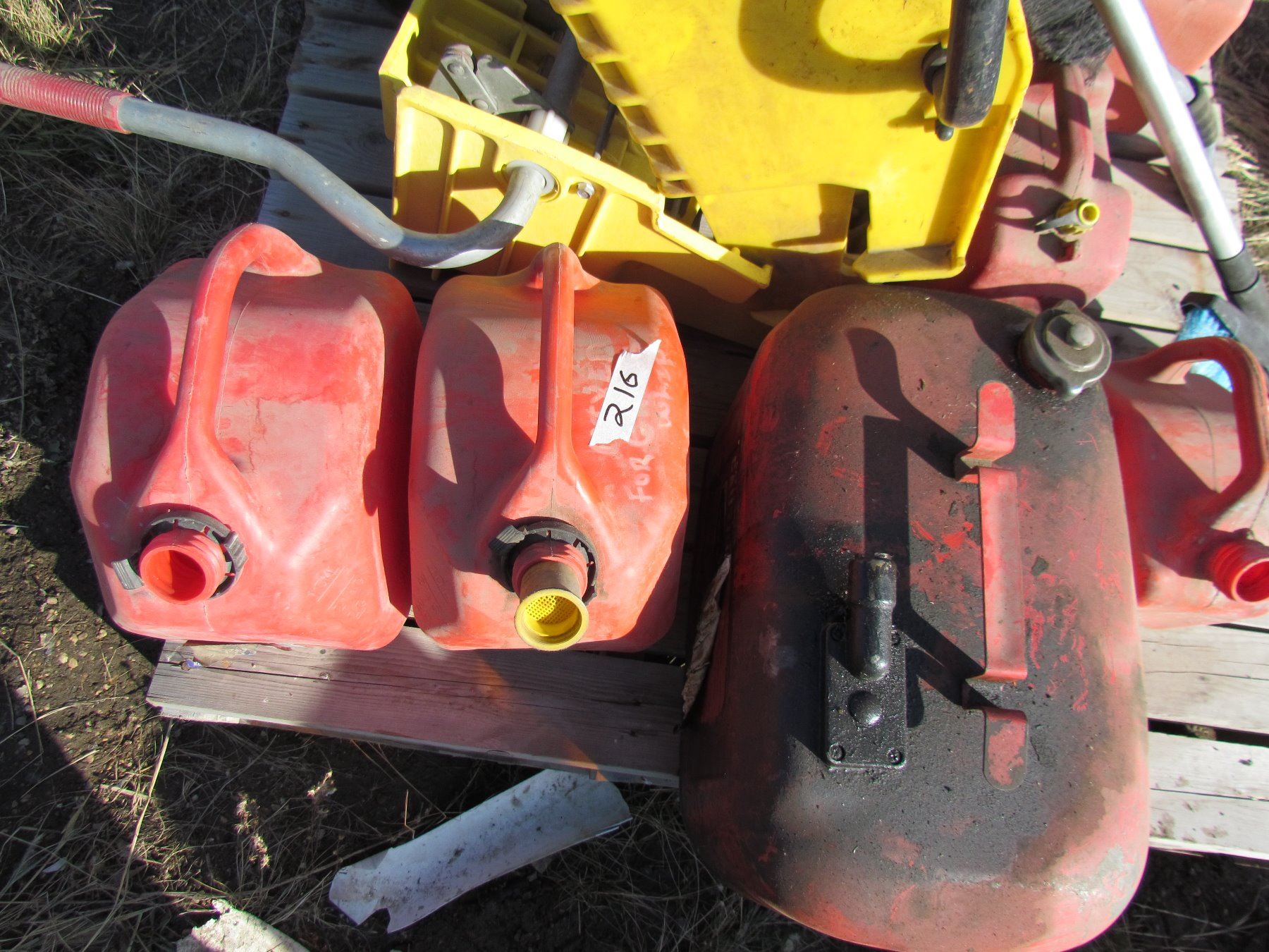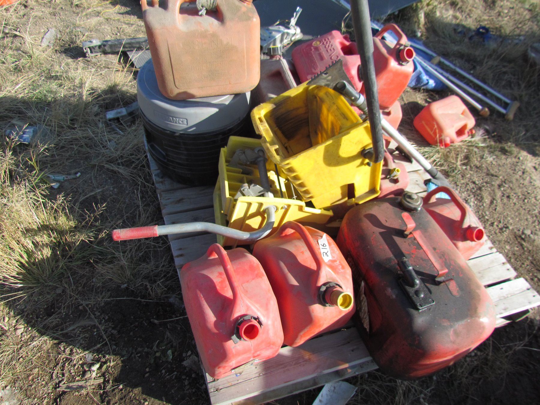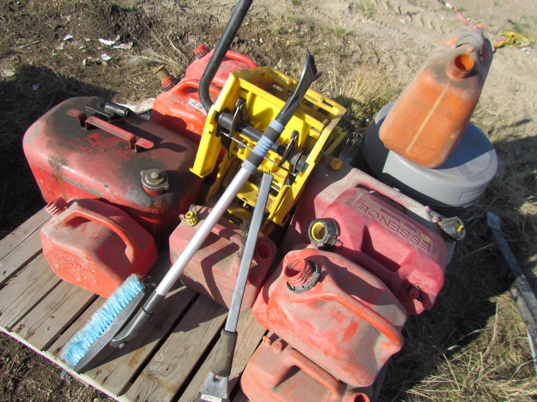 LOT OF 11 GAS CANS AND 2 MOP SQUEEGIES