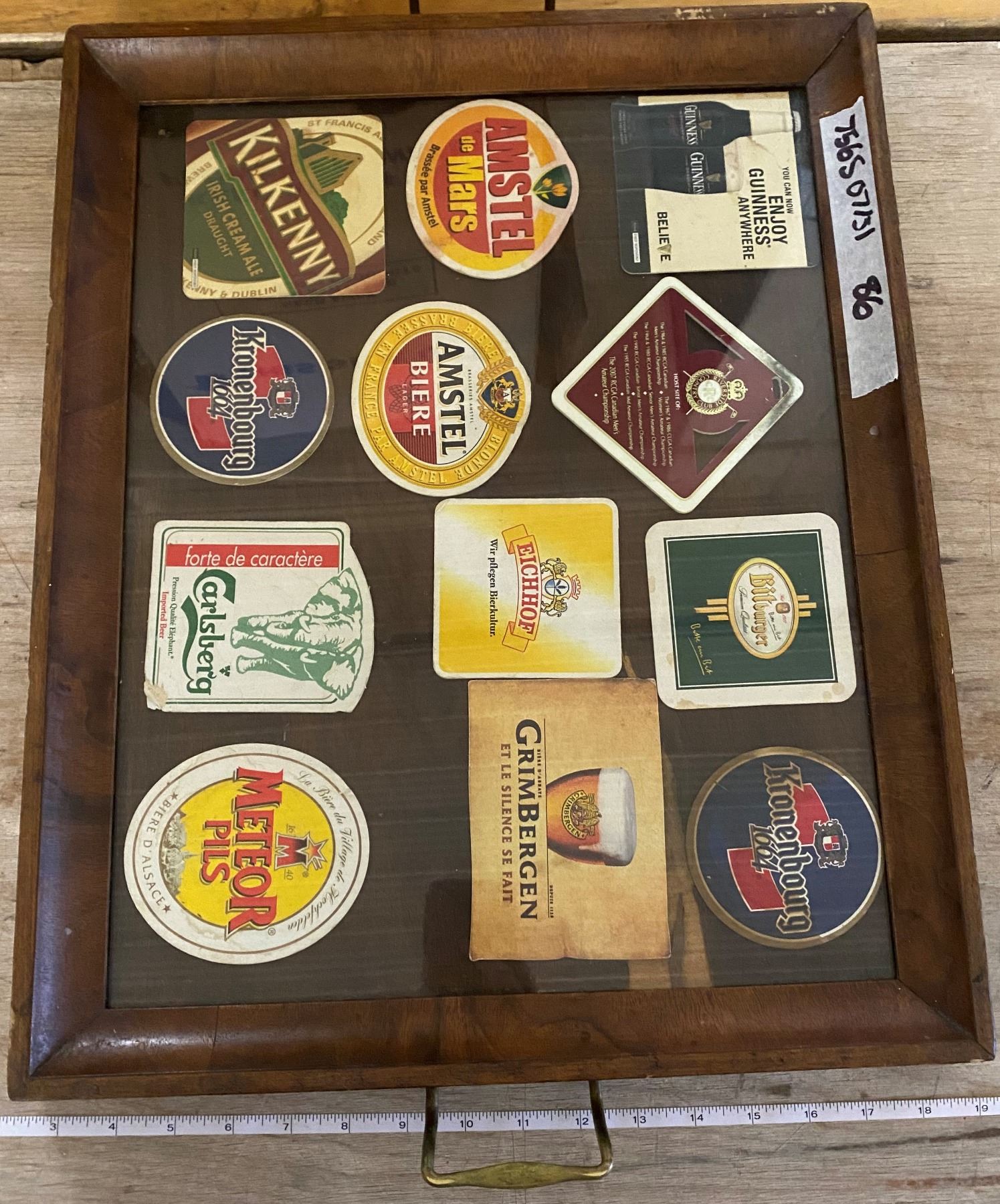 LOT OF 12 VINTAGE BEER COASTERS MOUNTED ON A VINTAGE TRAY