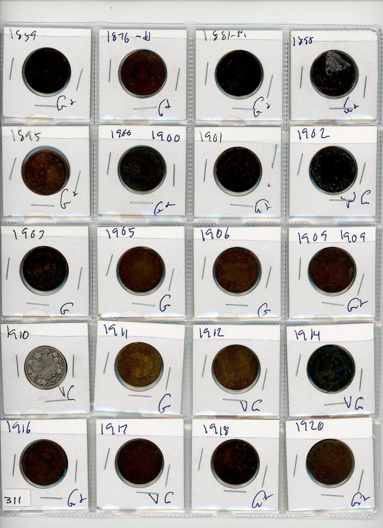 LOT OF 19 LARGE ONE CENT COINS AND 1-TWENTY FIVE CENT COIN (1 CENT COINS VARIOUS YEARS FROM 1859-1920---QUARTER IS 1910)