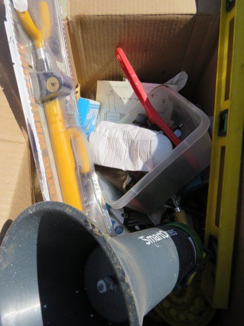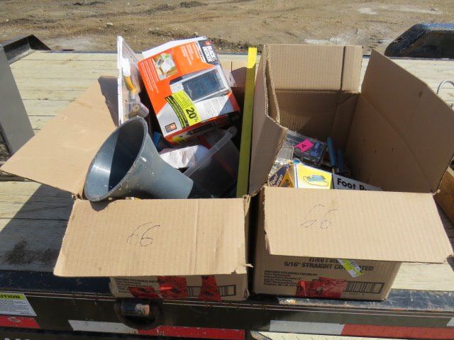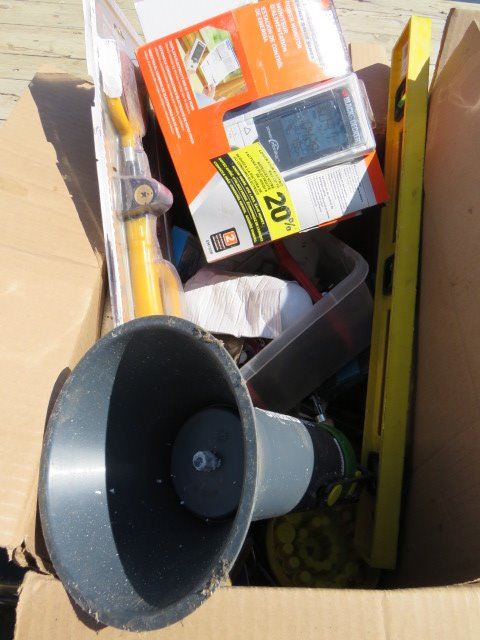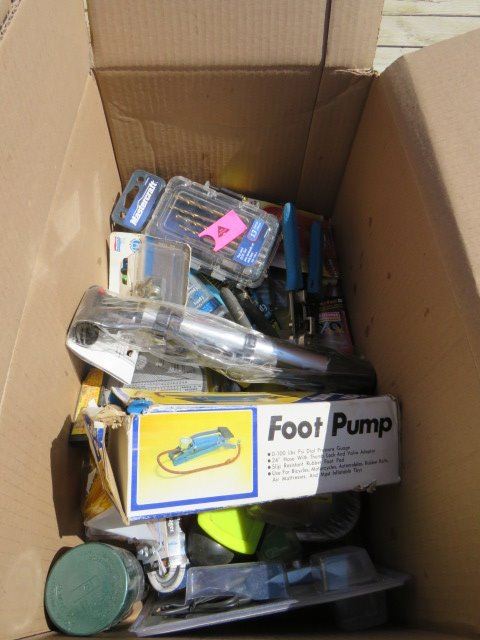 LOT OF 2 BOXES OF ASSORTED TOOLS AND ITEMS ( PLIERS, DRILL BITS, FOOT PUMP, POWER MONITOR, ETC…)
