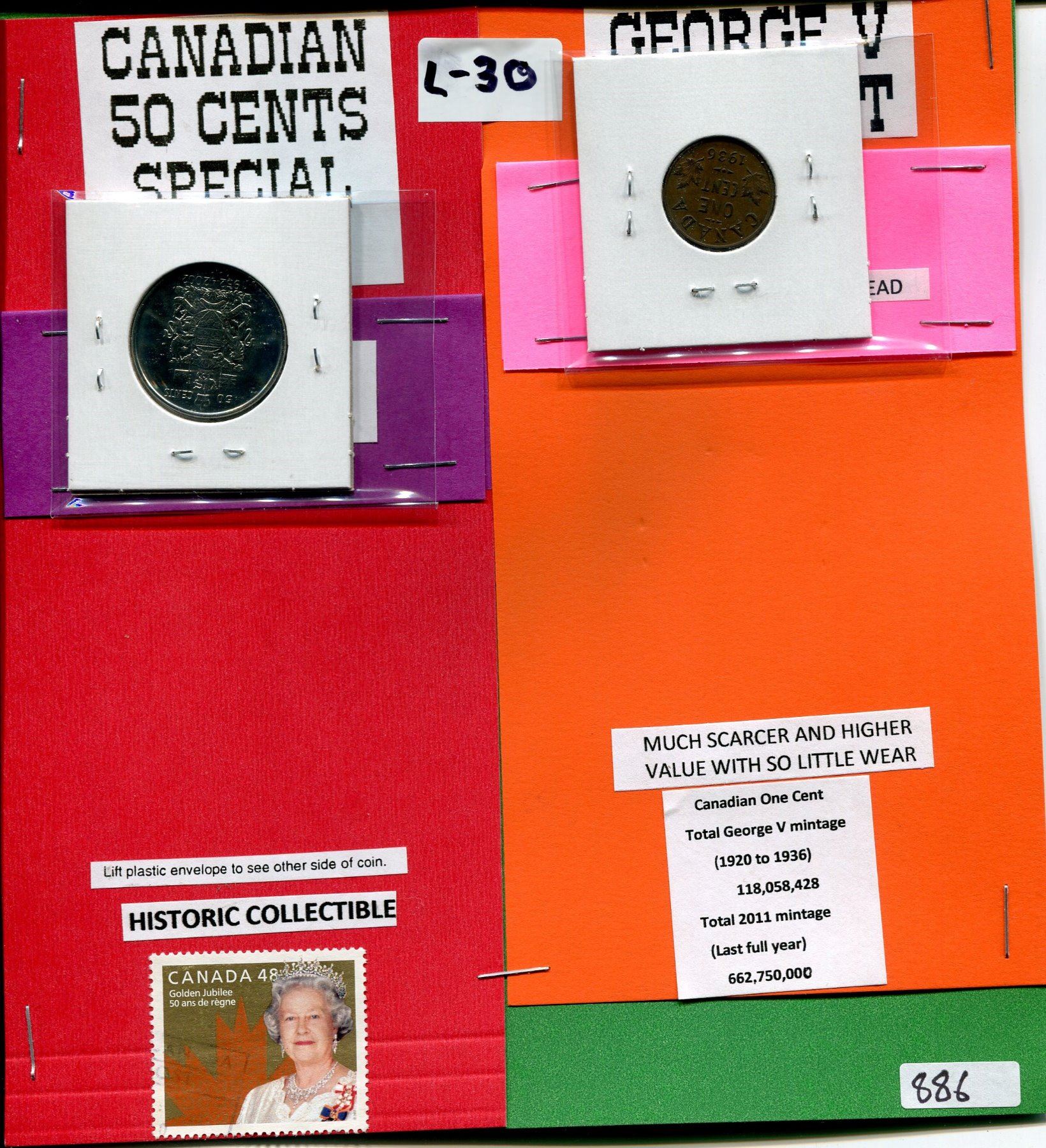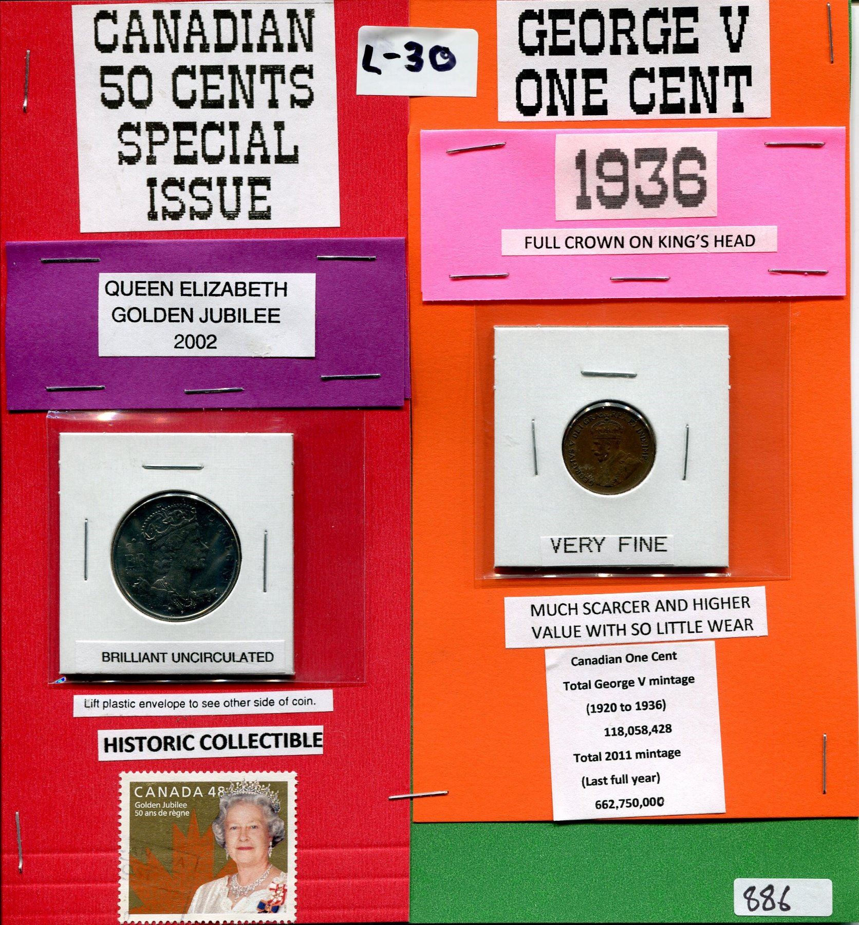LOT OF 2 COINS ( 2002 FIFTY CENT COIN, QUEEN ELIZABETH GOLDEN JUBILEE) *1936 GEORGE V ONE CENT COIN,