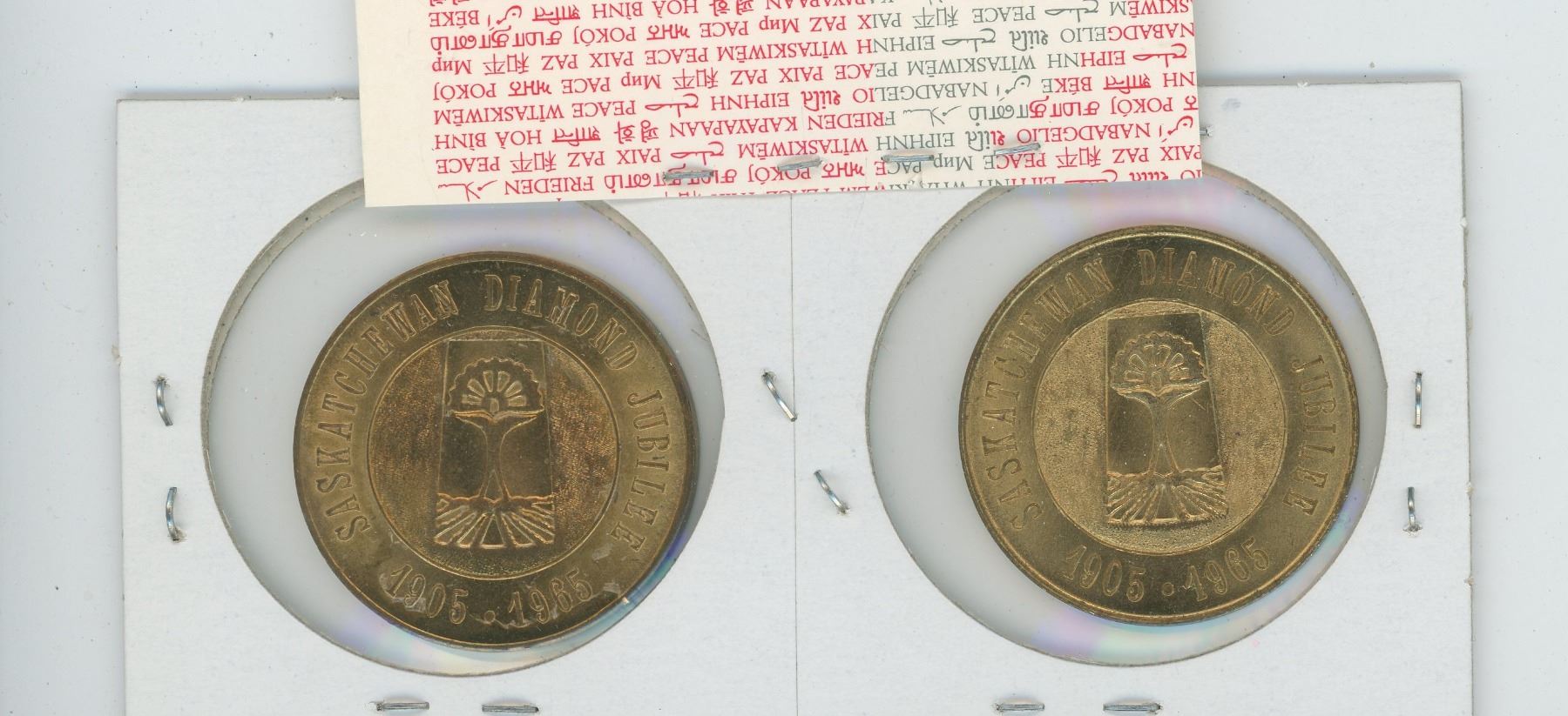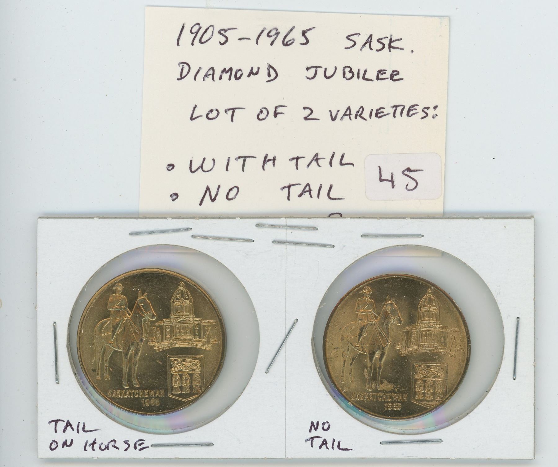 LOT OF 2 DIFFERENT 1905-1965 SASKATCHEWAN DIAMOND JUBILEE MEDALS. ONE HAS A TAIL ON THE MOUNTIE’S HORSE, THE OTHER HAS NO TAIL. BOTH UNC.