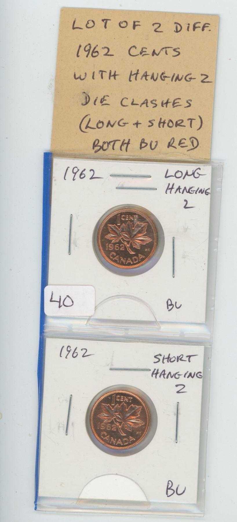 LOT OF 2 DIFFERENT 1962 CANADIAN CENTS WITH 2 DIFFERENT HANGING 2 VARIETIES: LONG HANGING 2 AND SHORT HANGING 2. BOTH THE RESULT OF DIFFERENT DIE CLASHES. BOTH BU RED.