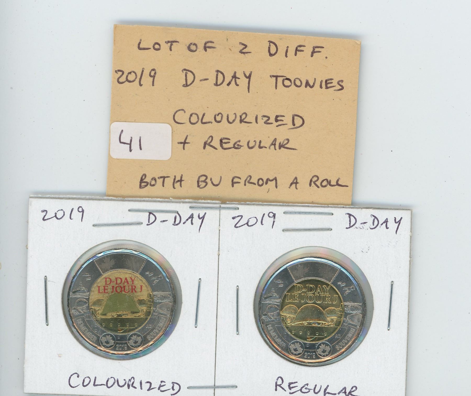 LOT OF 2 DIFFERENT 2019 D-DAY TOONIES: COLOURIZED AND REGULAR. BOTH BU FROM A NEW ROLL.