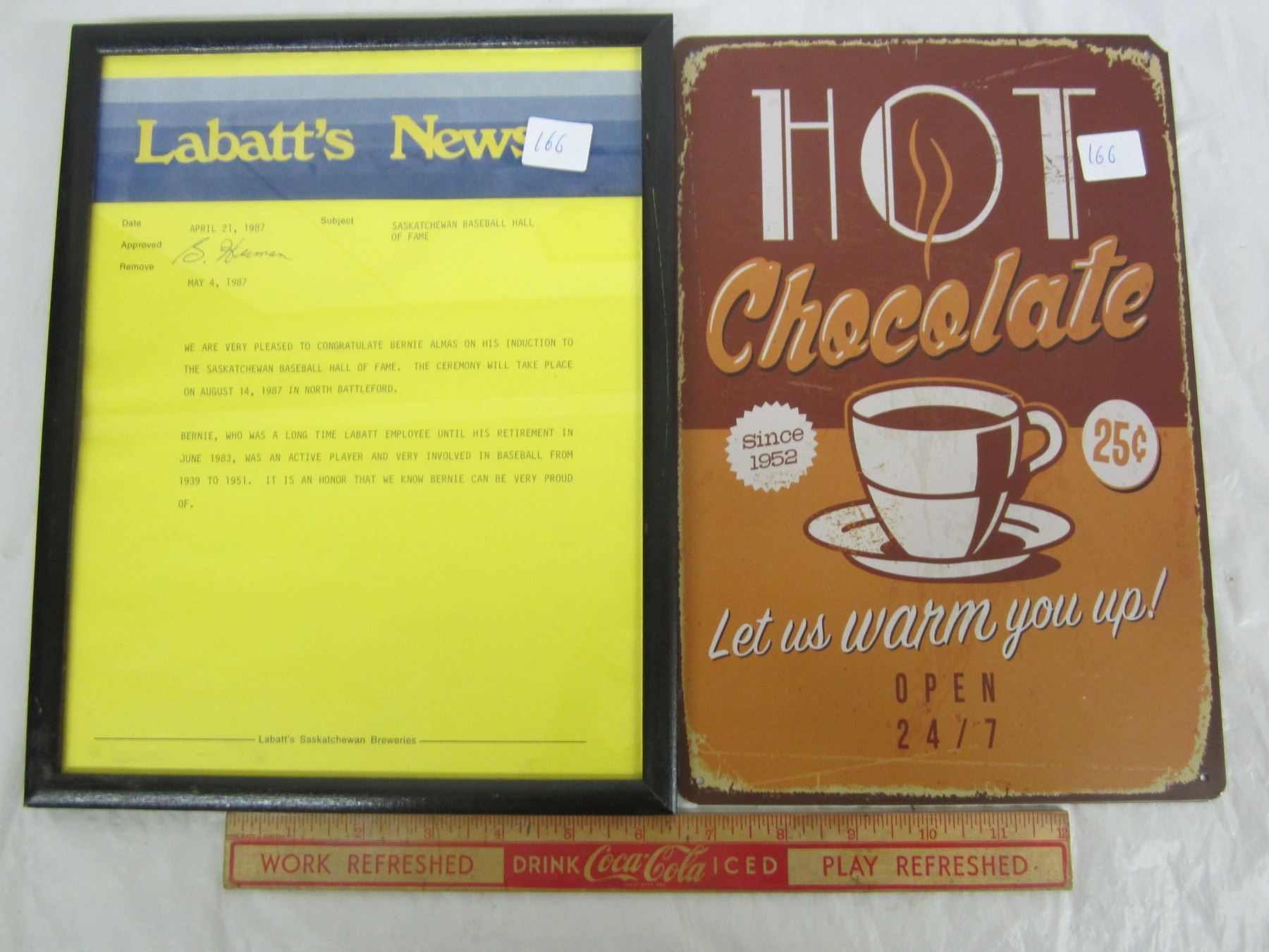 LOT OF 2 ITEMS LABATT'S NEWS AND TIN HOT CHOCOLATE SIGN