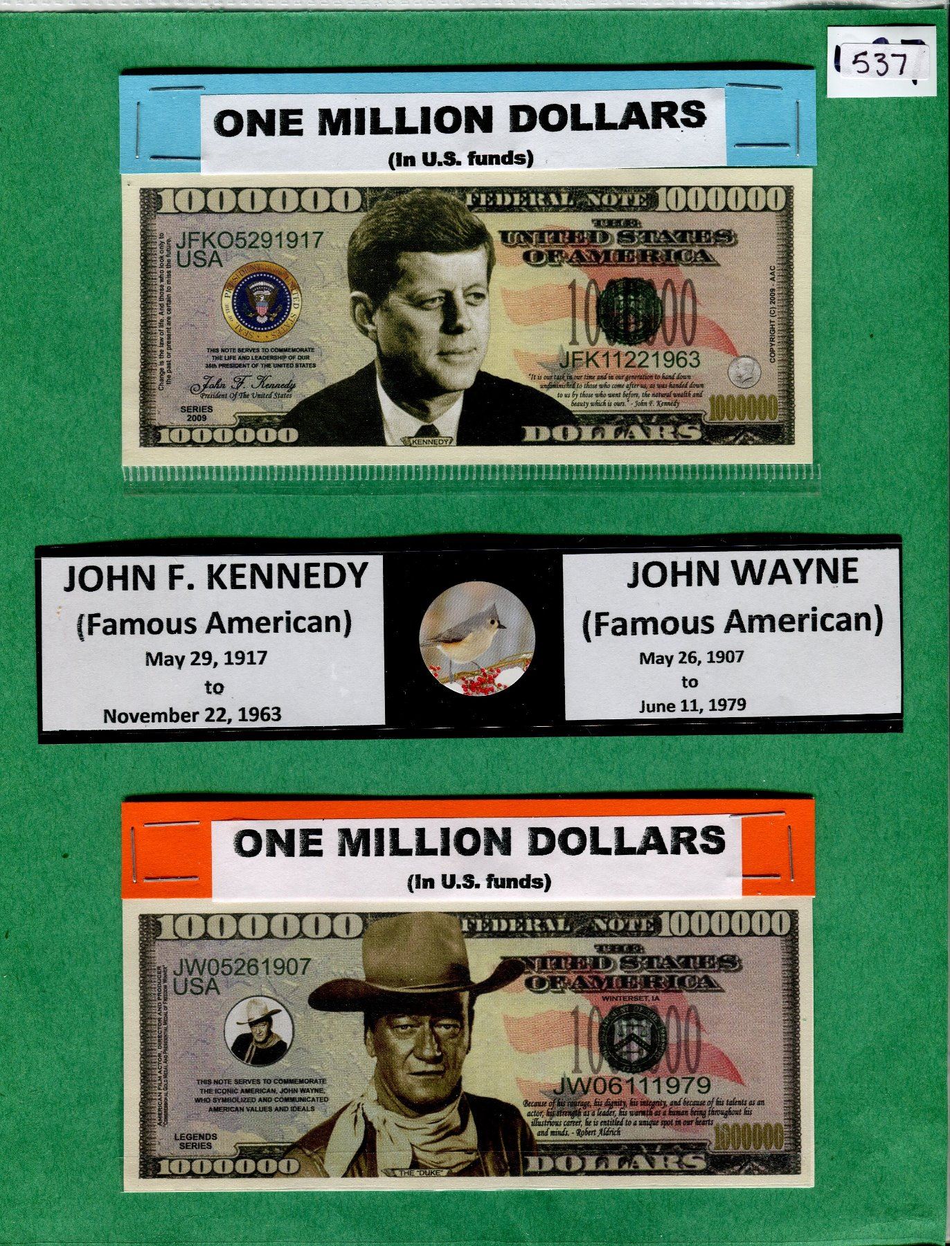 LOT OF 2 NOVELTY ONE MILLION DOLLAR BILLS ( JOHN WAYNE, JOHN F. KENNEDY)