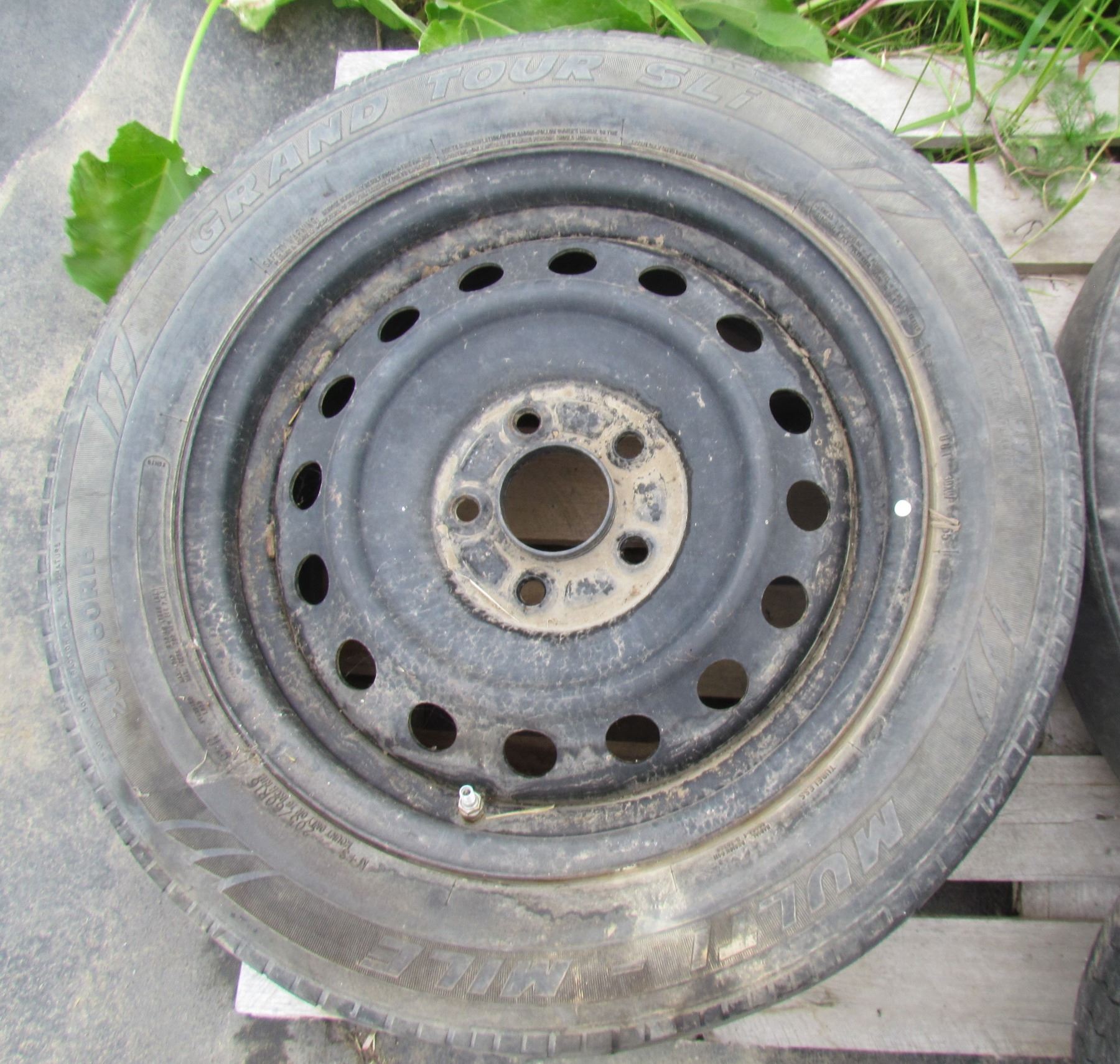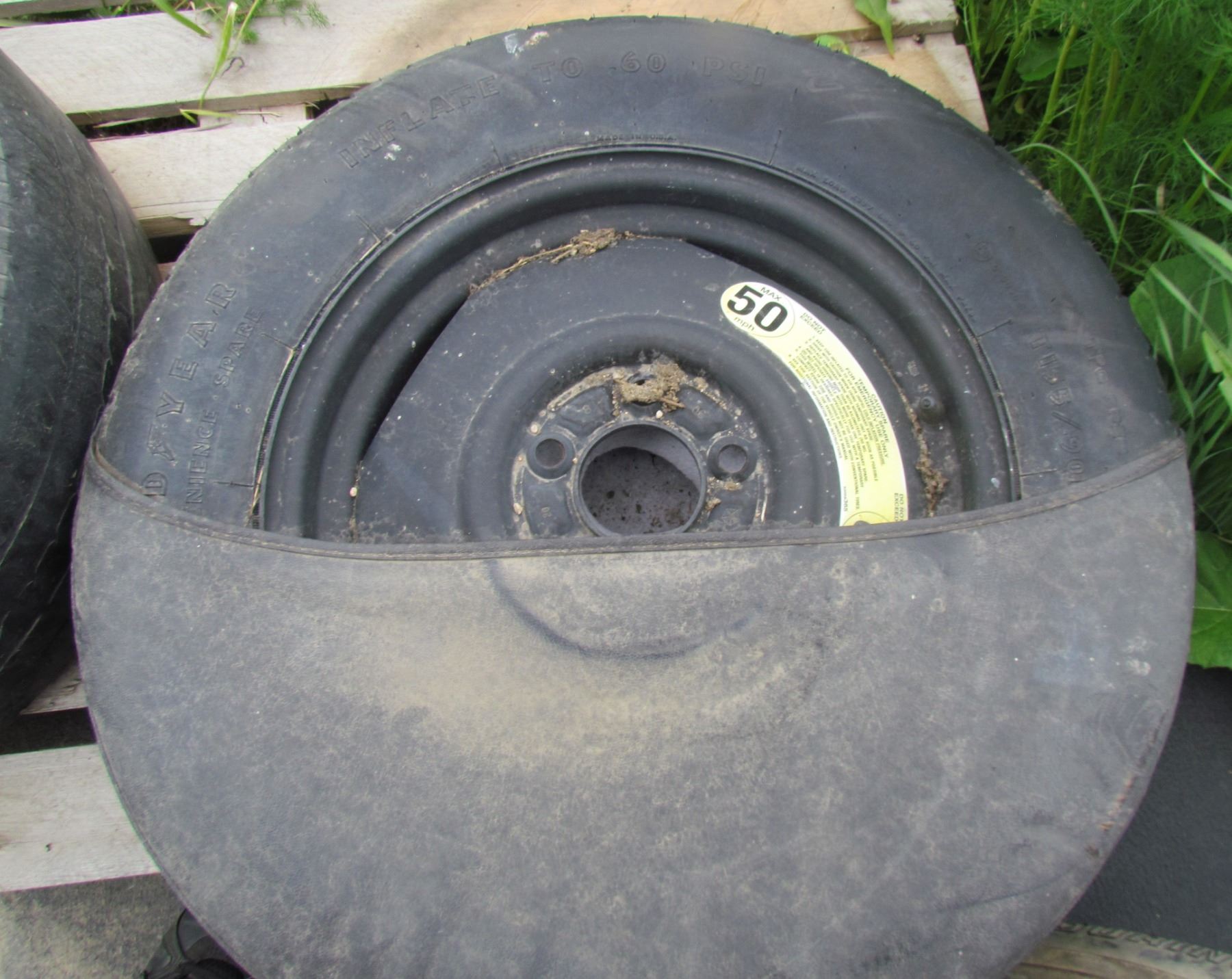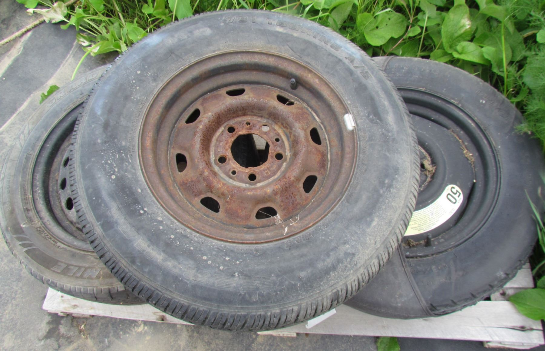 LOT OF 2 PALLETS OF MISC ITEMS (2 X 16" TIRES) * 1 X DONUT 14" WITH COVER* (SHOVEL, FLASHLIGHT, JUMPER CABLES, ETC)