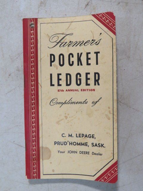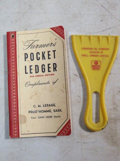 LOT OF 2 WINDOW SCRAPER (WHITE ROSE) & FARMER'S POCKET LEDGER (C.M. LEPAGE, PRUD'HOMME, SK)