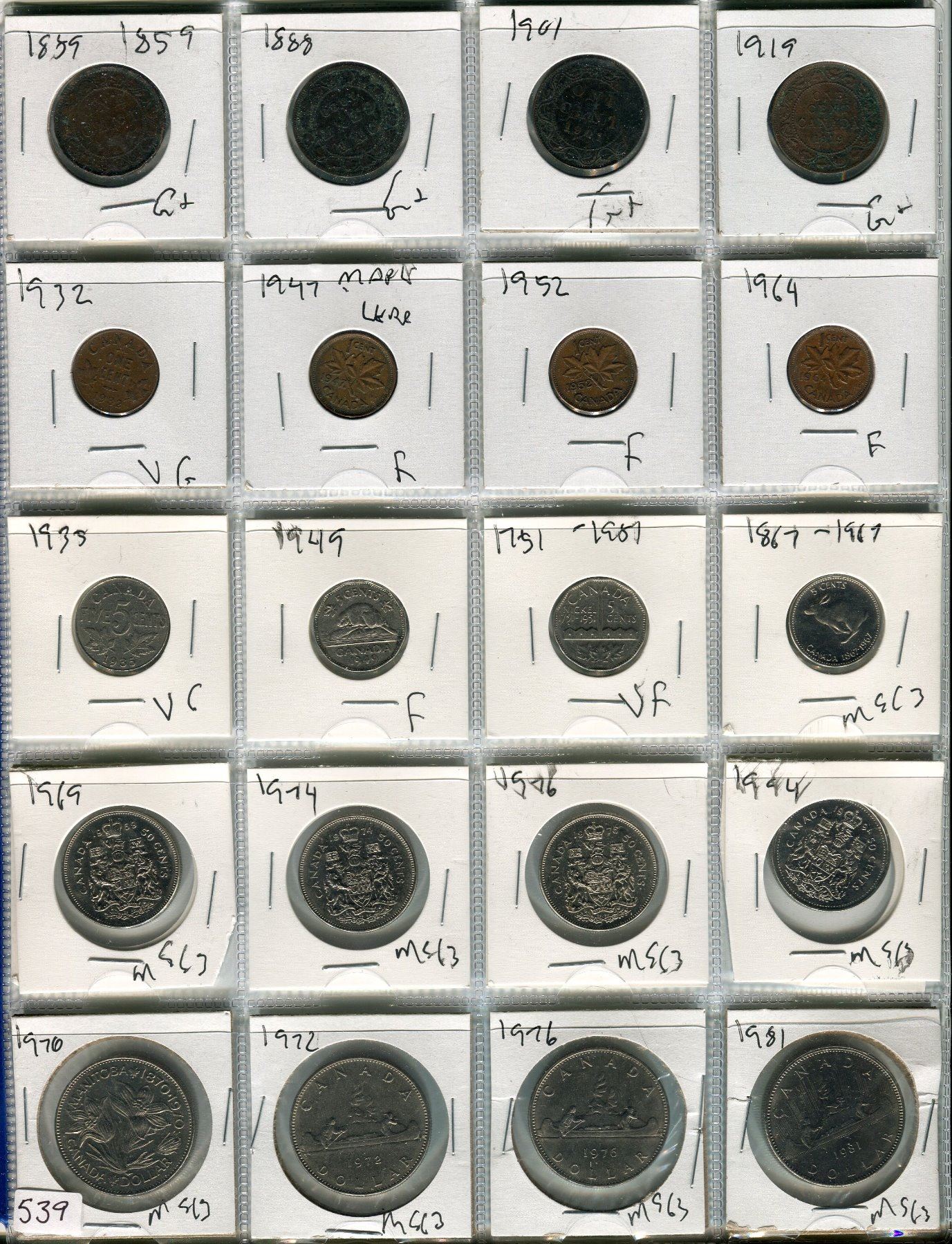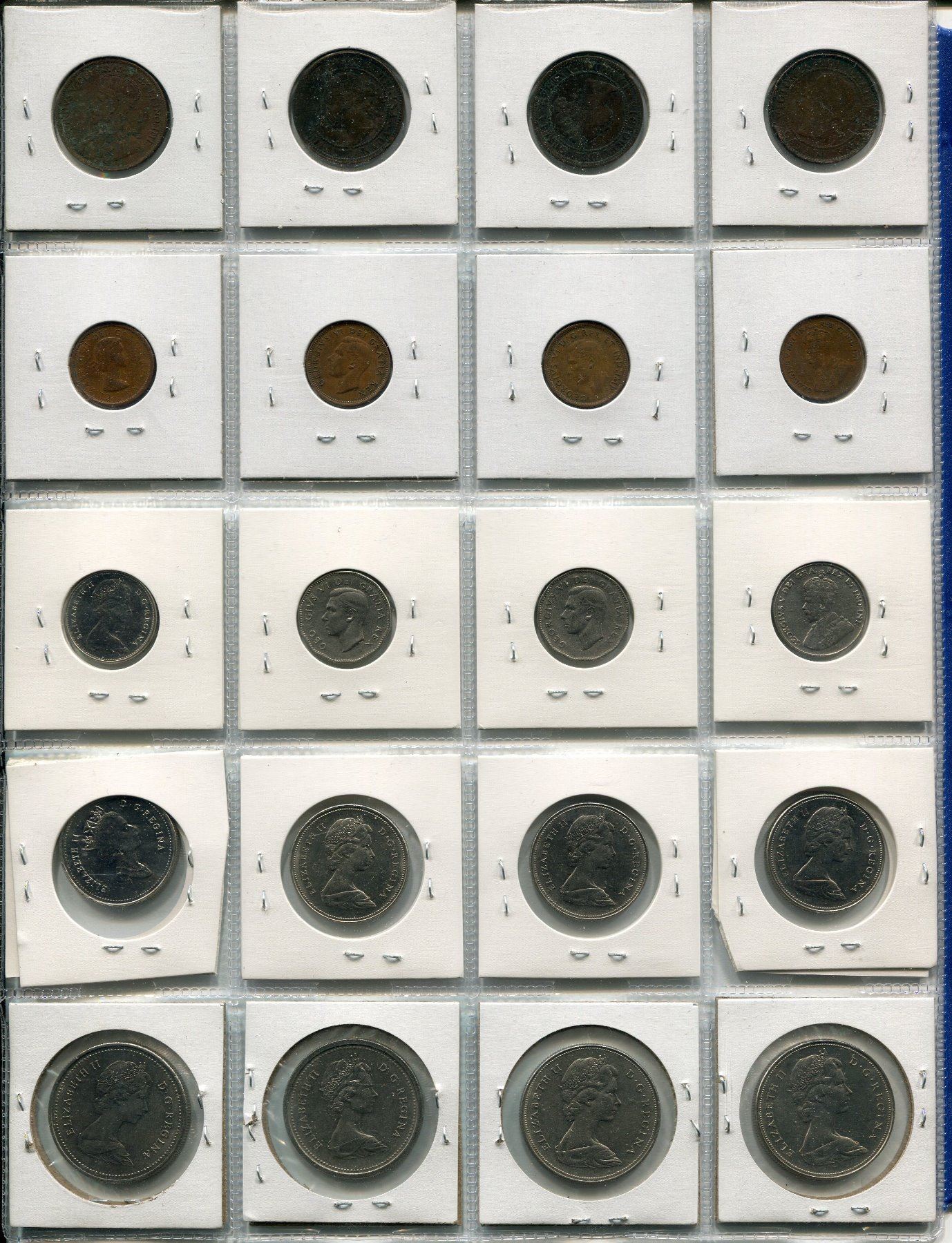 LOT OF 20 ASSORTED CANADIAN COINS (4 LARGE PENNIES 1959-1919, 4 SMALL PENNIES 1932-64, 4 NICKLES 1935-1967, 4 FIFTY CENT COINTS 1969-94, 4 DOLLAR COINS 1970-81)