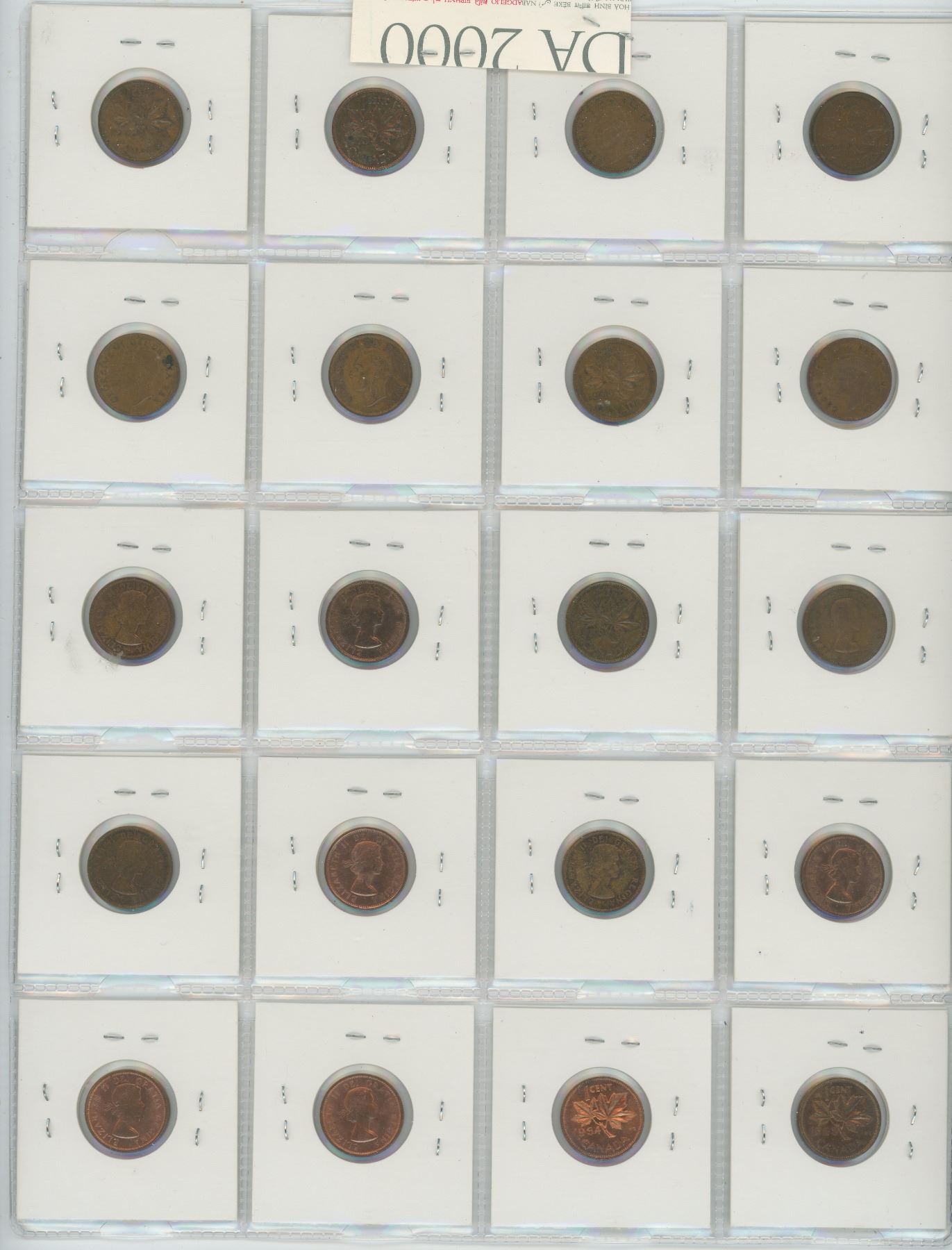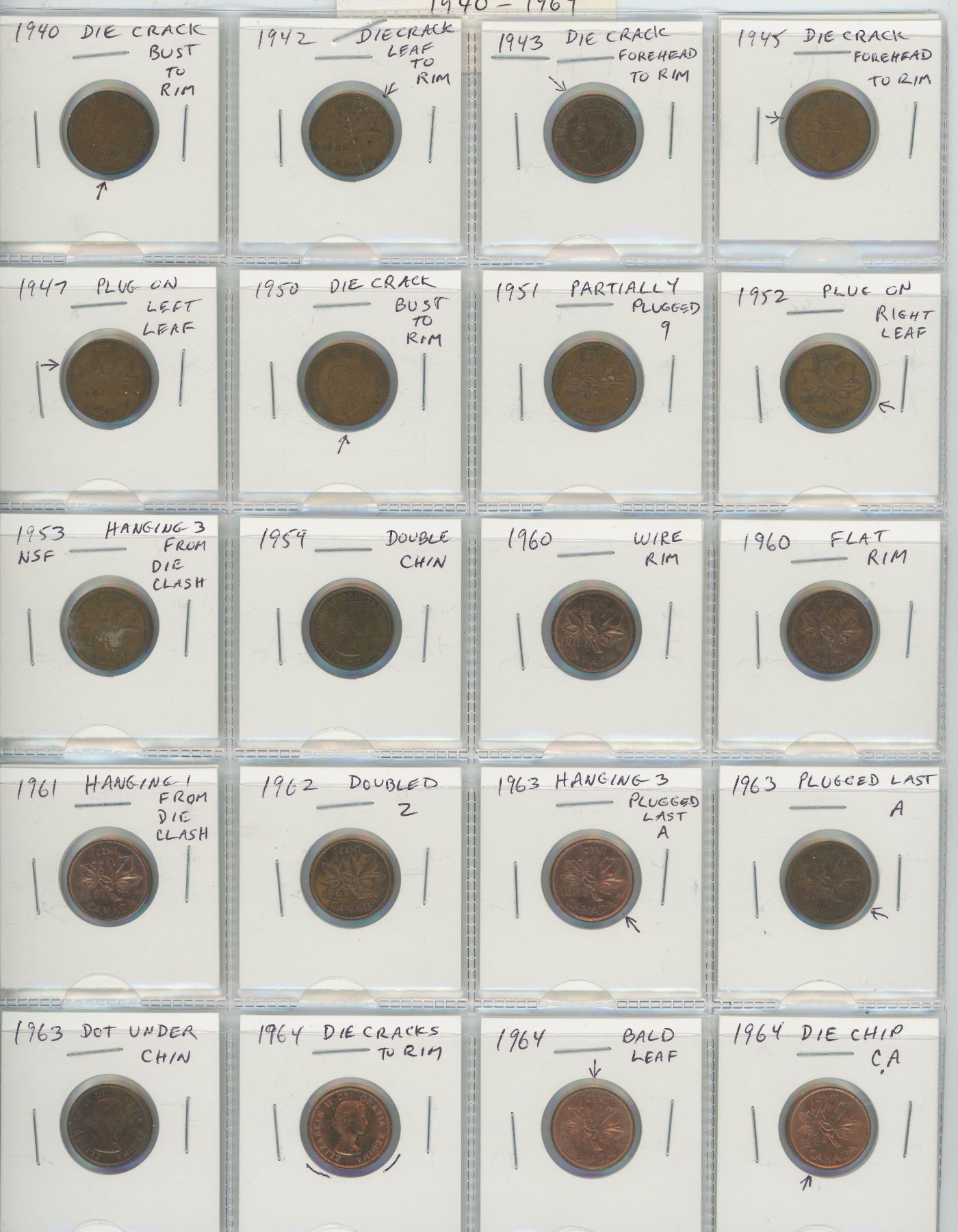 LOT OF 20 DIFFERENT CANADIAN SMALL CENTS VARIETIES: 1940 TO 1964. INCLUDES DIE CRACKS, PLUGS, PARTIAL PLUGS, DIE CLASHES, DOUBLE CHINS, WIRE & FLAT RIMS, DOUBLING, DOT, BALDING AND DIE CHIP. COINS GRADE VF TO BU RED.