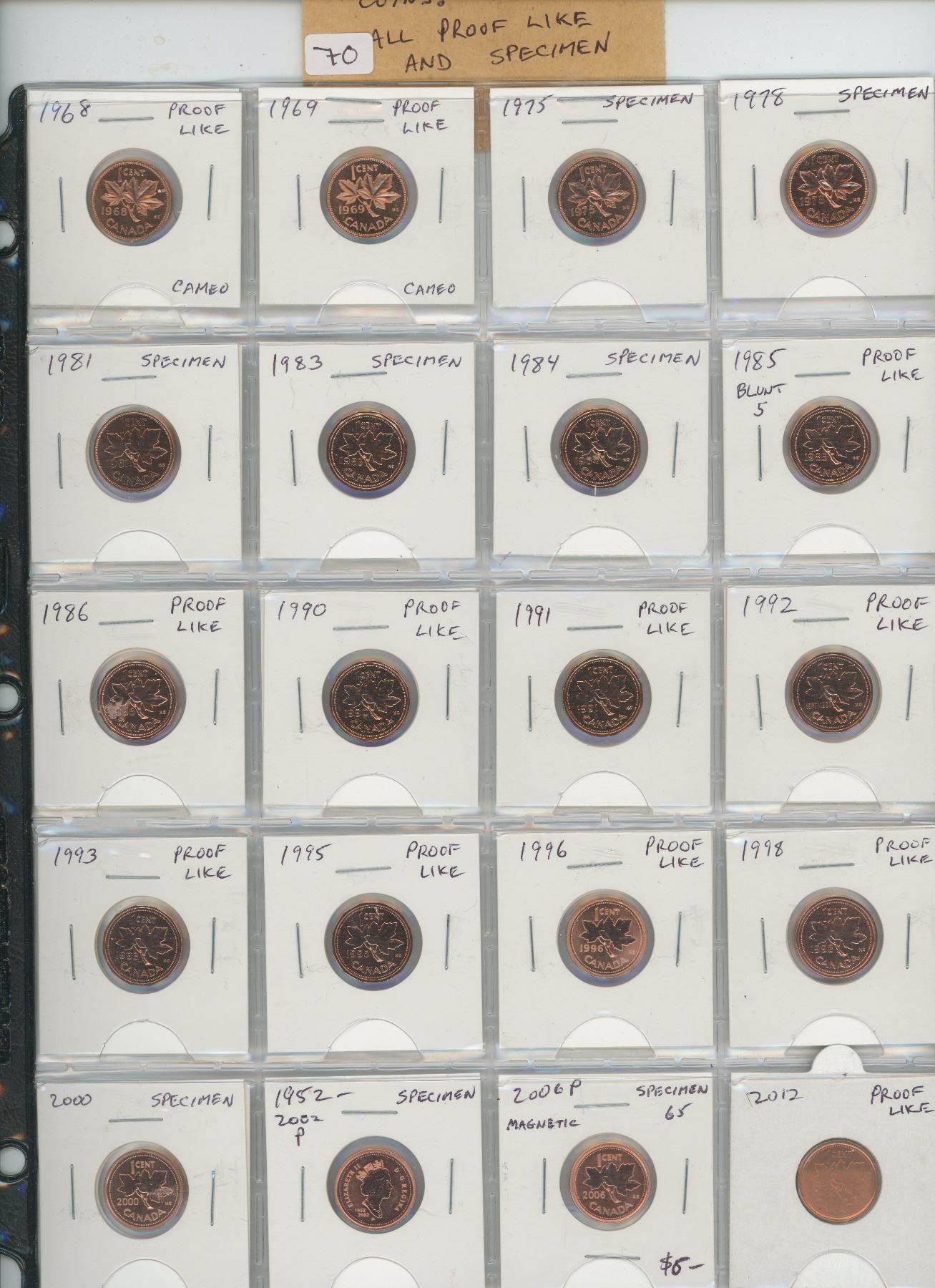 LOT OF 20 DIFFERENT COLLECTOR CENTS 1968 – 2012. INCLUDES 1968, 1969, 1975, 1978, 1981, 1983, 1984, 1985 BLUNT 5, 1986, 1990, 1991, 1992, 1993, 1995, 1996, 1998, 2000, 2002P, 2006P MAGNETIC & 2012. ALL COINS PROOF LIKE OR SPECIMEN.