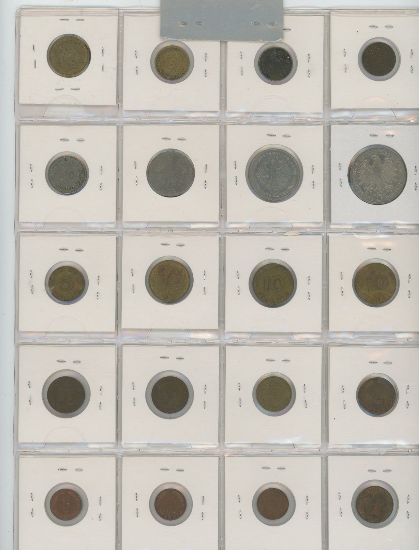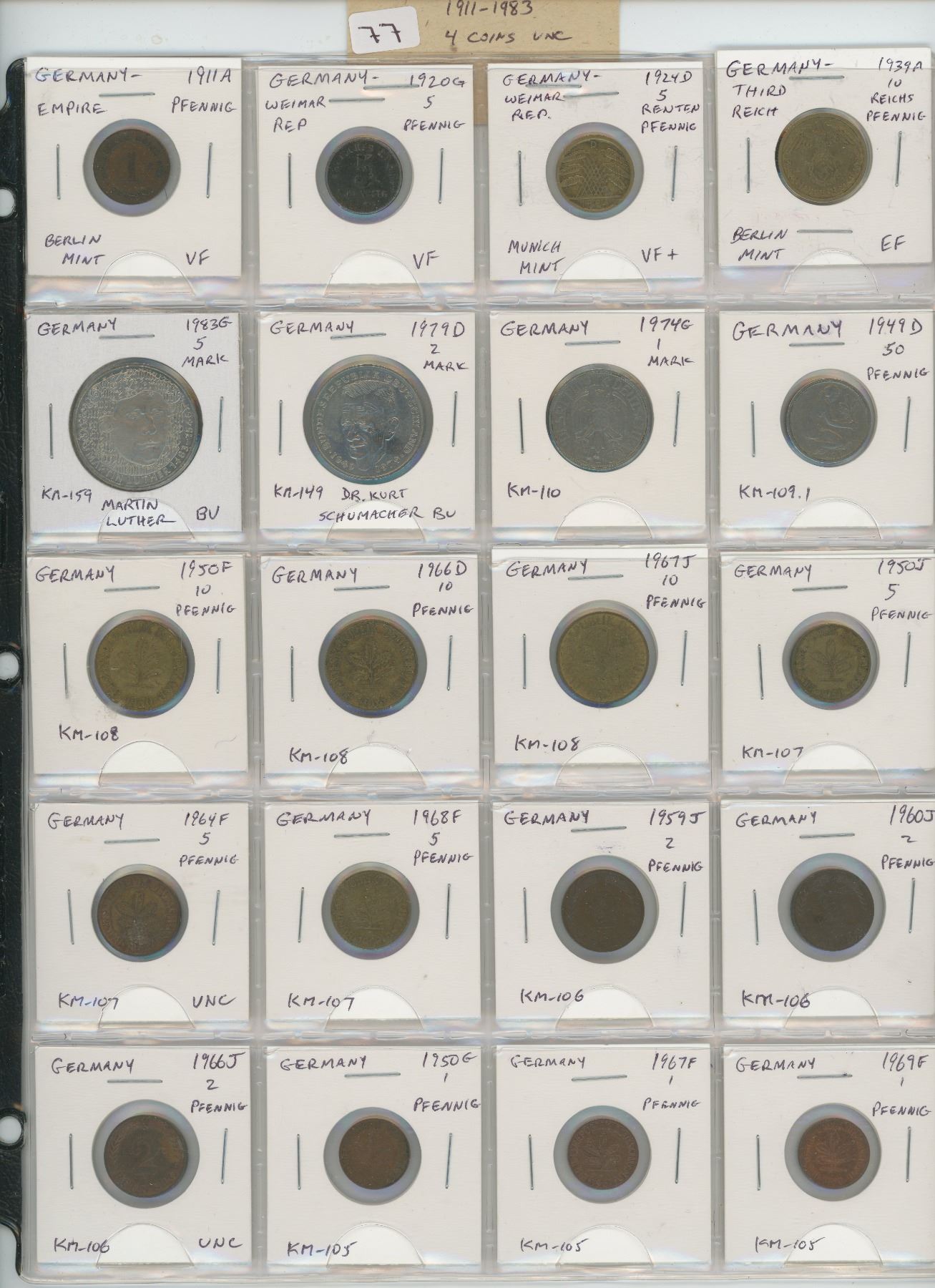 LOT OF 20 DIFFERENT GERMAN EMPIRE, WEIMAR REPUBLIC, THIRD REICH AND FEDERAL REPUBLIC COINS. INCLUDES MARTIN LUTHER 5 MARK AND DR. KURT SCHUMACHER 2 MARK, BOTH BU.